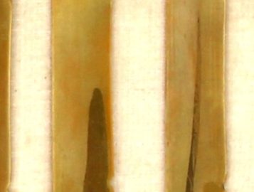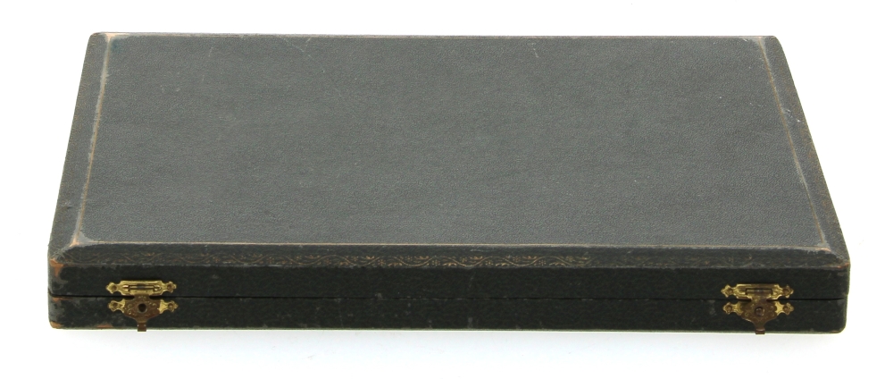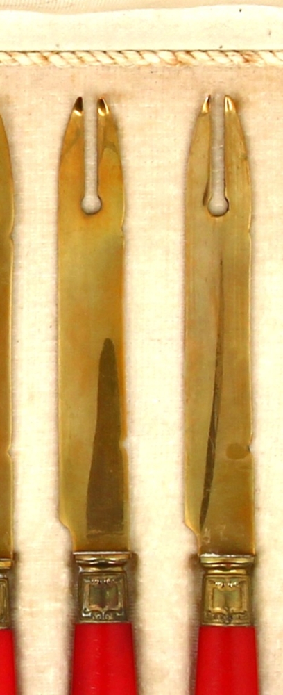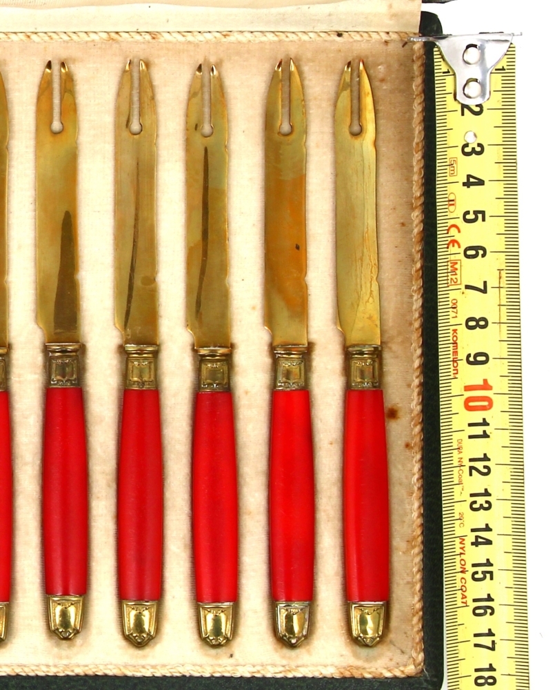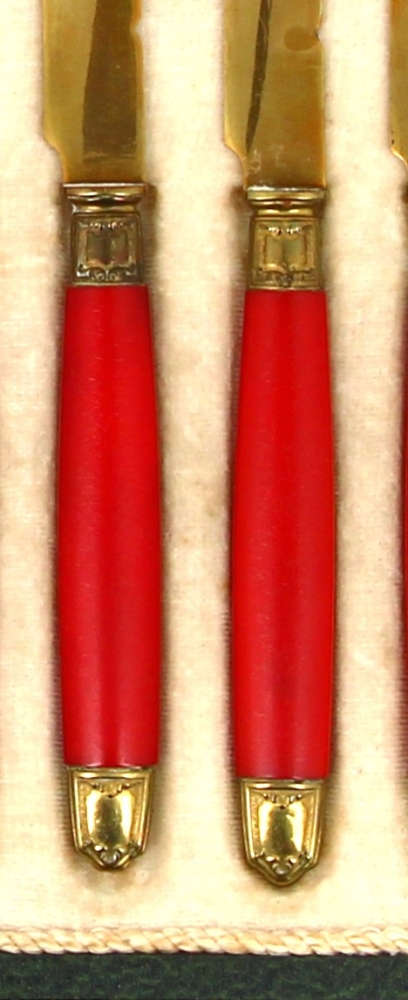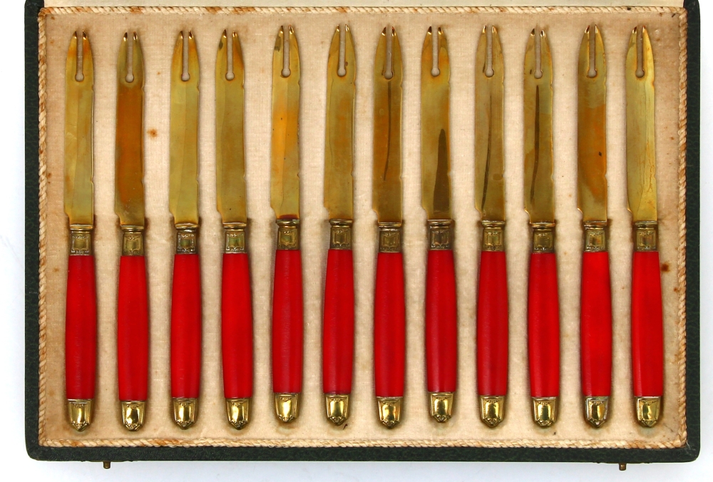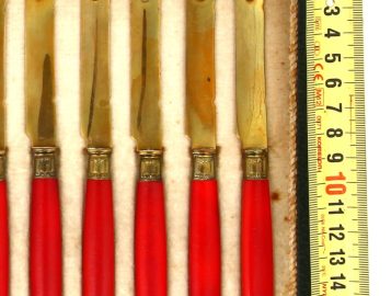 12 couteaux à melon en métal doré et bakélite rouge (en écrin ; fente sur un manche)