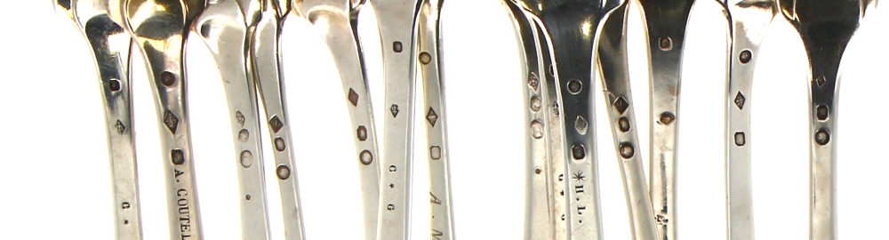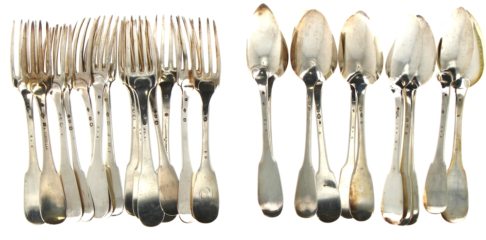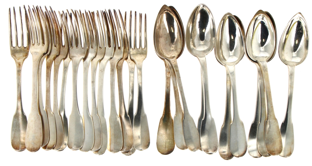 14 fourchettes et 11 cuiillères de table en argent, modèle uniplat, poinçons Vieillard, minerve, et coq. Poids 1802,50 grs