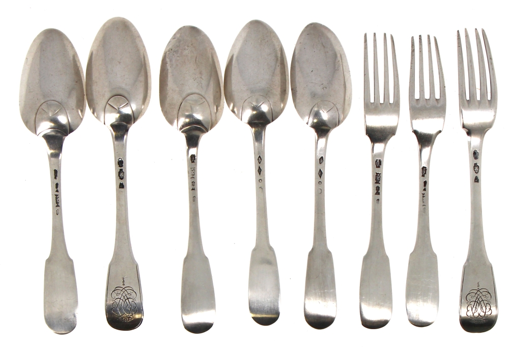 5 cuillères et 3 fourchettes en argent, XVIIIème et XIXème dont un couvert. Poids 598,50 grs