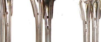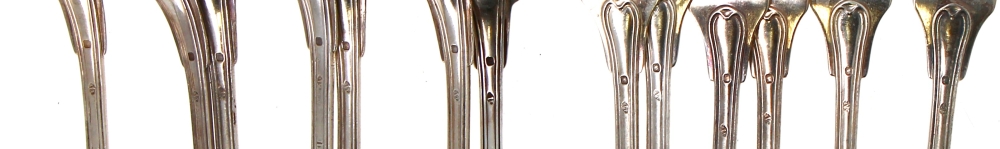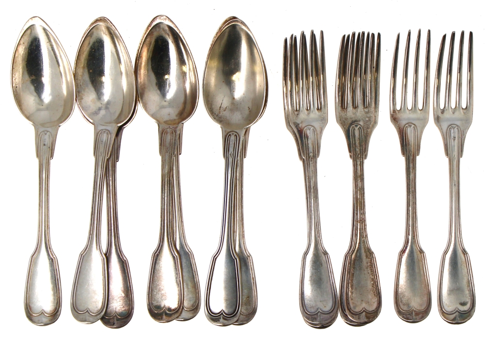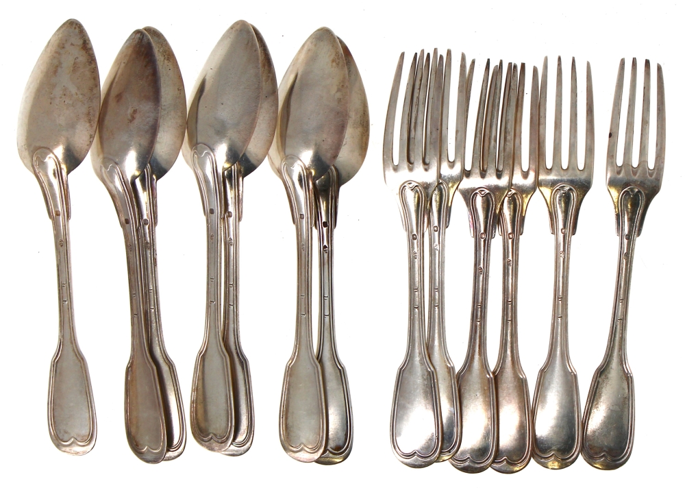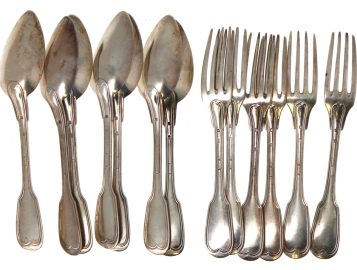 6 fourchettes et 7 cuillères de table en argent, poinçon minerve, modèle filet. Poids 1071,20 grs