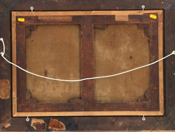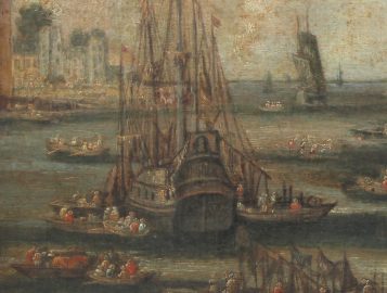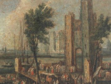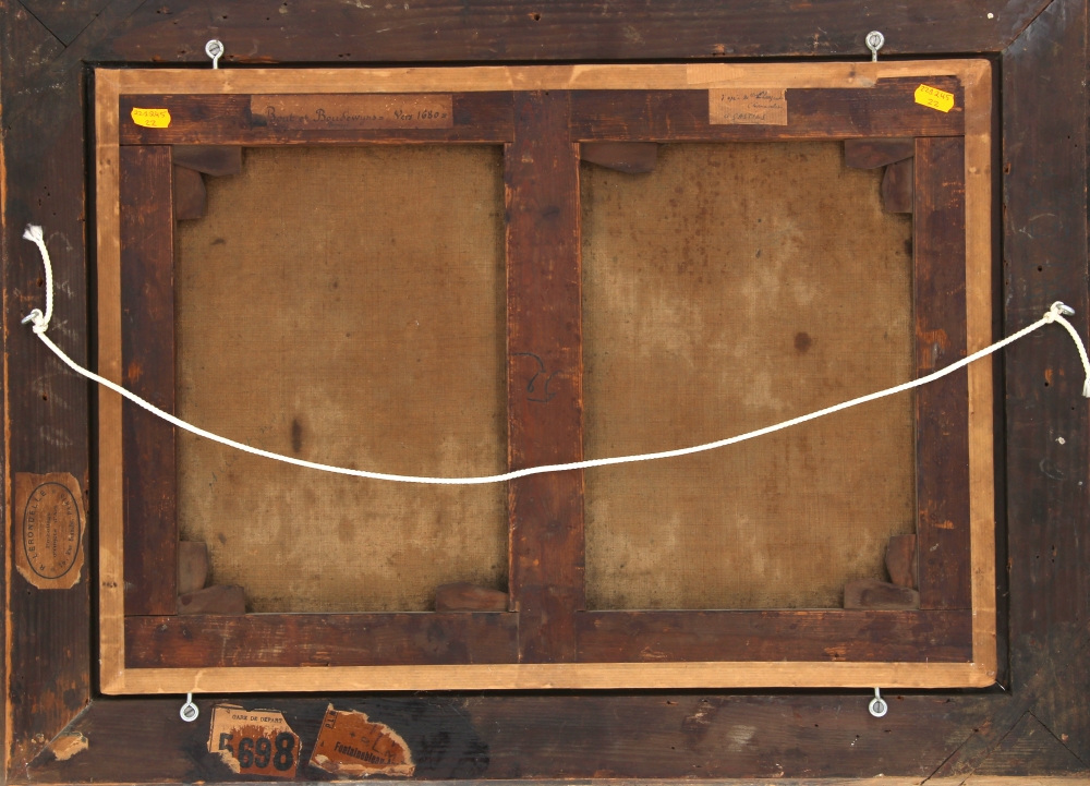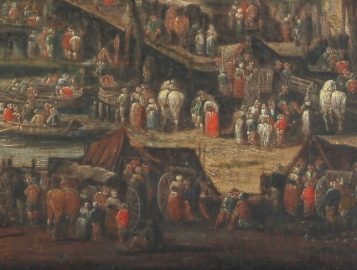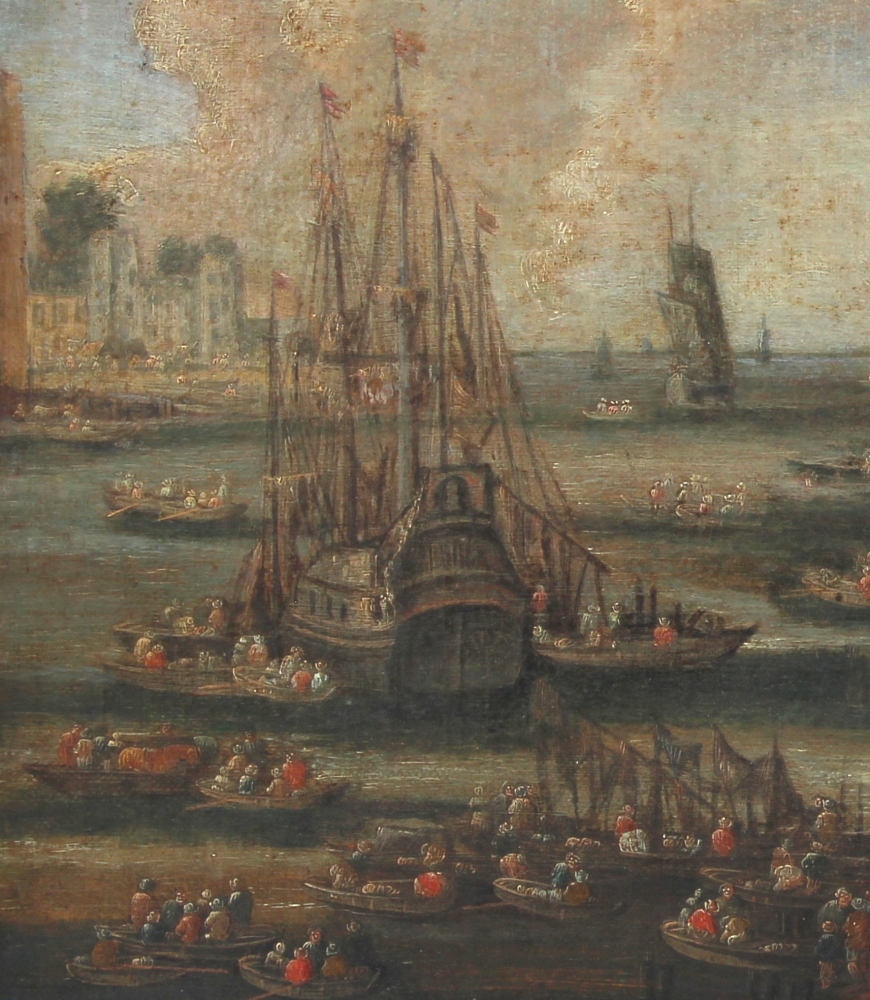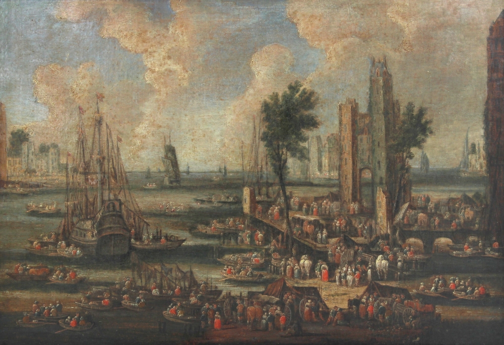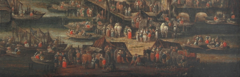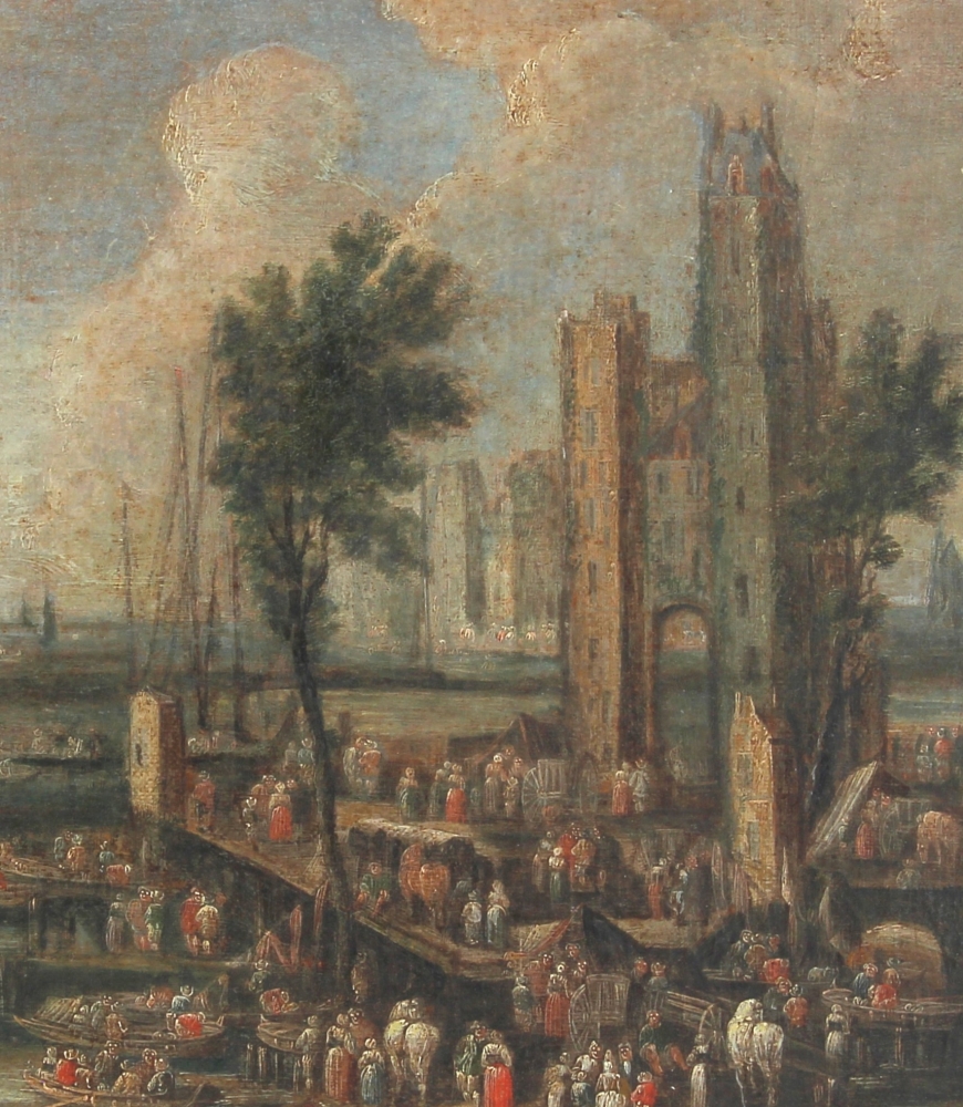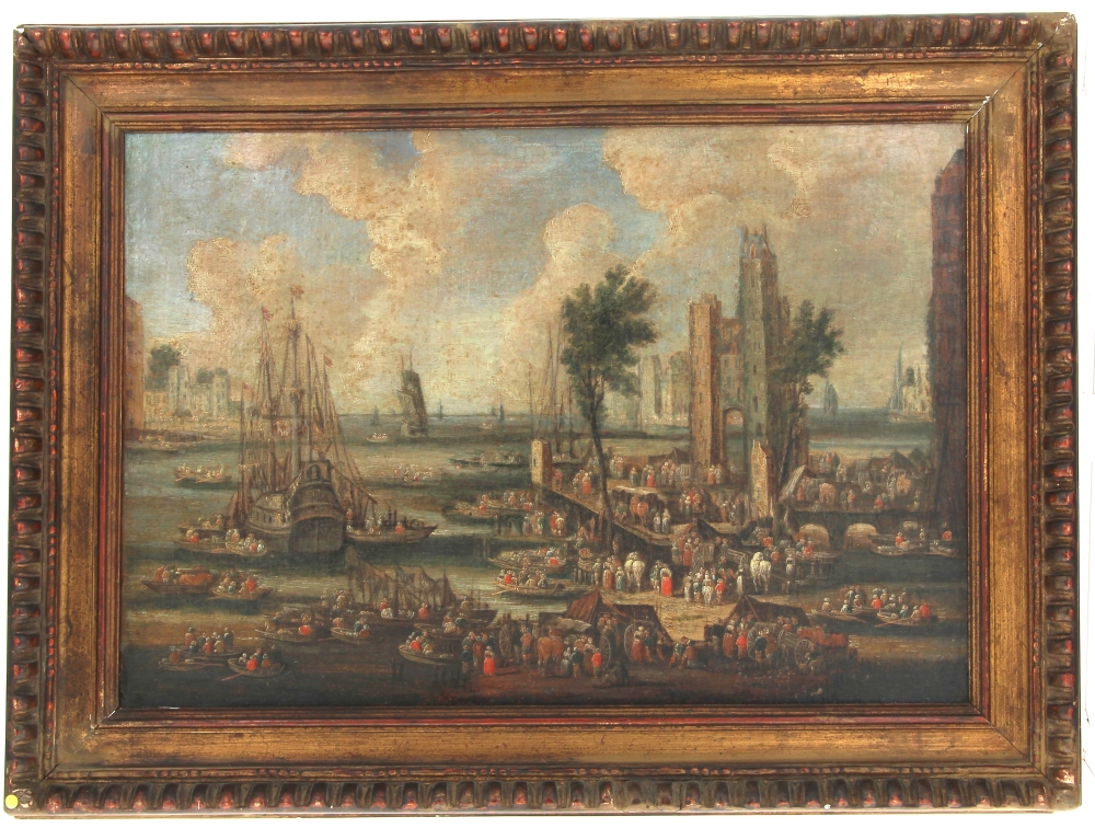 Adriaen Frans BOUDEWYNS (c.1644-1711) Dans le goût de – « Scène de port animé », huile sur toile, portant au dos une inscription manuscrite à l’encre « Boudewyns vers 1680 », 40 x 57,5 cm (dans un cadre en bois sculpté)
