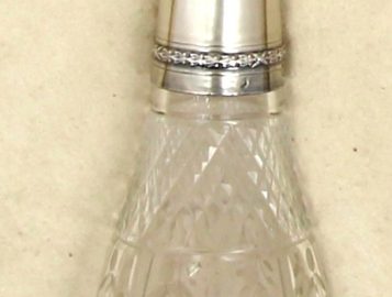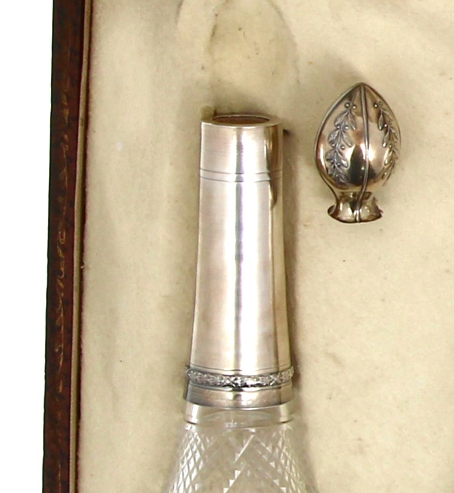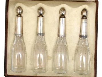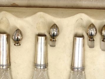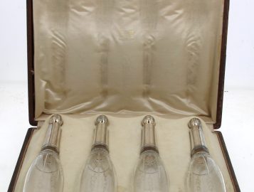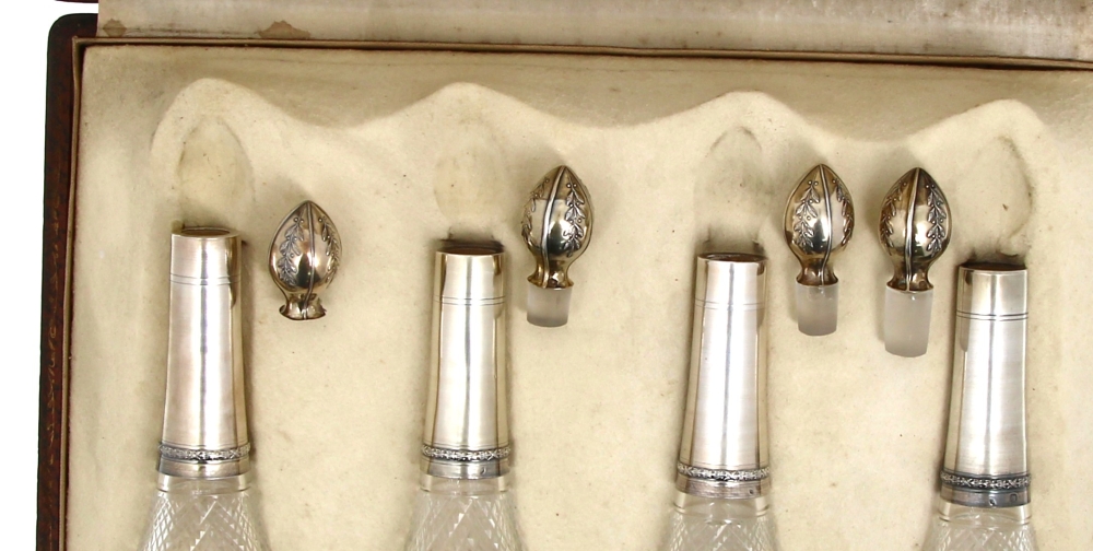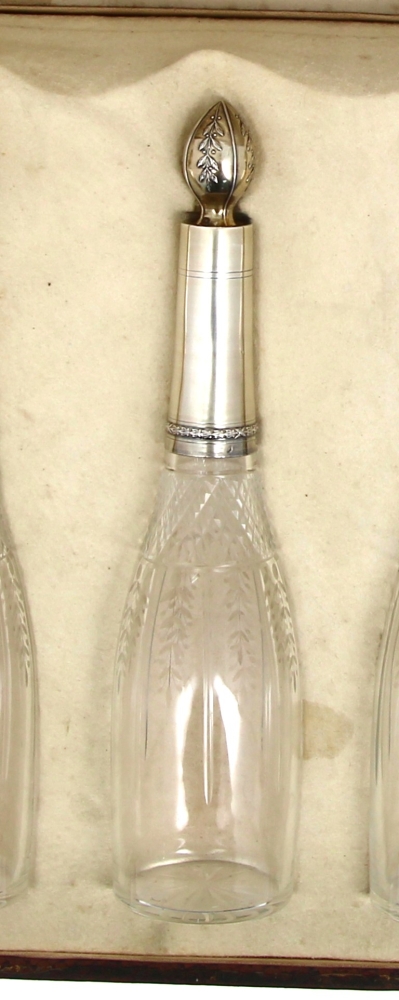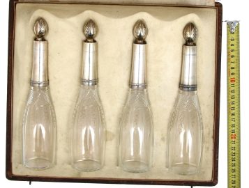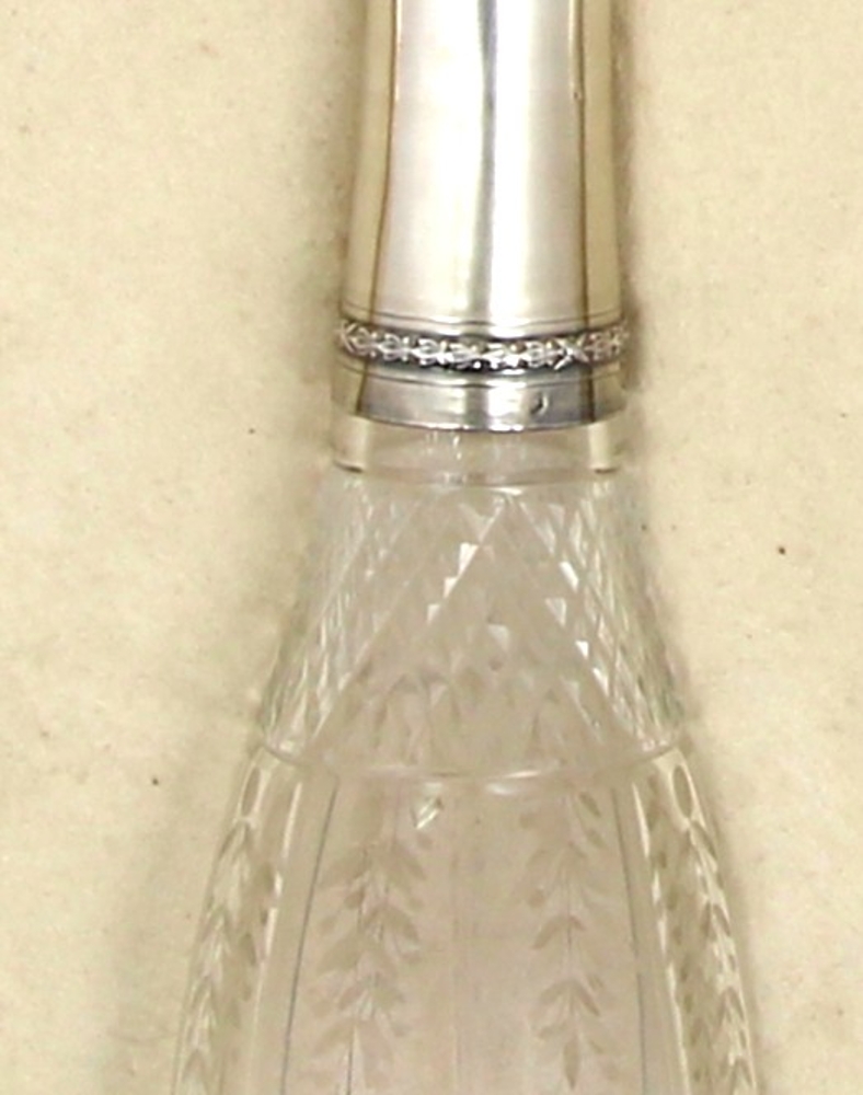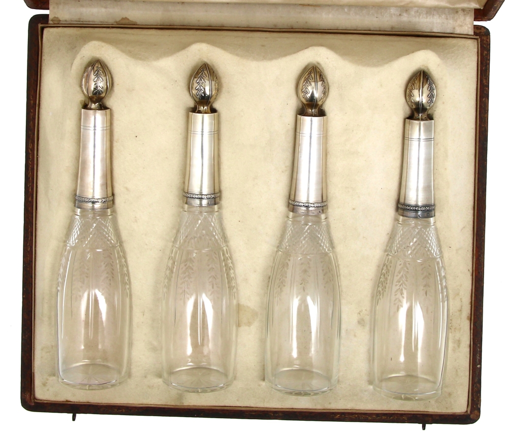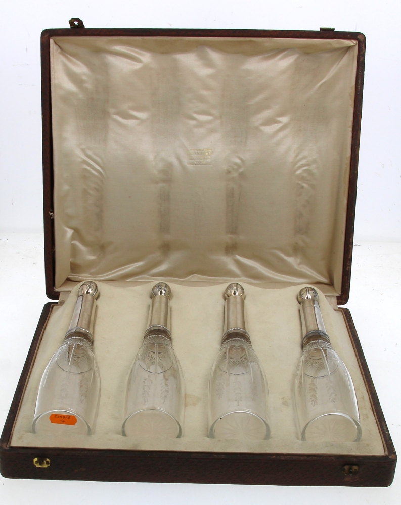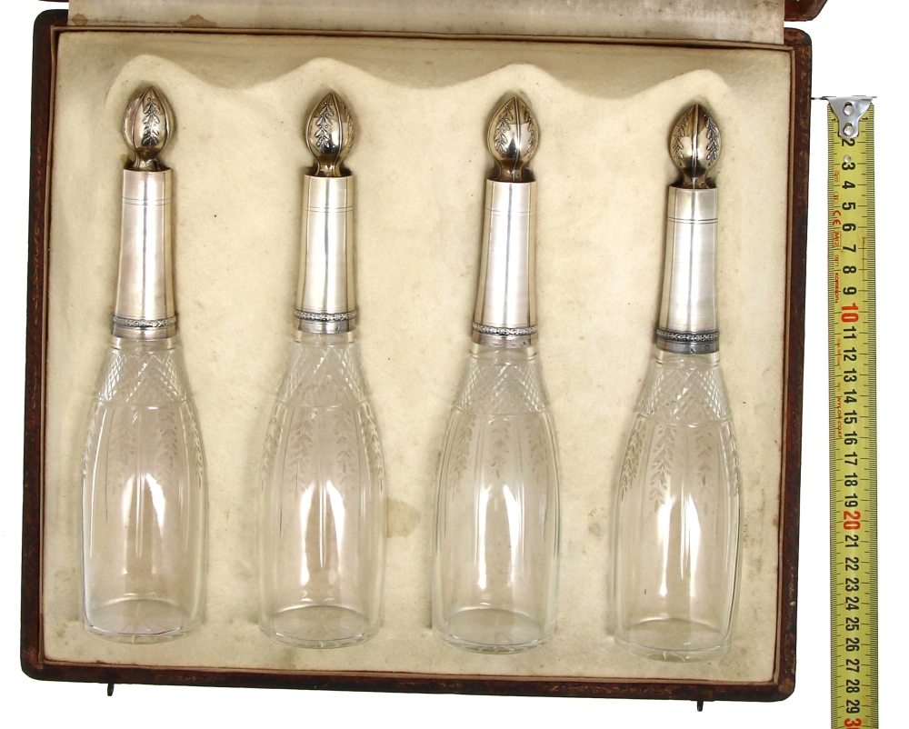 Aristide LECLERC (Orfèvre à Paris à partir de 1929) – Suite de 4 carafes en cristal et argent, poinçon minerve, 25,5 cm (un bouchon accidenté). En écrin d’origine
