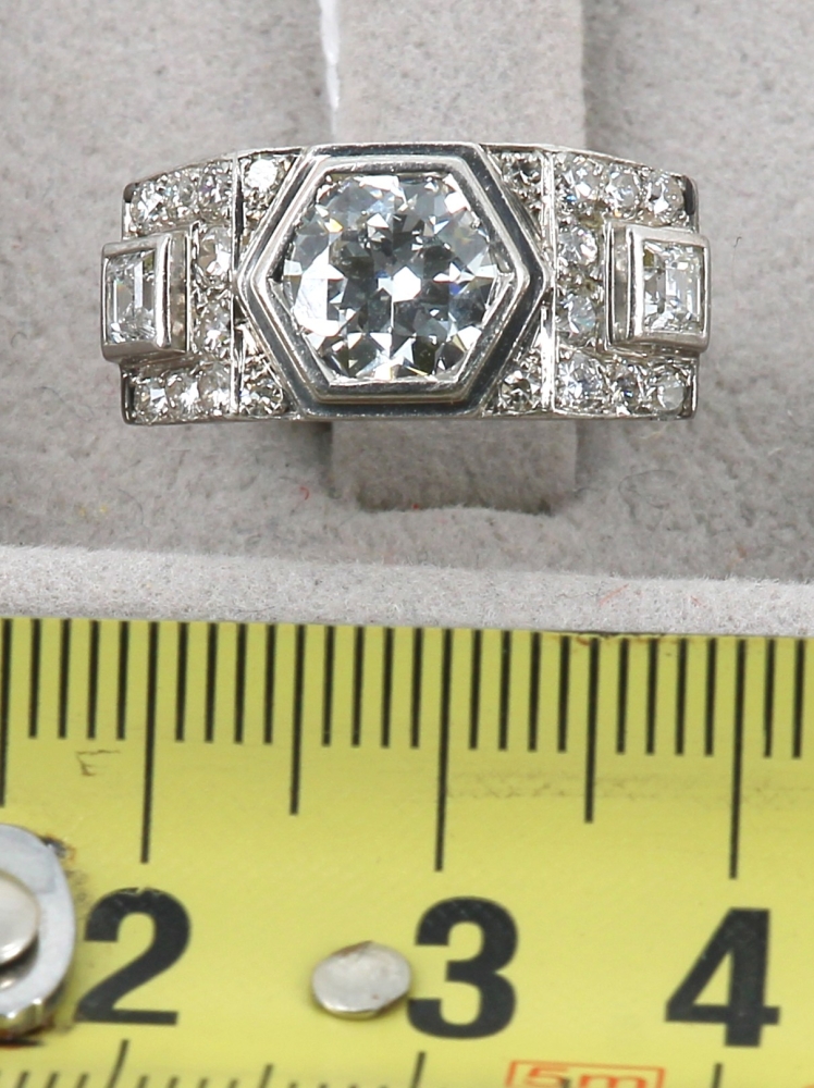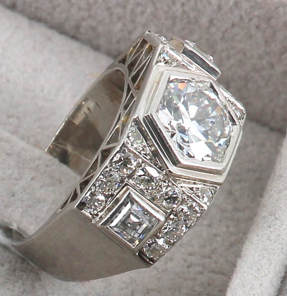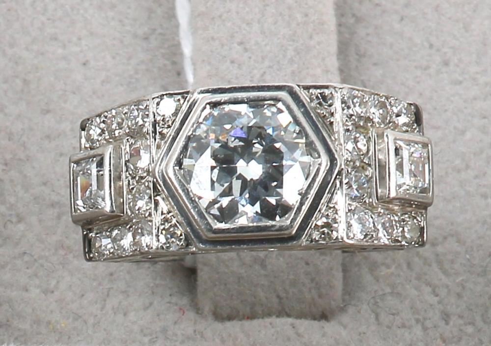 Bague ART DECO sertie d’un diamant 1/2 taille d’environ 1,5 carat, 2 diamants calibrés et pavage de diamants (piqures dans le diamant principal). Poids brut 8,10 grs. TDD 50