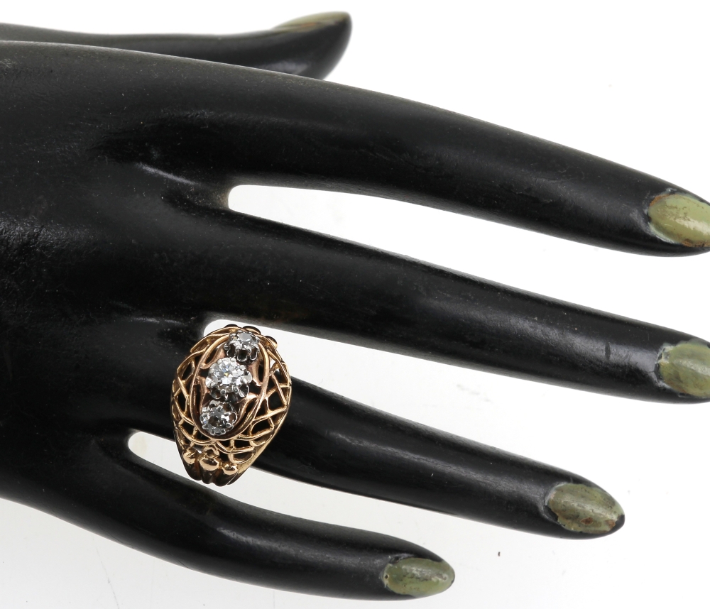 Bague dôme en or jaune 18 carats et platine, poinçons tête d’aigle et tête de chien, sertie de 3 diamants taille ancienne, poids brut 9 grs. TDD 57,5