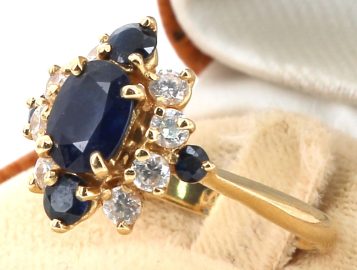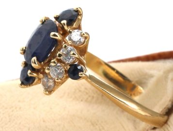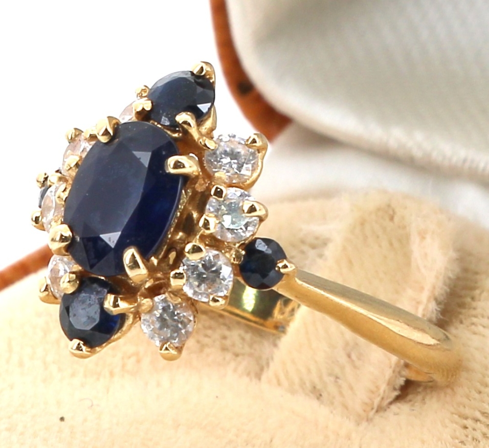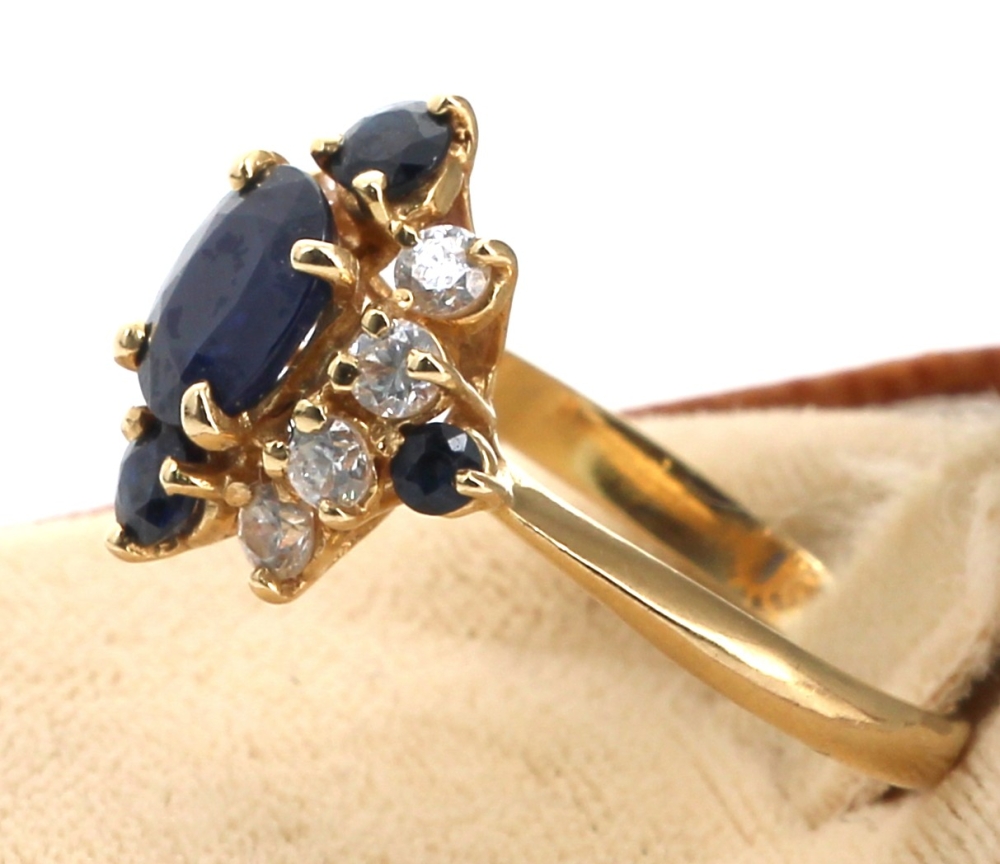 Bague en or jaune 18 carats, poinçon tête d’aigle, sertie d’un saphir ovale, 4 saphirs ronds et 4 diamants ronds, poids brut 5,40 grs. TDD 59