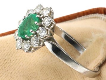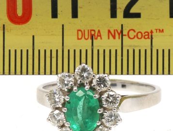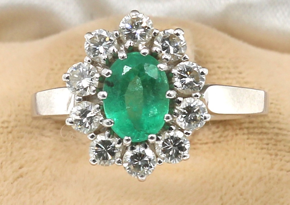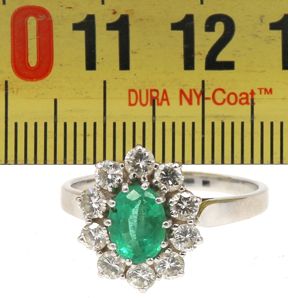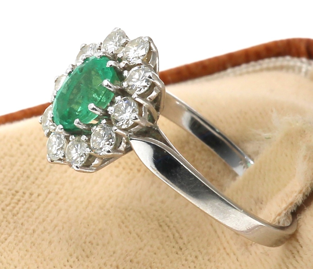 Bague style marguerite en or gris 18 cts et platine, poinçons tête d’aigle et tête de chien, sertie d’une émeraude ovale entourée de 10 diamants, poids brut 5,60 grs. TDD 60