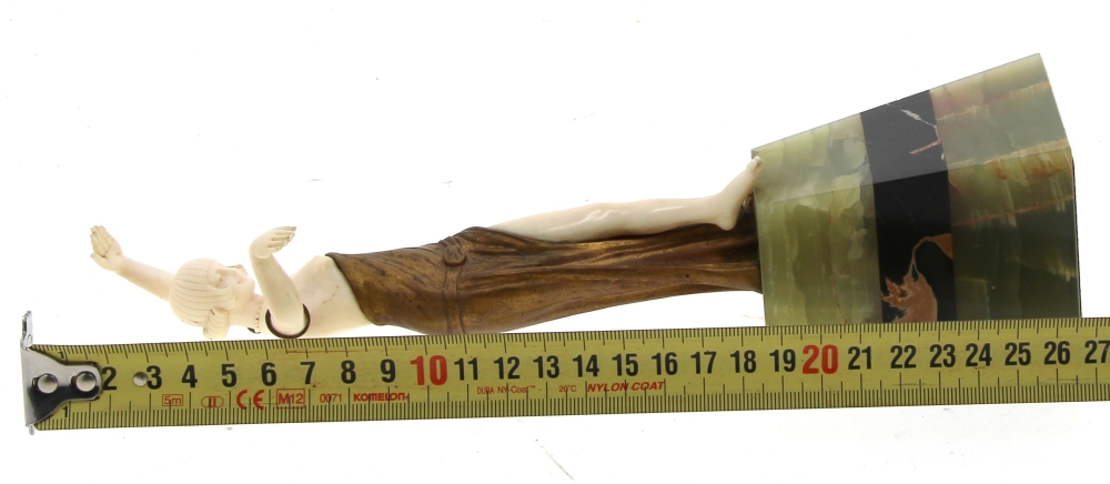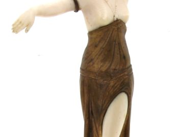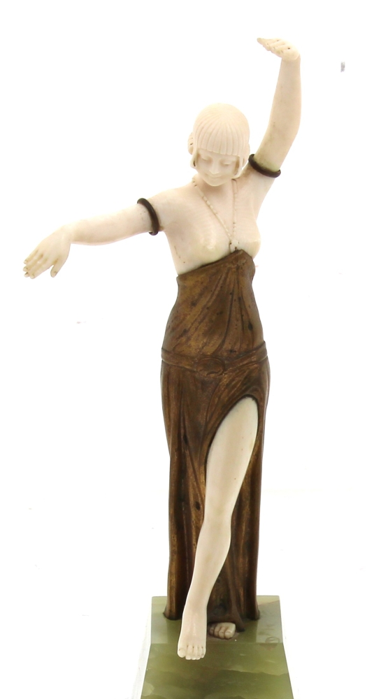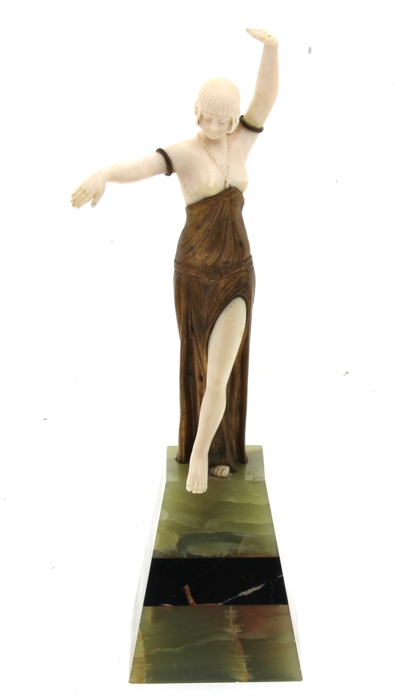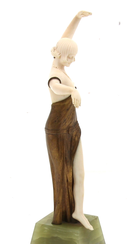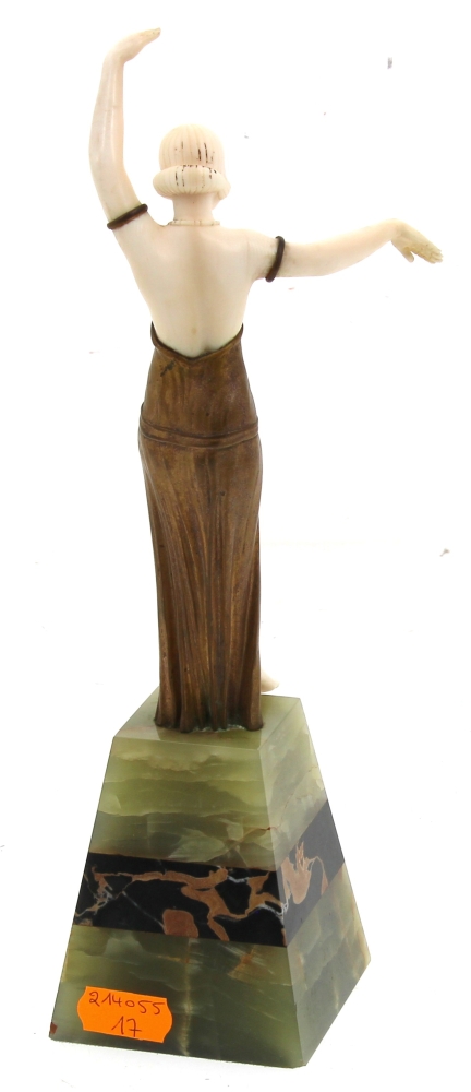 BARTHELEMY Louis (XIX-XX)  » Danseuse », chryséléphantine reposant sur un socle en onyx vert et marbre noir. Signé sur le drapé. H 26 cm. Provenance « A la gerbe d’or », Saint-Brieuc, 1941
