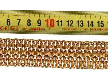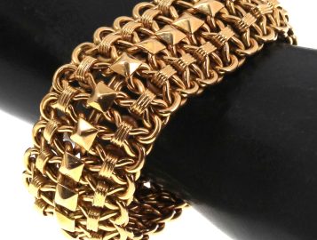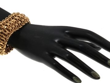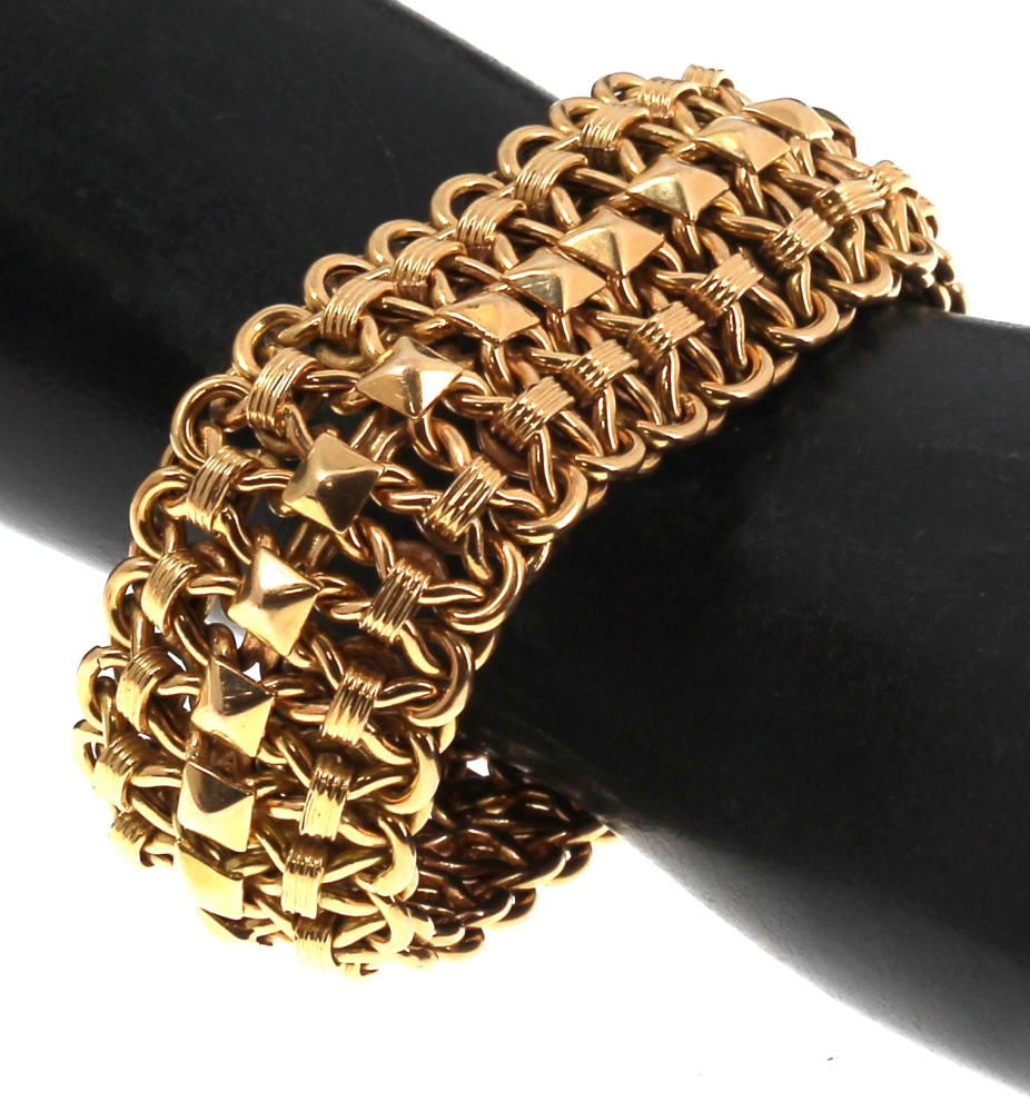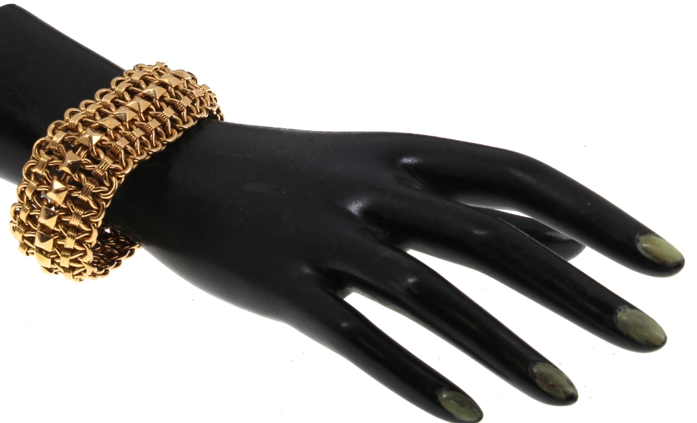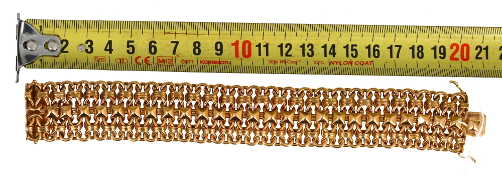 Beau bracelet en or jaune 18 carats, poinçon tête d’aigle, poids 57,60 grs. L 20,5 cm. Largeur 3 cm (conservé en banque)