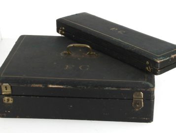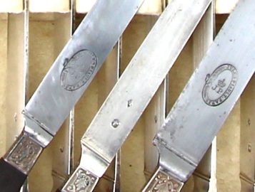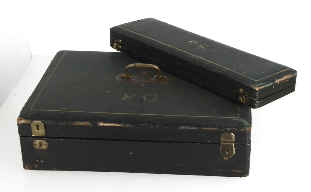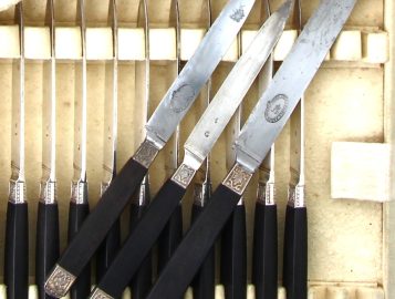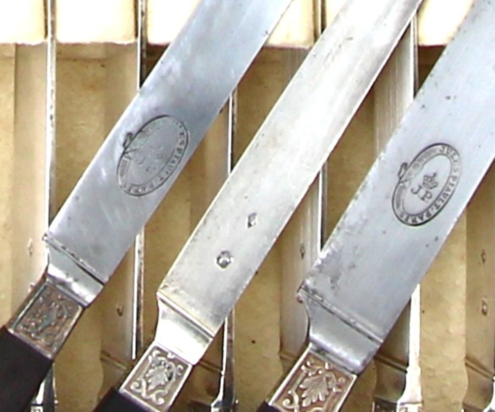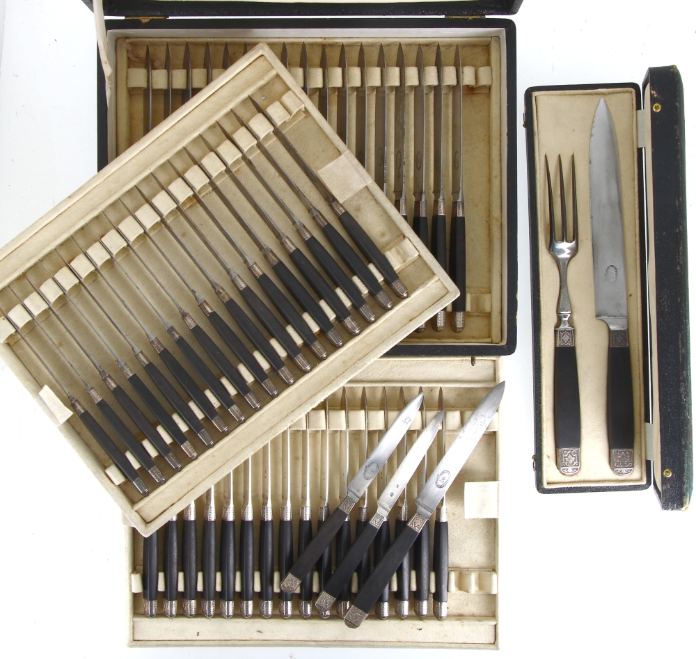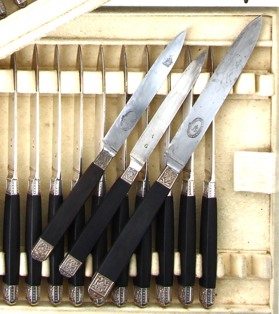 Bel ensemble de couteaux de table fin XIXème, manches bois noirci et argent : 18 grands couteaux lames acier, 18 couteaux à entrement lames acier, 17 couteaux à entrement lames argent (poinçon minerve), et un couvert à découper assorti (2 écrins)