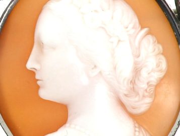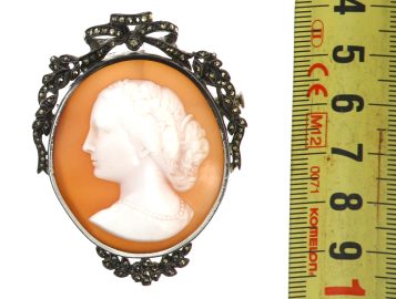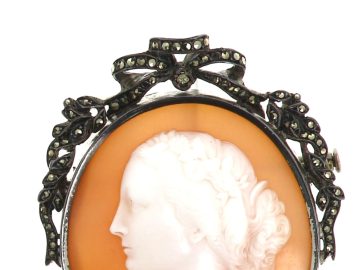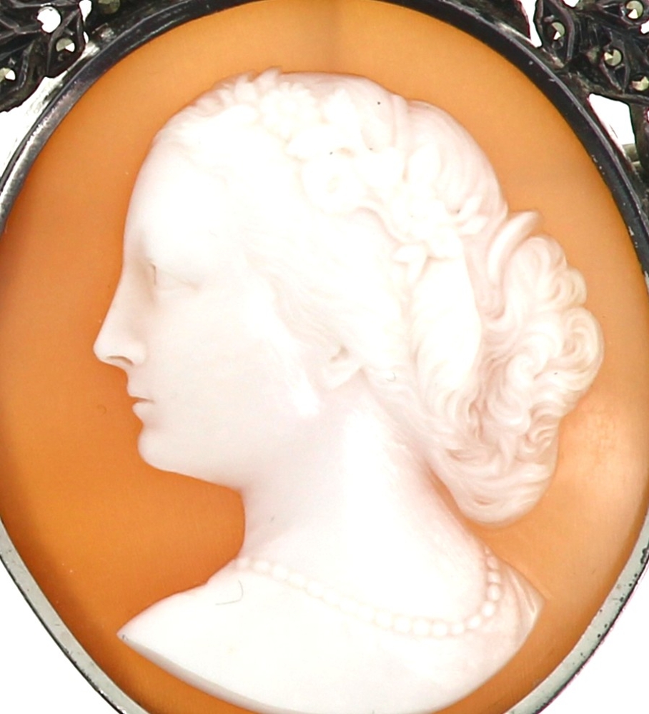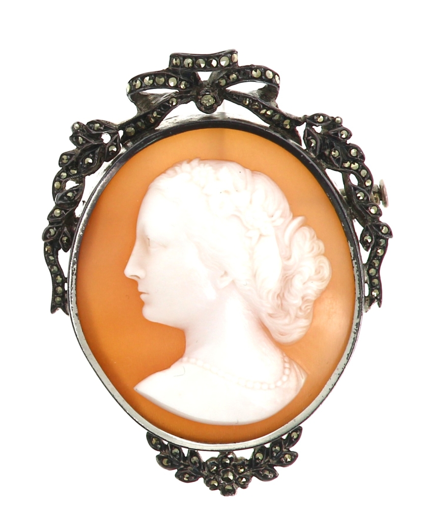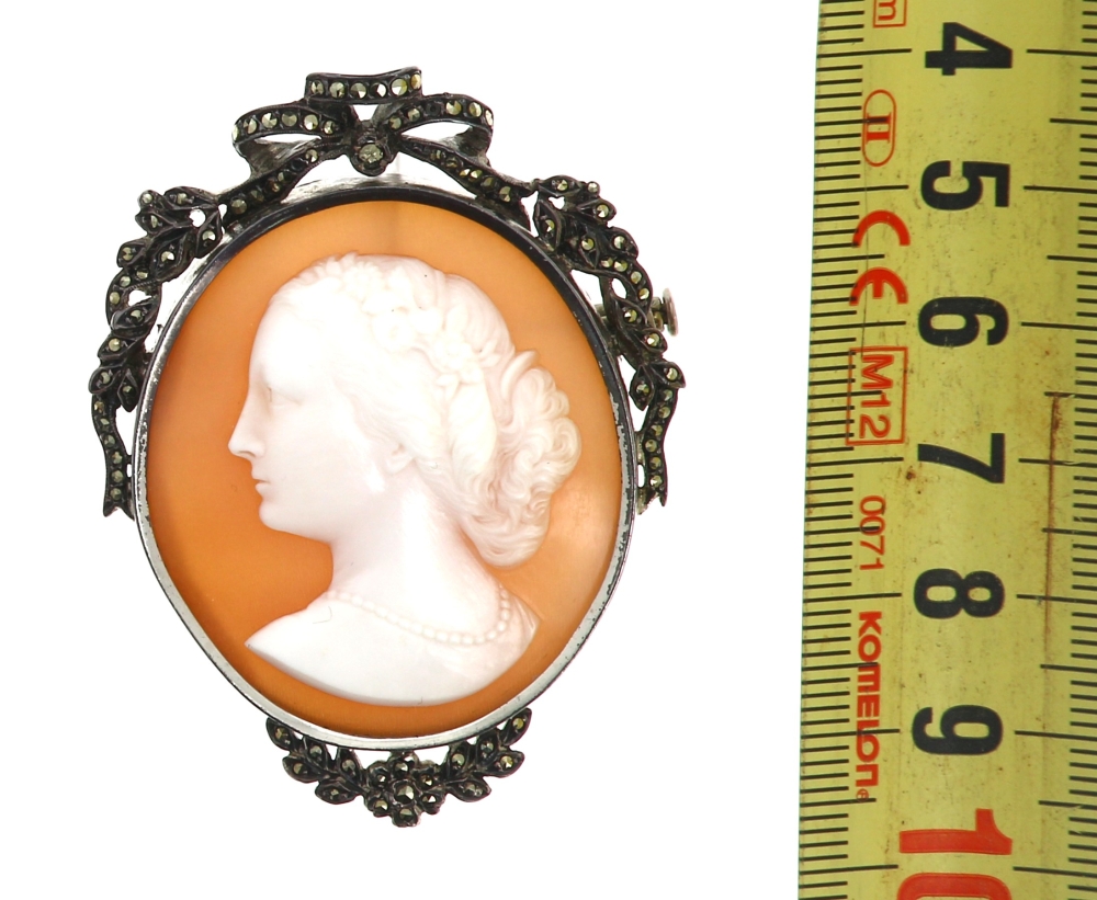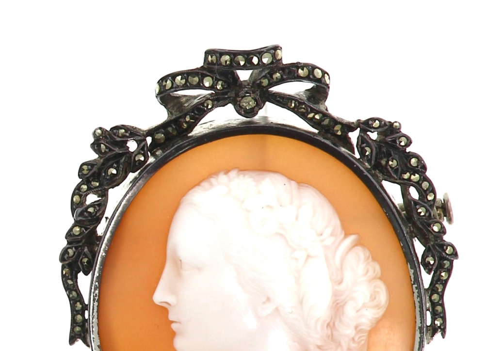 Belle broche camée ancienne en argent, profil féminin, motif de nœud de ruban et marcassite, poids brut 16,70 grs. H 5,5 cm env.