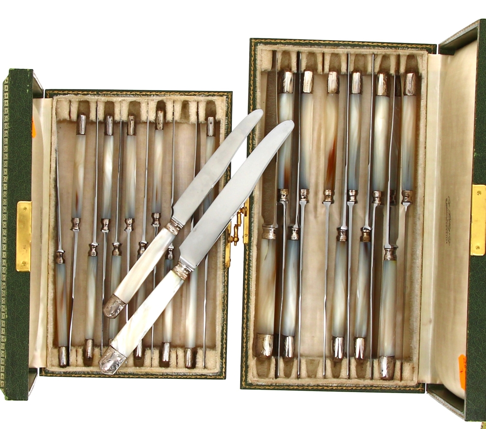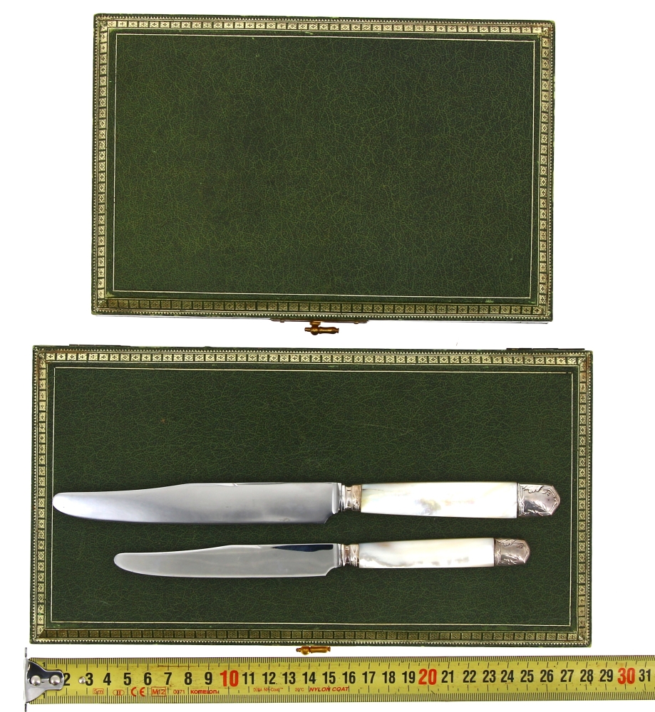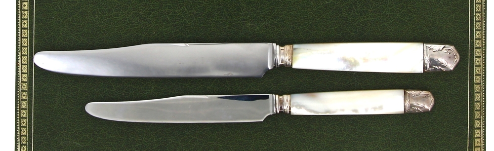 Belle suite de 12 couteaux de table et 12 couteaux à entremet, lames inox, manches en nacre et métal argenté, bel état de l’ensemble (2 écrins verts d’origine)