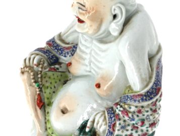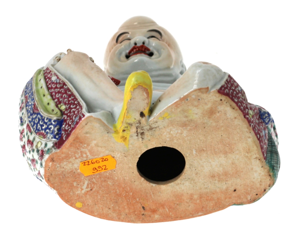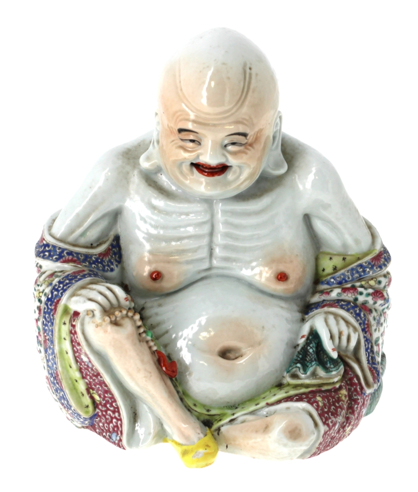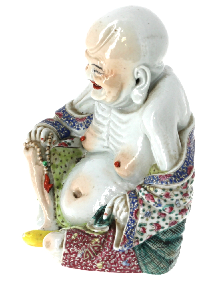 BOUDDHA Rieur – Sujet en porcelaine polychrome, H 21 cm (saut d’émail à la chaussure ; petits manques sur le chapelet)