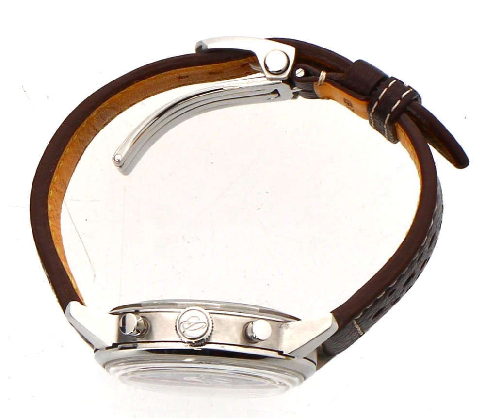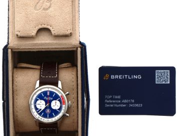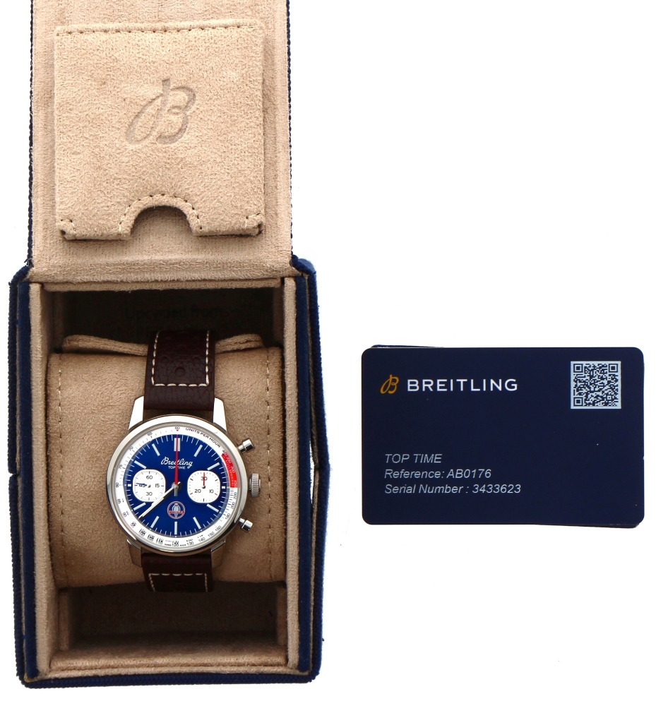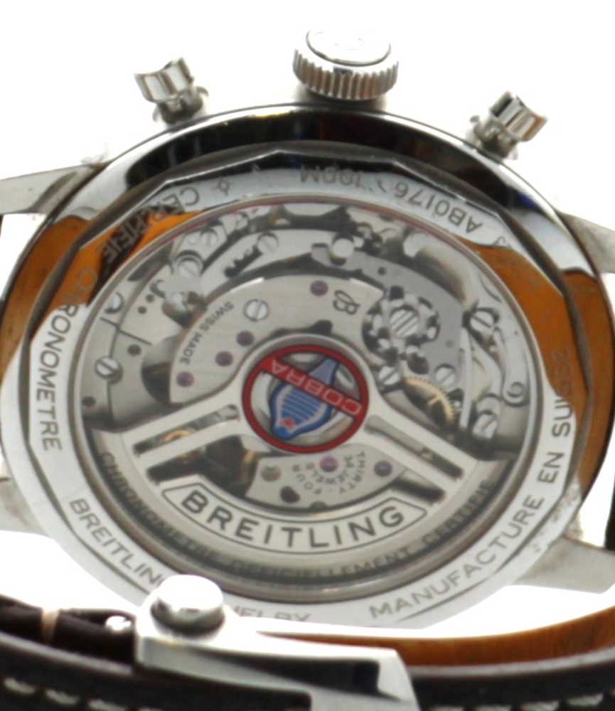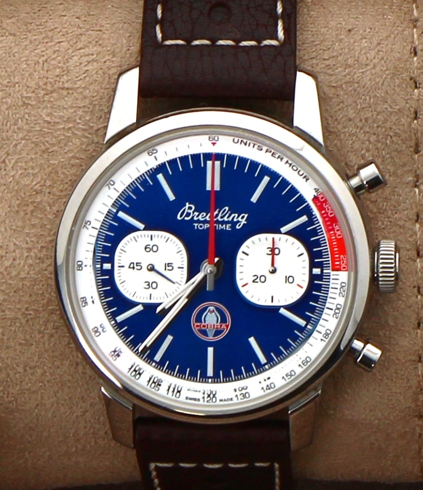 BREITLING – Montre bracelet homme Top Time, B01 Shelby Cobra, boîtier acier, mouvement automatique, bracelet cuir brun, n° AB0176, bel état, coffret, carte de garantie et notice d’origine.
