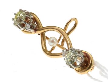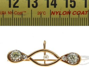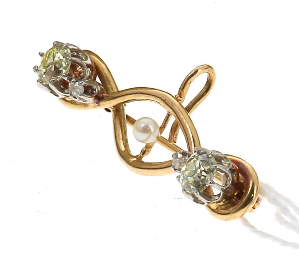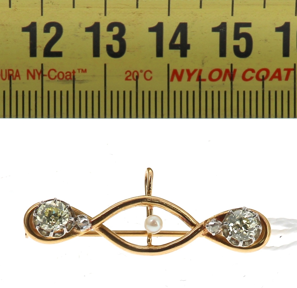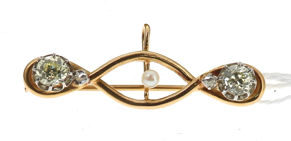 Broche pendentif en or jaune 18 cts, non poinçonnée, sertie de 2 diamants TA, deux diamants taille rose, et une petite perle. Poids brut 5,20 grs. L 3,8 cm env.