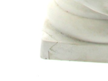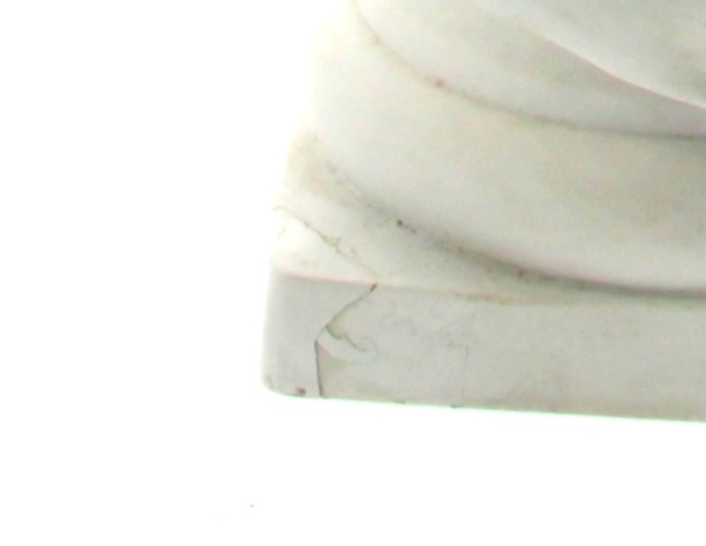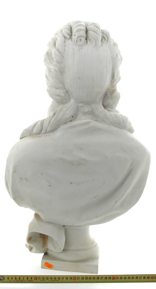 BUSTE de femme du XVIIIème siècle – Grand biscuit de porcelaine blanc ancien. H 68 cm (un accident dans un angle antérieur de la base ; qq salissures, pièce sortie d’un grenier)