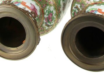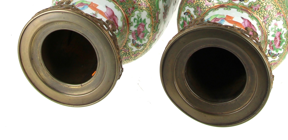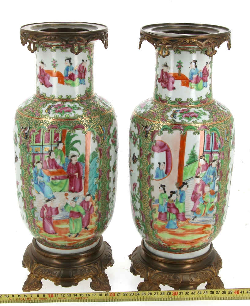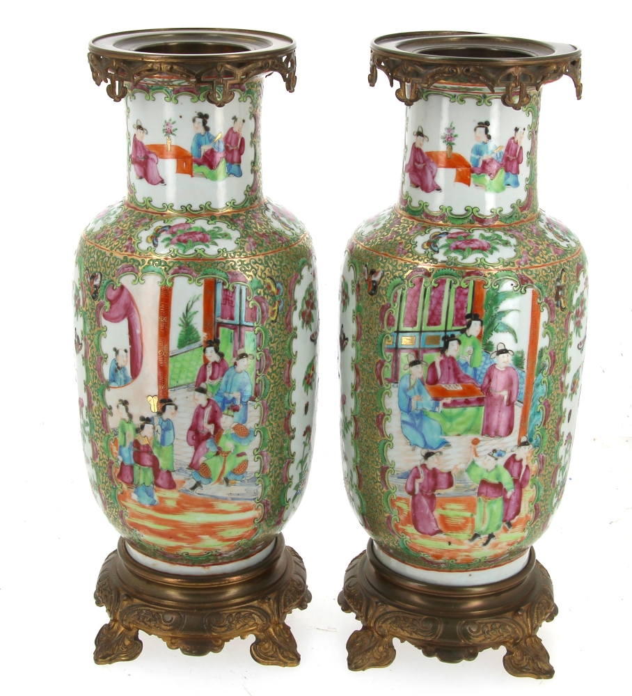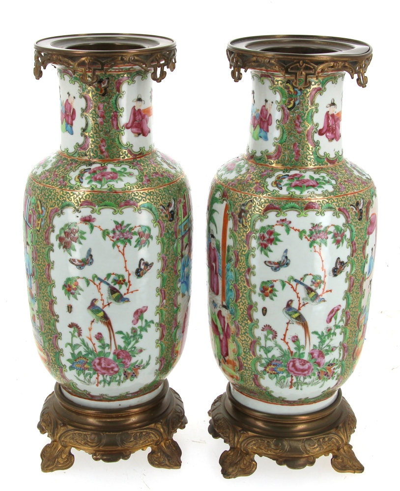 CANTON, CHINE (XIXème) – Paire de vases en porcelaine de Canton à décor dans des cartouches de scènes animées, oiseaux branchés, fleurs et papillons. Bases et cols en bronze. H 43 cm (choc au bronze d’un des cols)