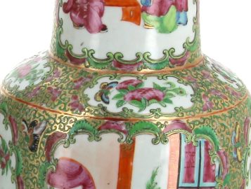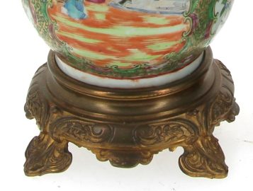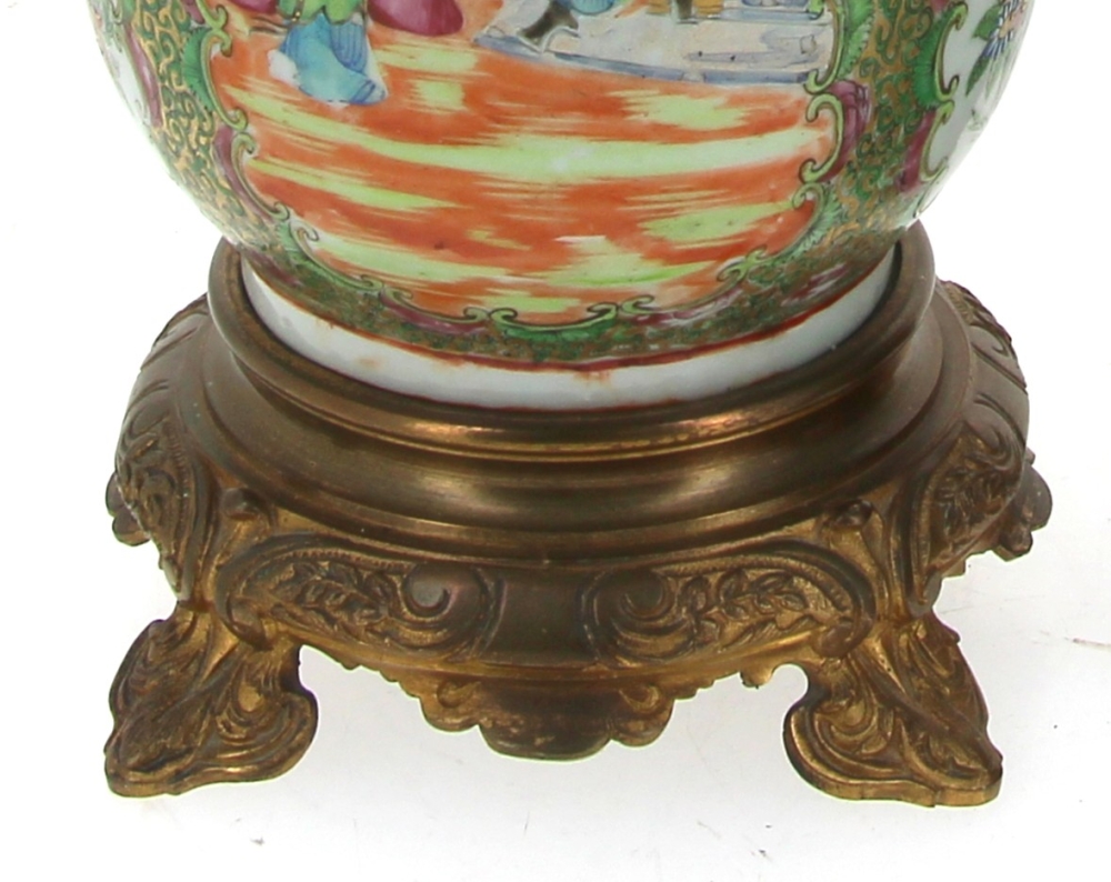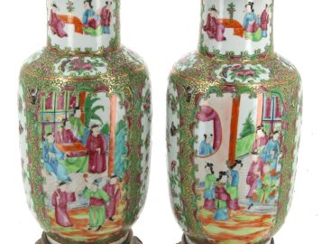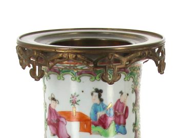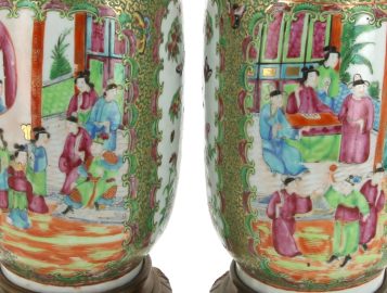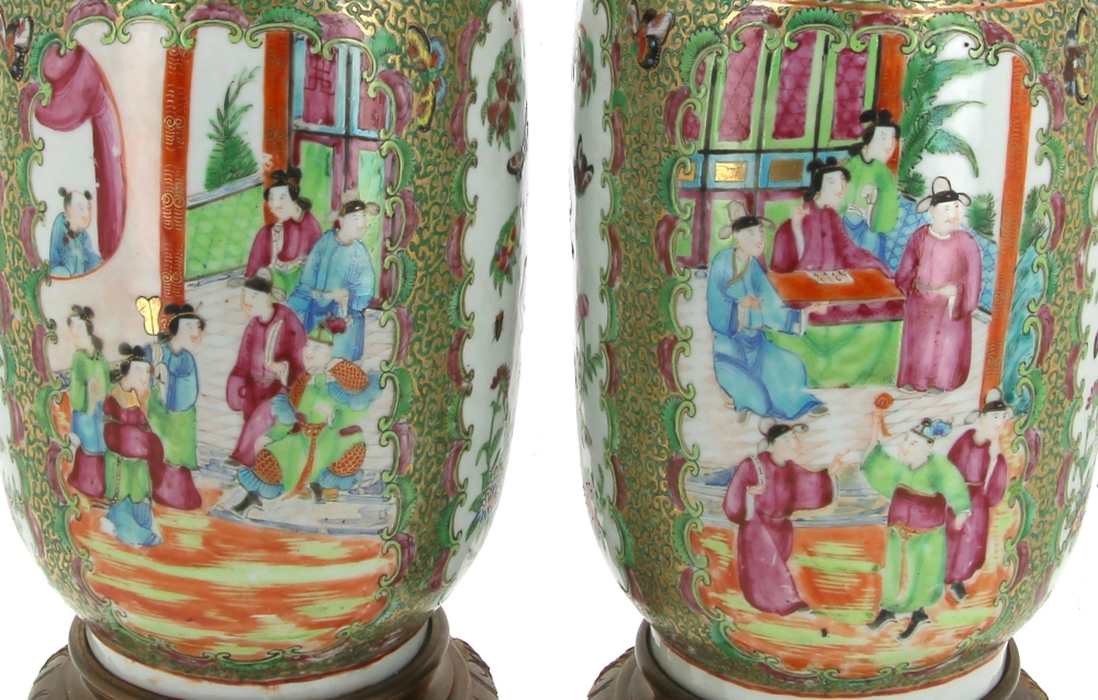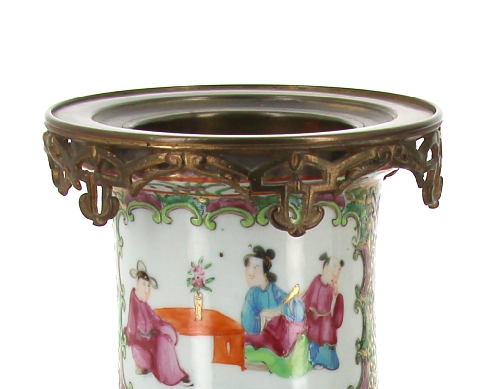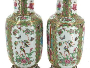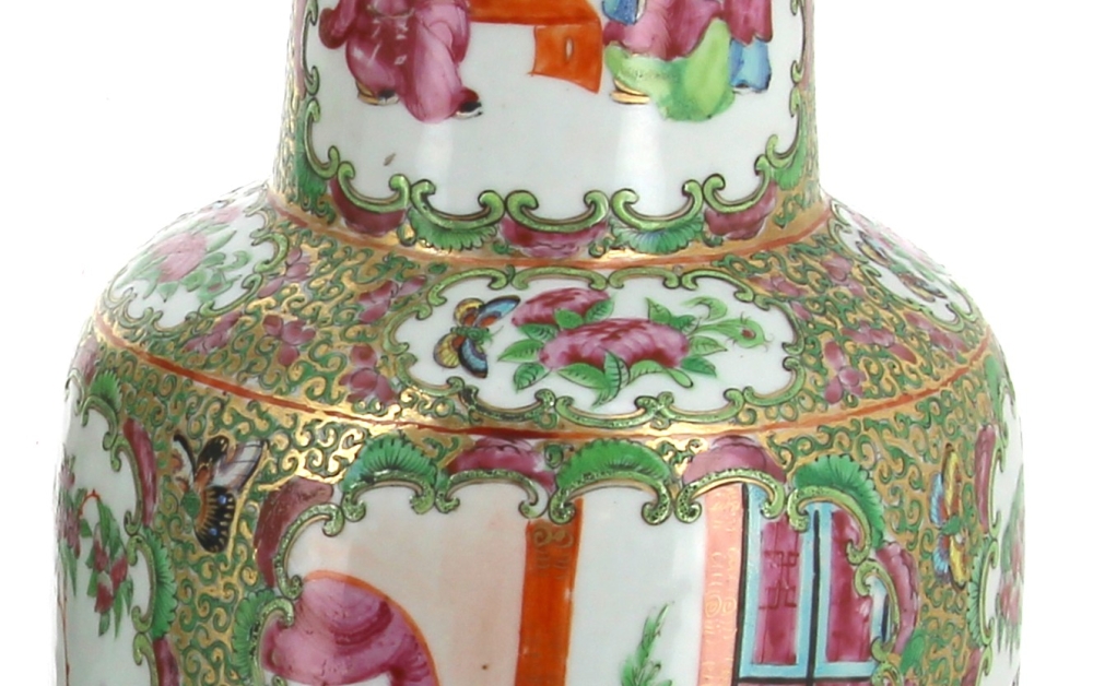 CANTON, CHINE (XIXème) – Paire de vases en porcelaine de Canton à décor dans des cartouches de scènes animées, oiseaux branchés, fleurs et papillons. Bases et cols en bronze. H 43 cm (choc au bronze d’un des cols)