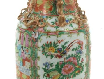 CANTON XIXème – Vase en porcelaine à décor en réserve de personnages, fleurs et volatiles H. 45 cm