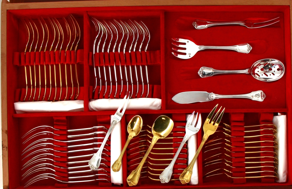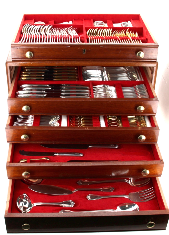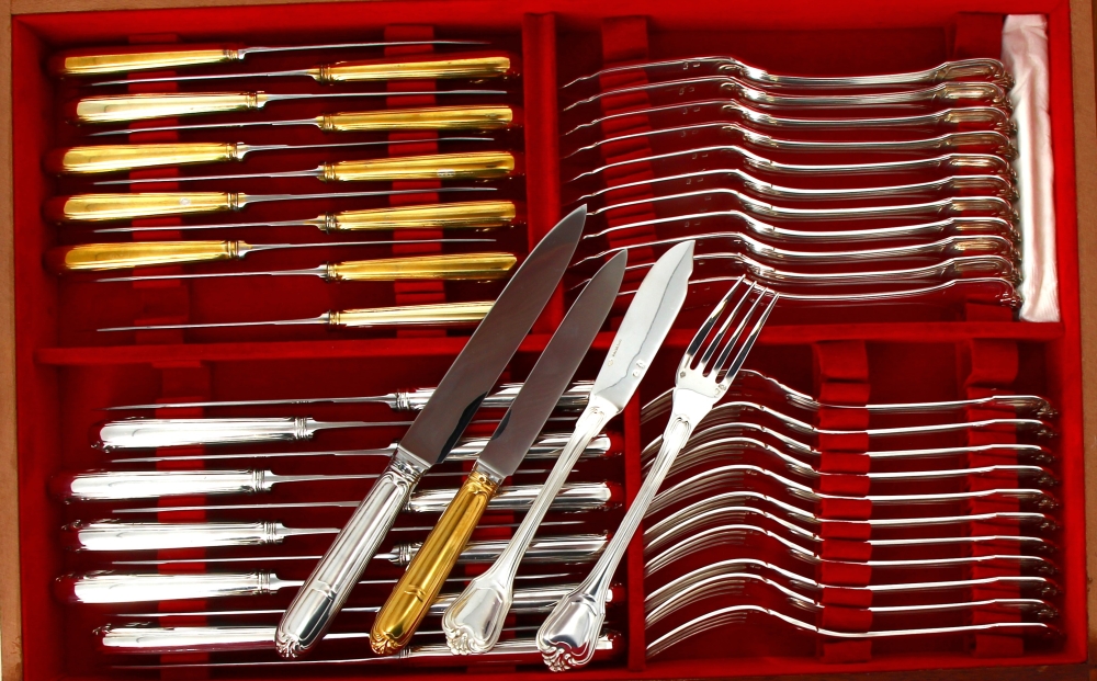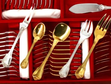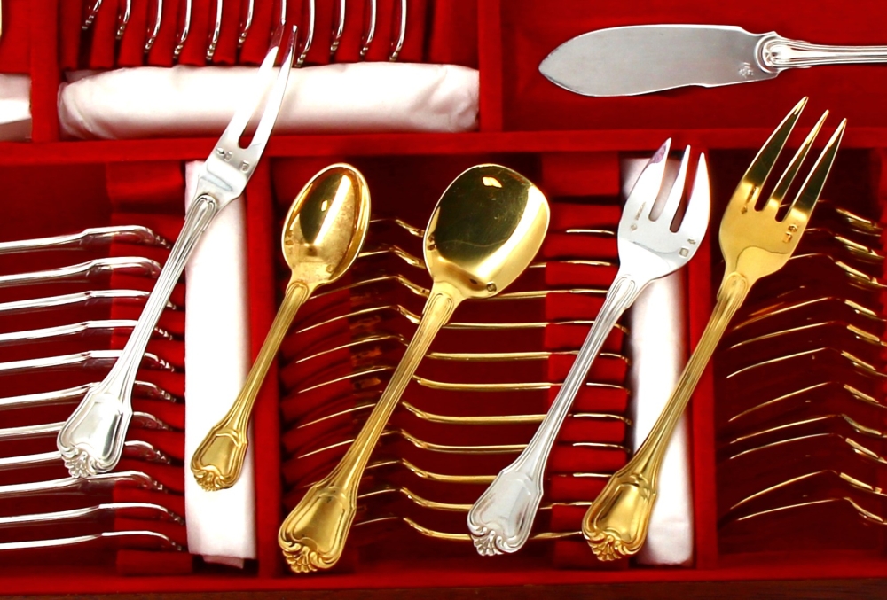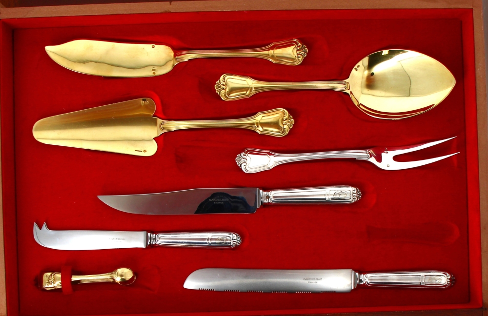 CARDHEILHAC – Importante ménagère de 188 pièces en argent massif et en vermeil, poinçon minerve, présentée dans un argentier en bois ouvrant à 5 tiroirs (H 37 x L 51 x P 36 cm). Elle comprend 12 couverts de table, 12 couverts à entremet (vermeil), 12 petites cuillères, 12 couverts à poisson, 12 couteaux de table, 12 couteaux à entremet (vermeil), 4 petits couverts de service, 12 fourchettes à huîtres, 12 fourchettes à gâteaux (vermeil), 12 fourchettes à escargots, 12 cuillères à moka (vermeil), 12 cuillères à glace (vermeil), une louche, une cuillère à sauce, un couvert de service 2 p., un couvert à salade 2 p., un couvert à poisson 2 p., un couvert à découper 2 p., un couteau à pain, un couteau à fromage, un couvert à glace 2 p. (vermeil), une pelle à tarte et une pince à sucre. Poids net argent 8884,20 grs ; poids brut 2496 grs
