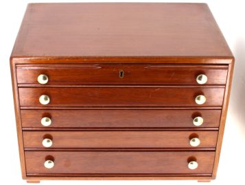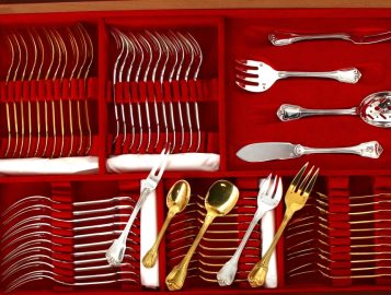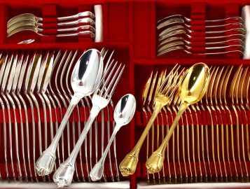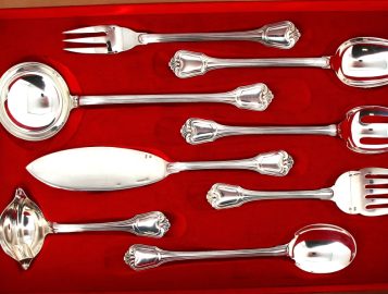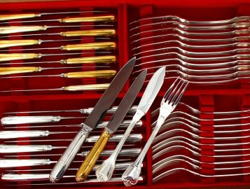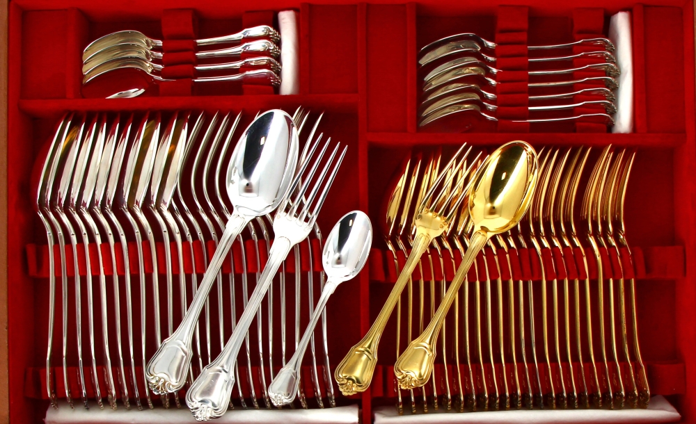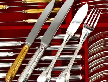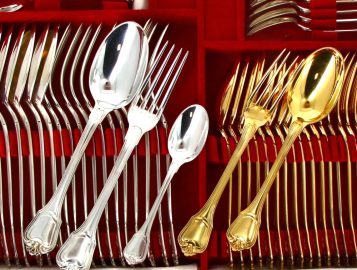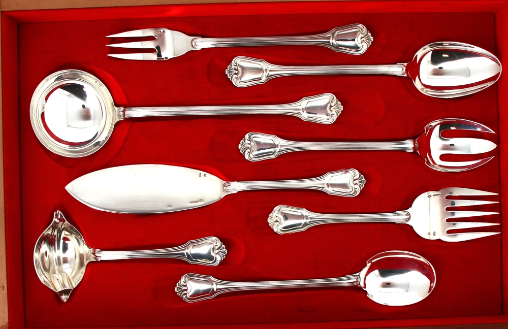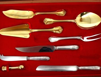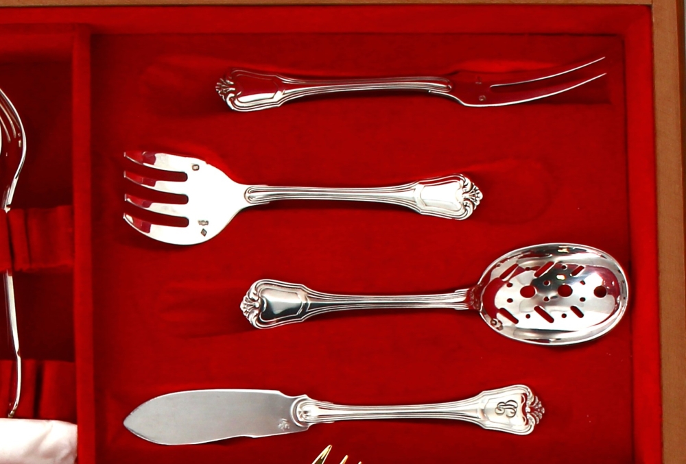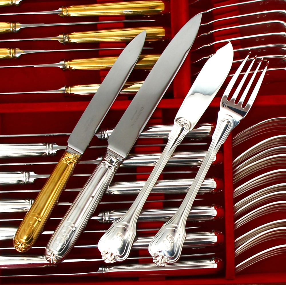 CARDHEILHAC – Importante ménagère de 188 pièces en argent massif et en vermeil, poinçon minerve, présentée dans un argentier en bois ouvrant à 5 tiroirs (H 37 x L 51 x P 36 cm). Elle comprend 12 couverts de table, 12 couverts à entremet (vermeil), 12 petites cuillères, 12 couverts à poisson, 12 couteaux de table, 12 couteaux à entremet (vermeil), 4 petits couverts de service, 12 fourchettes à huîtres, 12 fourchettes à gâteaux (vermeil), 12 fourchettes à escargots, 12 cuillères à moka (vermeil), 12 cuillères à glace (vermeil), une louche, une cuillère à sauce, un couvert de service 2 p., un couvert à salade 2 p., un couvert à poisson 2 p., un couvert à découper 2 p., un couteau à pain, un couteau à fromage, un couvert à glace 2 p. (vermeil), une pelle à tarte et une pince à sucre. Poids net argent 8884,20 grs ; poids brut 2496 grs