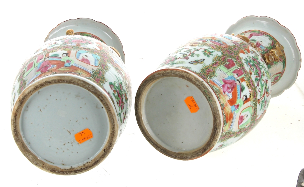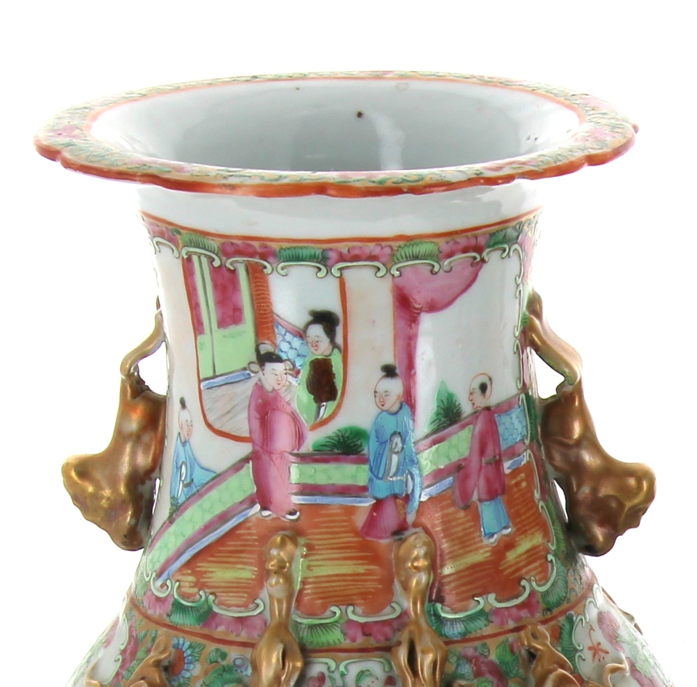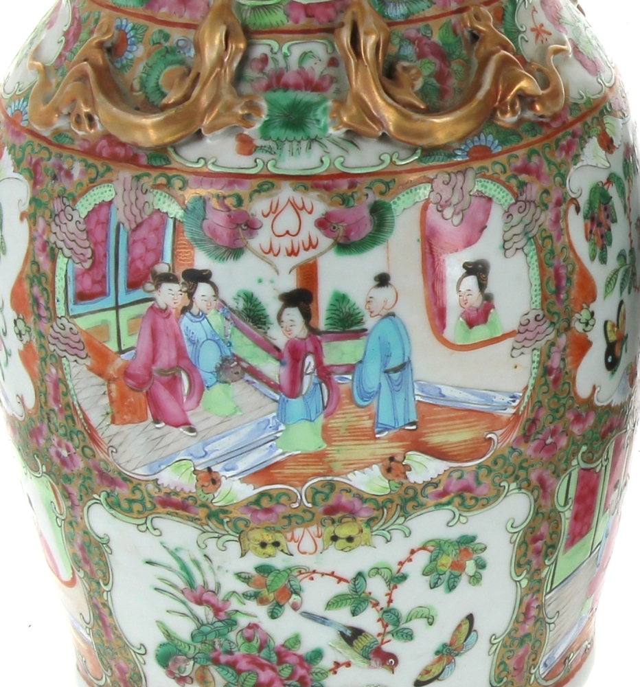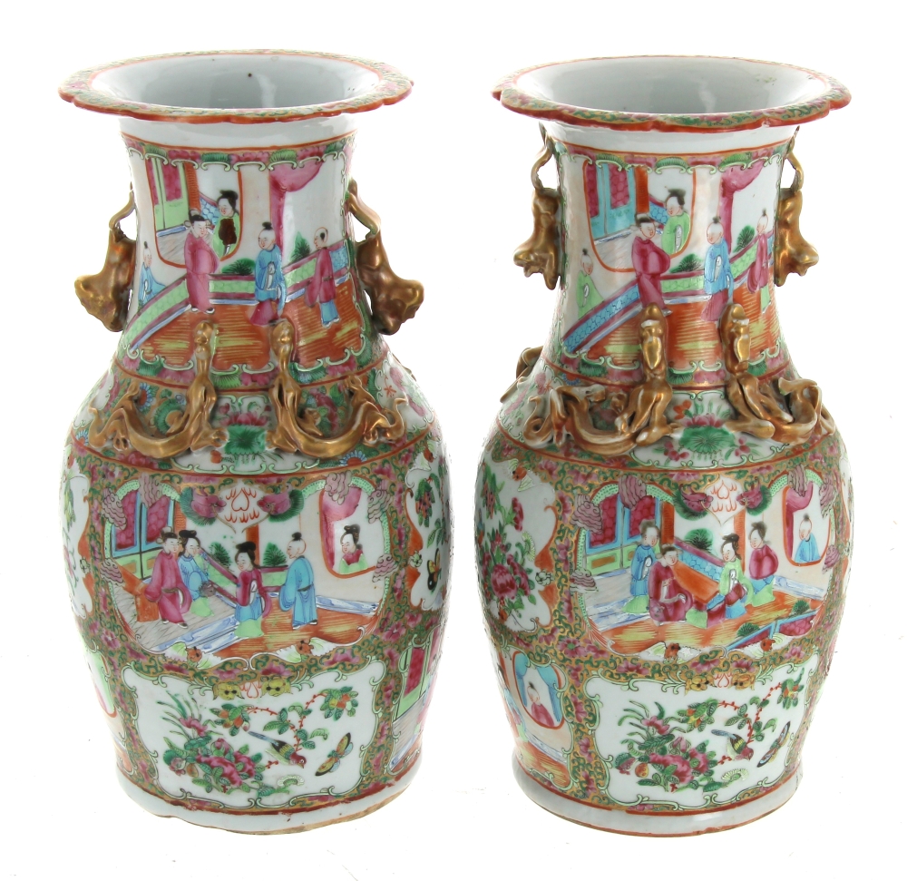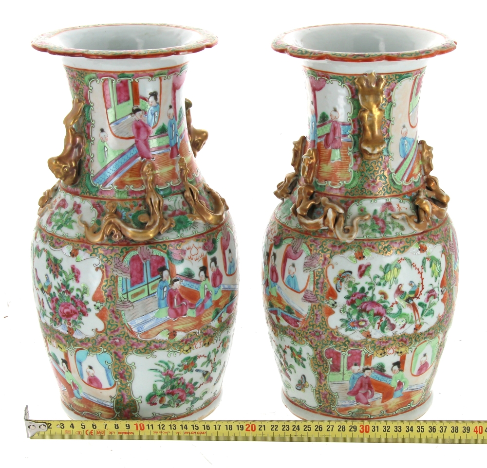 CHINE Canton – Paire de vases en porcelaine polychrome et or à décor en réserves de scènes animées, fleurs et oiseaux. H 35 cm (très léger accident dans une partie dorée)