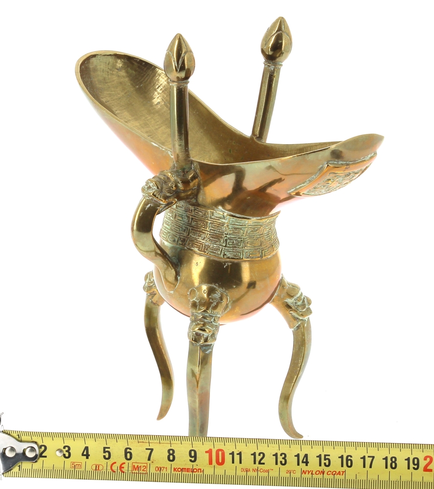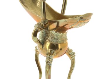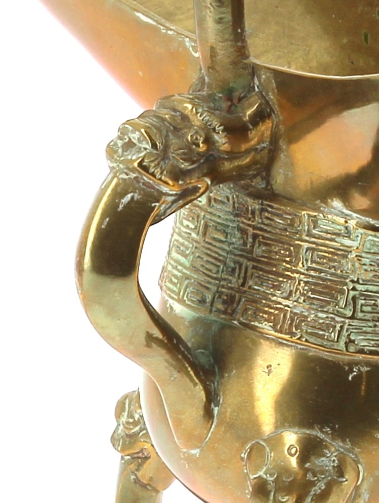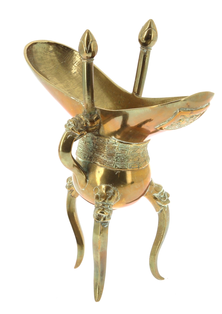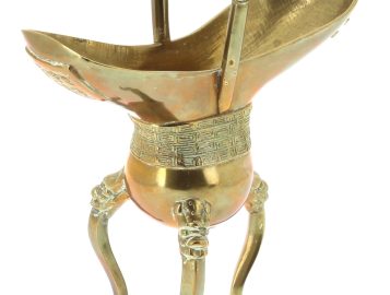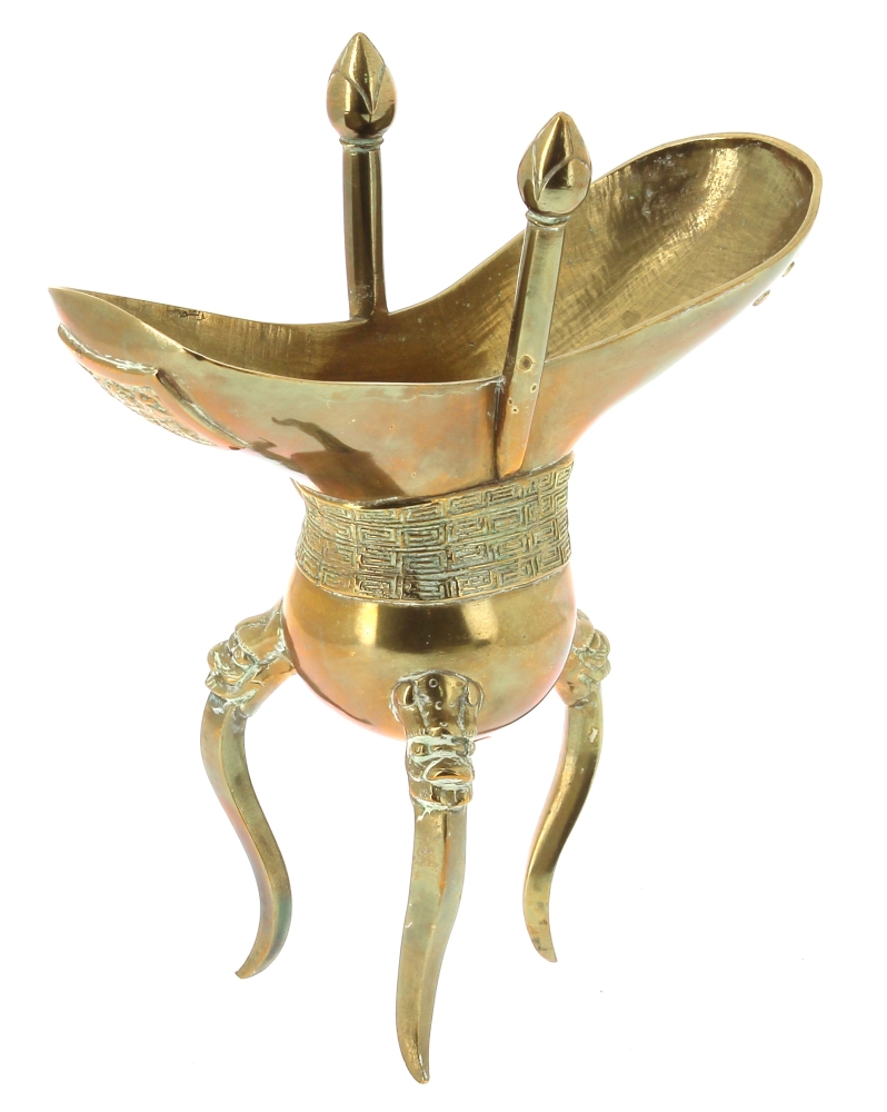 CHINE – Coupe libatoire en bronze doré tripode à l’imitation de la vaisselle archaïque décorée d’une frise ciselée et d’un oiseau en vol, anse et piètement à décor d’une tête de chien de fô, marque appliquée sur la panse. Fin XIXe siècle. H 20,5 cm (légère déformation à une extrémité du col)