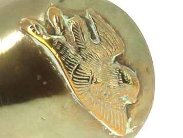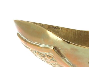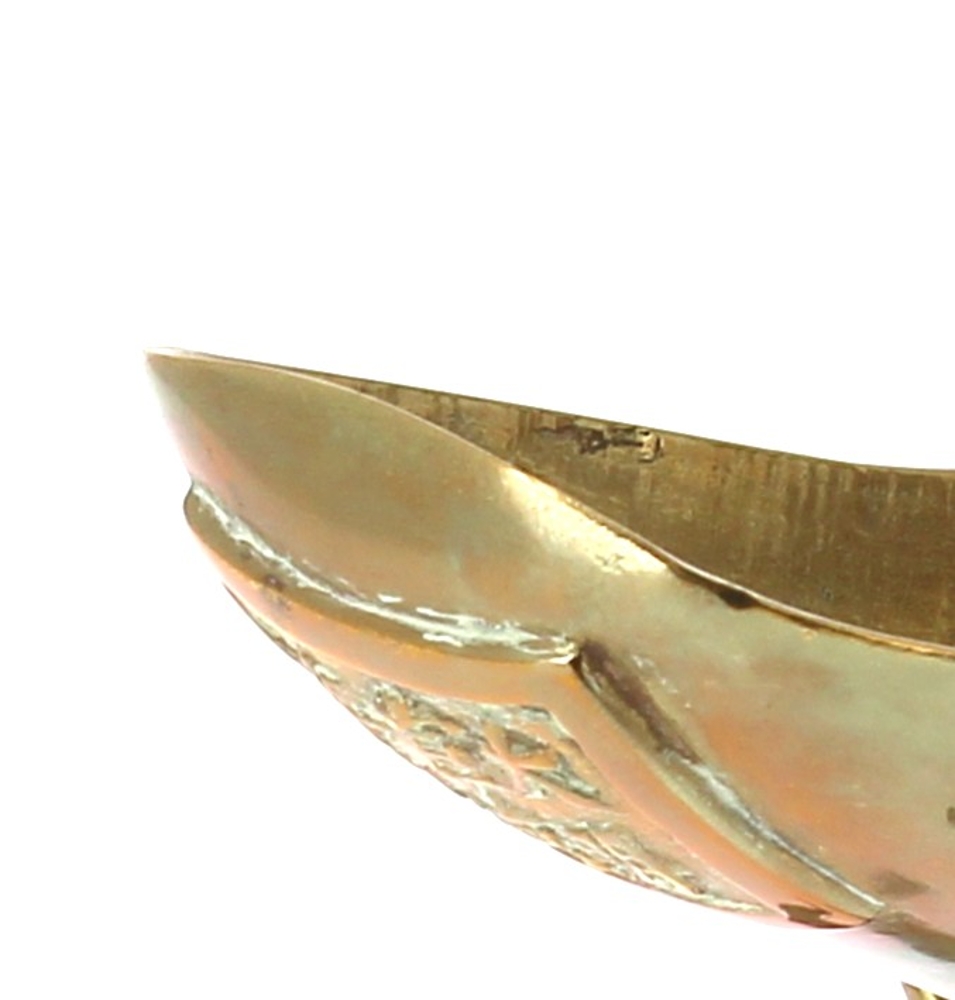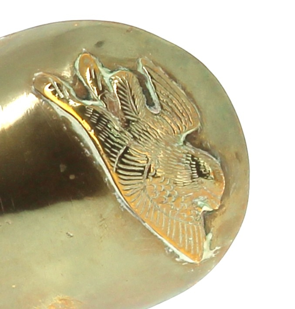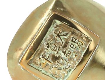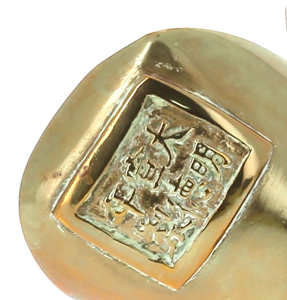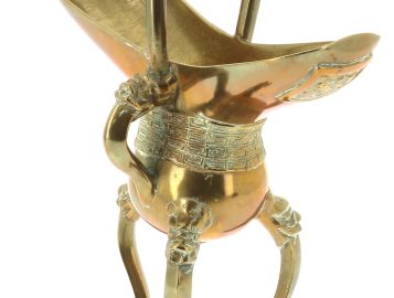 CHINE – Coupe libatoire en bronze doré tripode à l’imitation de la vaisselle archaïque décorée d’une frise ciselée et d’un oiseau en vol, anse et piètement à décor d’une tête de chien de fô, marque appliquée sur la panse. Fin XIXe siècle. H 20,5 cm (légère déformation à une extrémité du col)