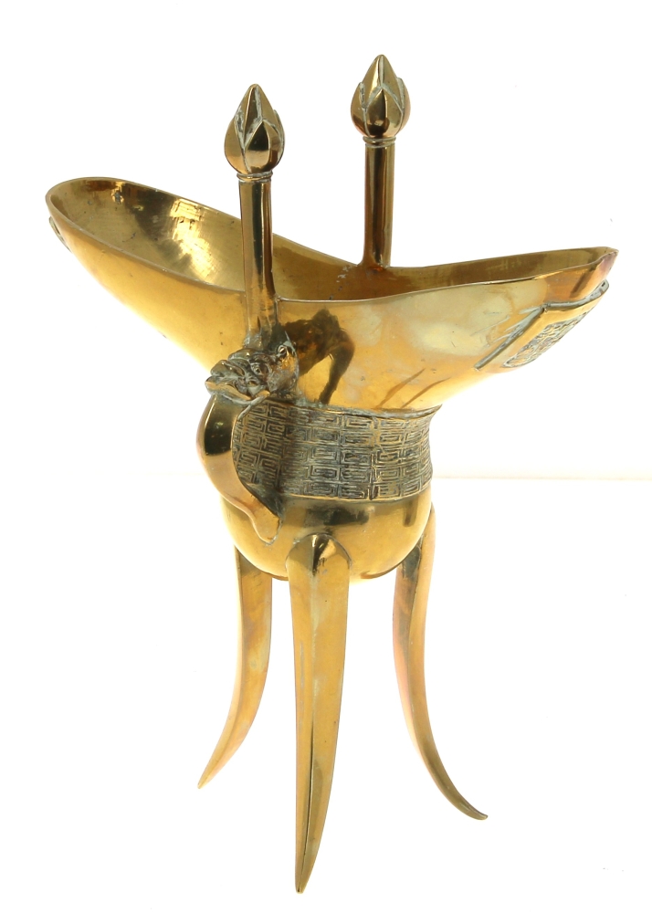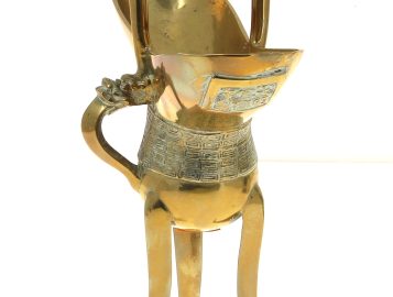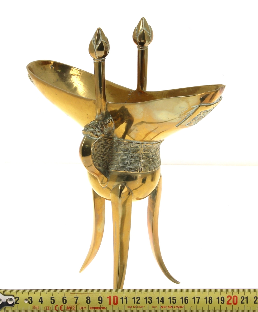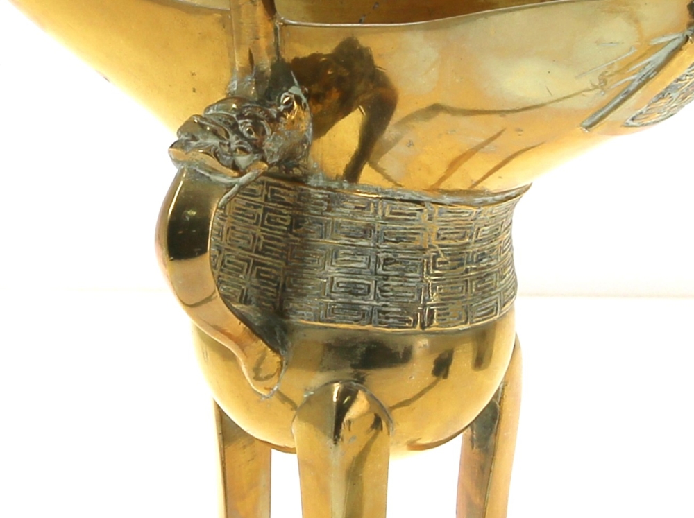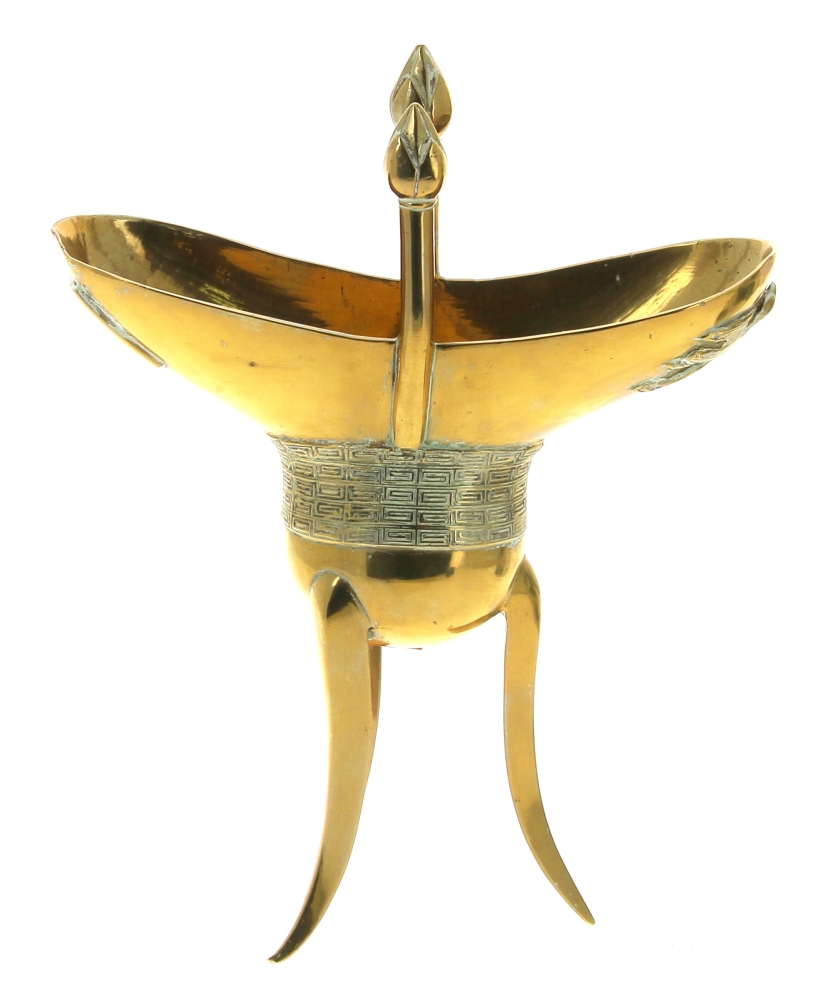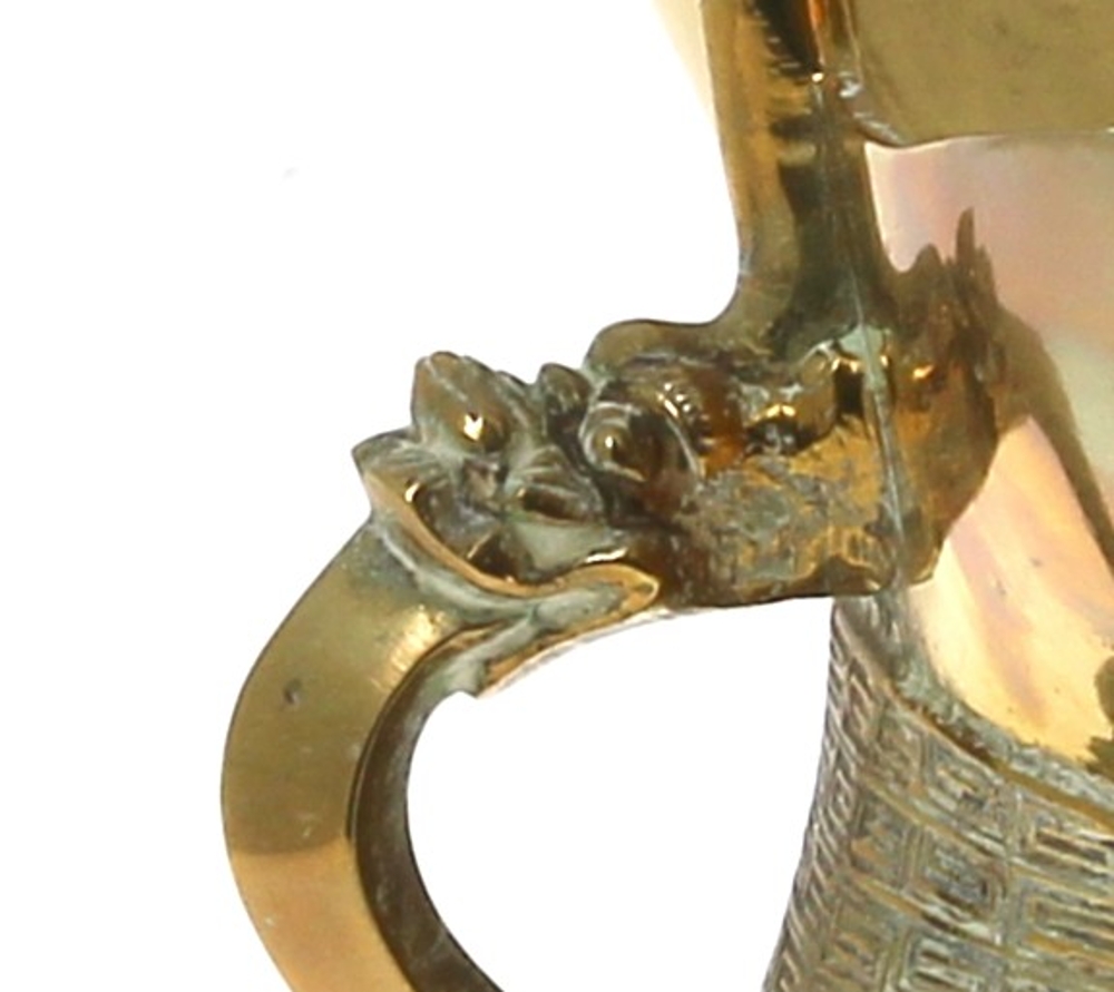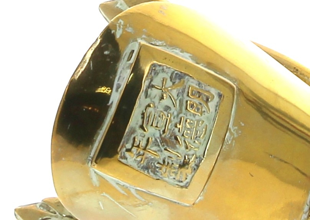 CHINE – Coupe libatoire en bronze doré tripode à l’imitation de la vaisselle archaïque décorée d’une frise ciselée et d’un oiseau en vol, anse à tête de chien de fô, marque appliquée sur la panse. Fin XIXe siècle. H 24 cm (légère déformation à une extrémité du col)