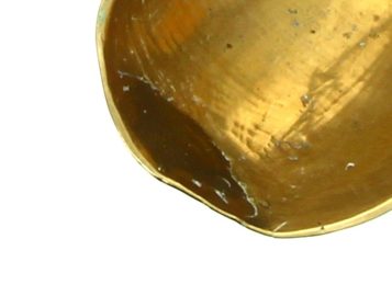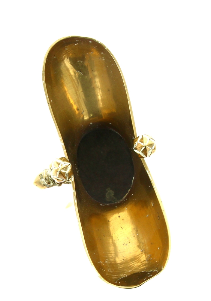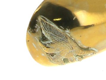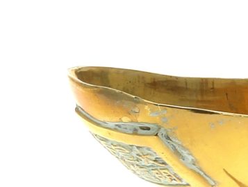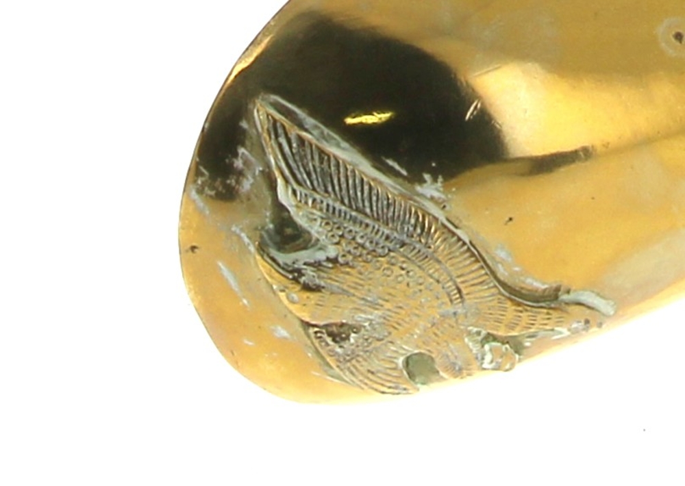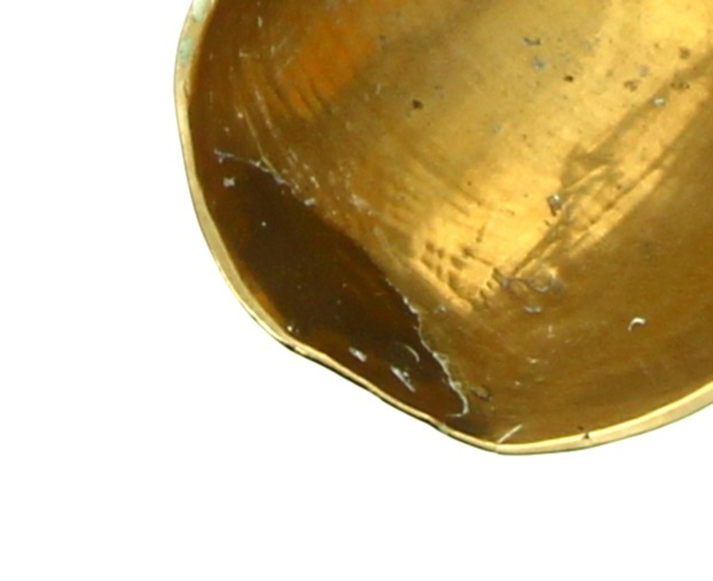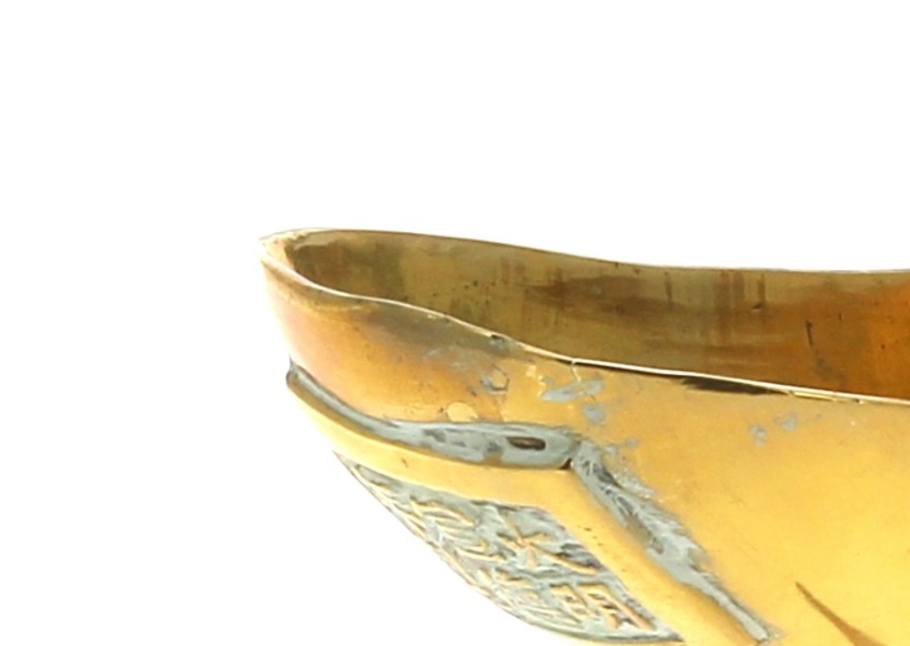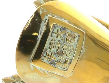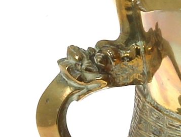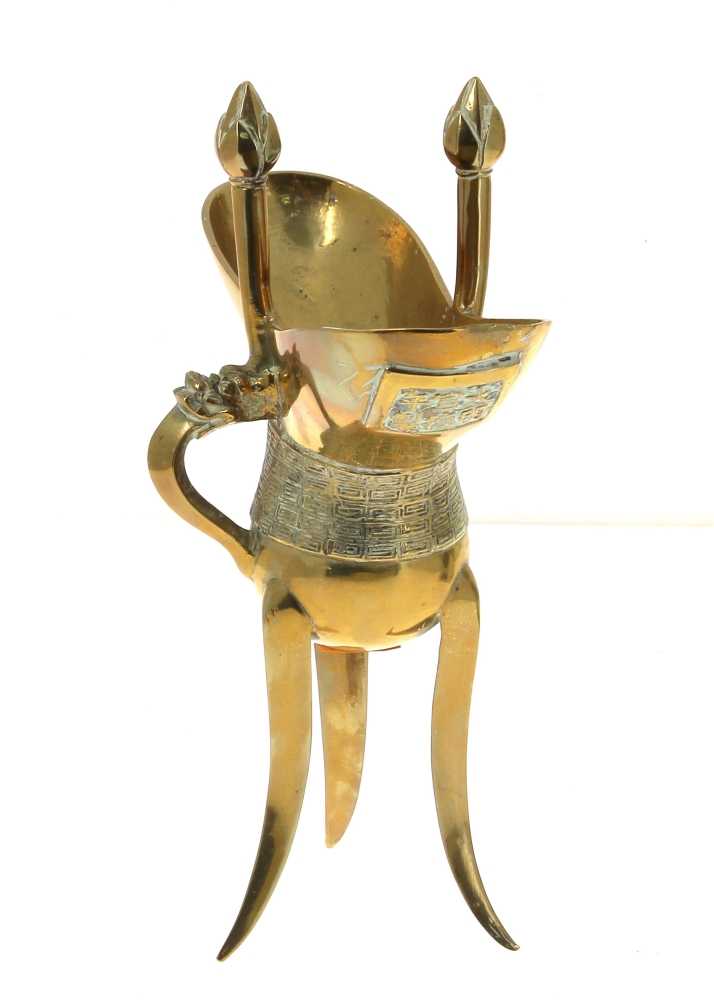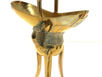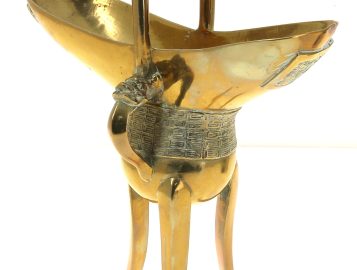 CHINE – Coupe libatoire en bronze doré tripode à l’imitation de la vaisselle archaïque décorée d’une frise ciselée et d’un oiseau en vol, anse à tête de chien de fô, marque appliquée sur la panse. Fin XIXe siècle. H 24 cm (légère déformation à une extrémité du col)