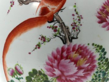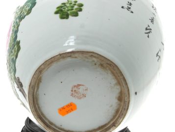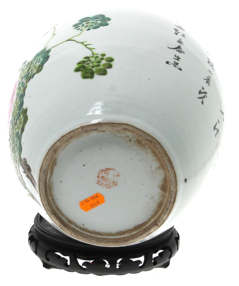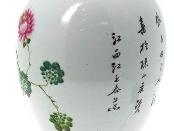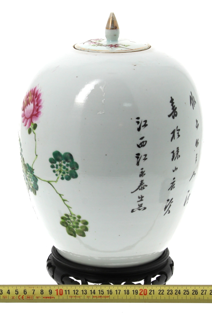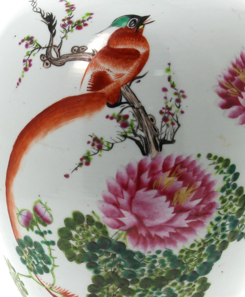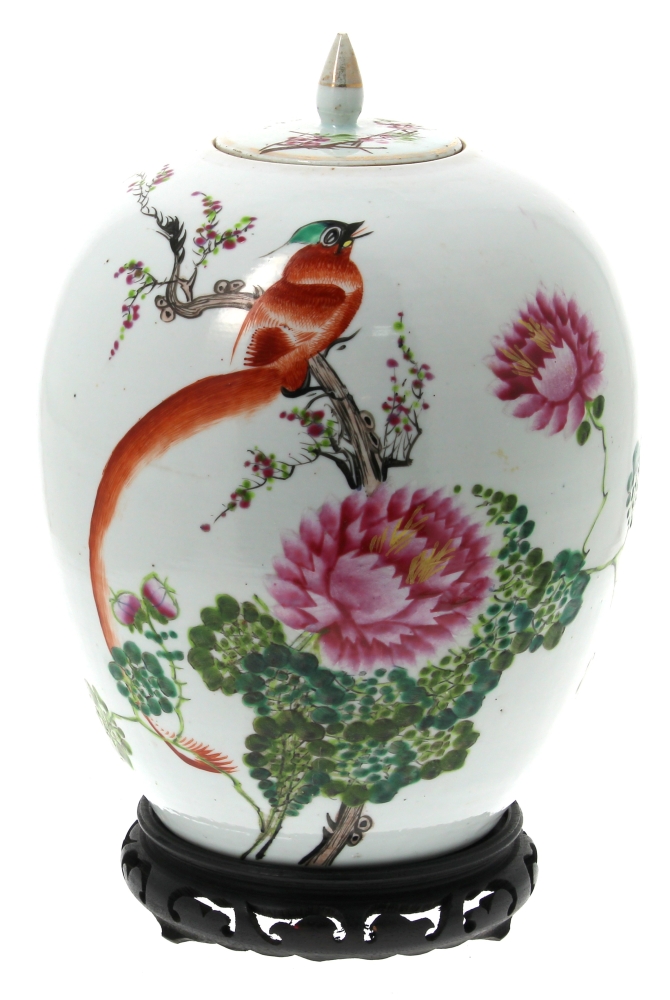 CHINE début XXe s. – Pot à gingembre en porcelaine de forme ovoïde avec couvercle, à décor polychrome d’un oiseau perché sur une branche fleurie, parmi des pivoines, calligraphies au revers. H 30,5 cm
