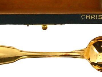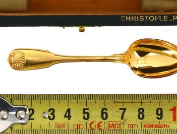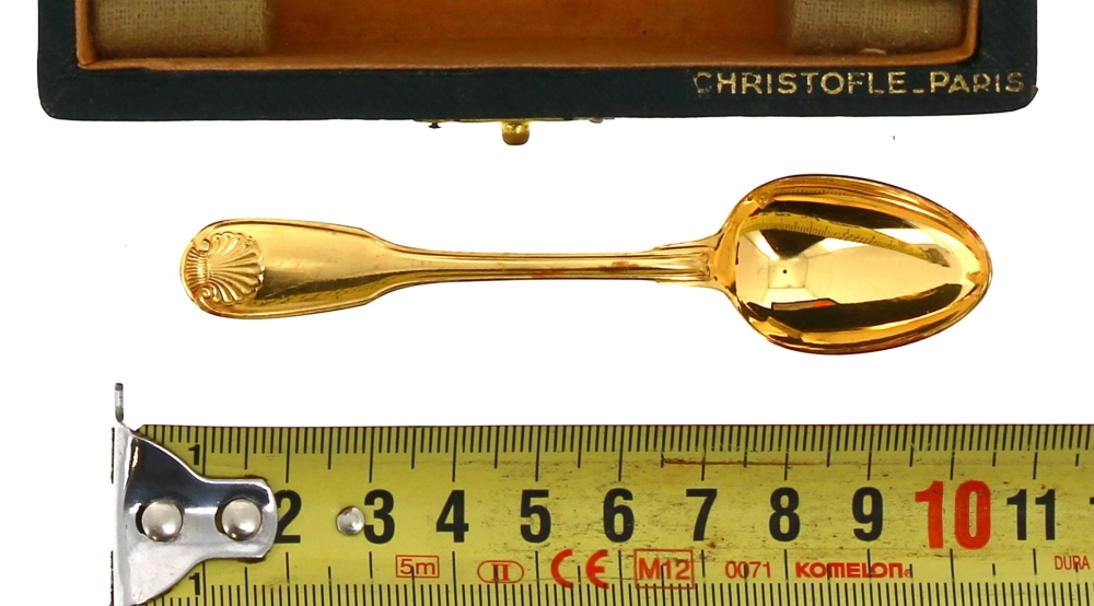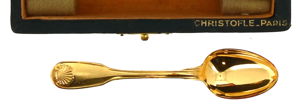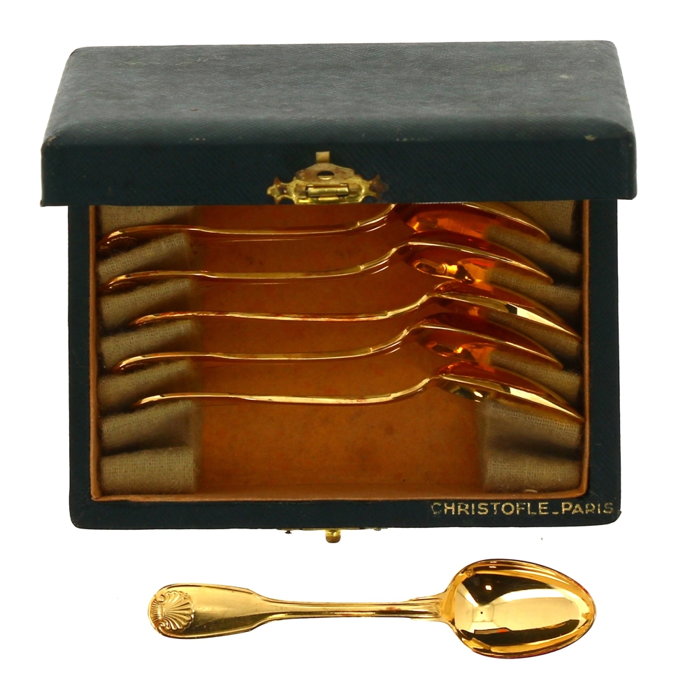 CHRISTOFLE – Modèle « Vendôme » – 6 cuillères à moka en métal doré, décor coquilles (en écrin vert de la marque)