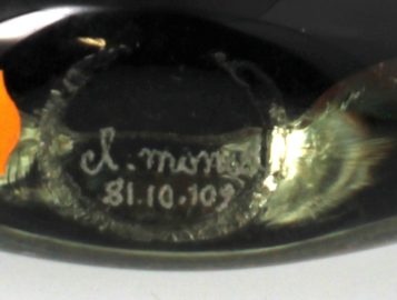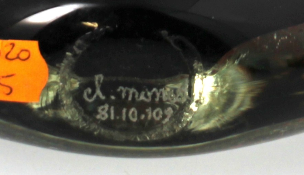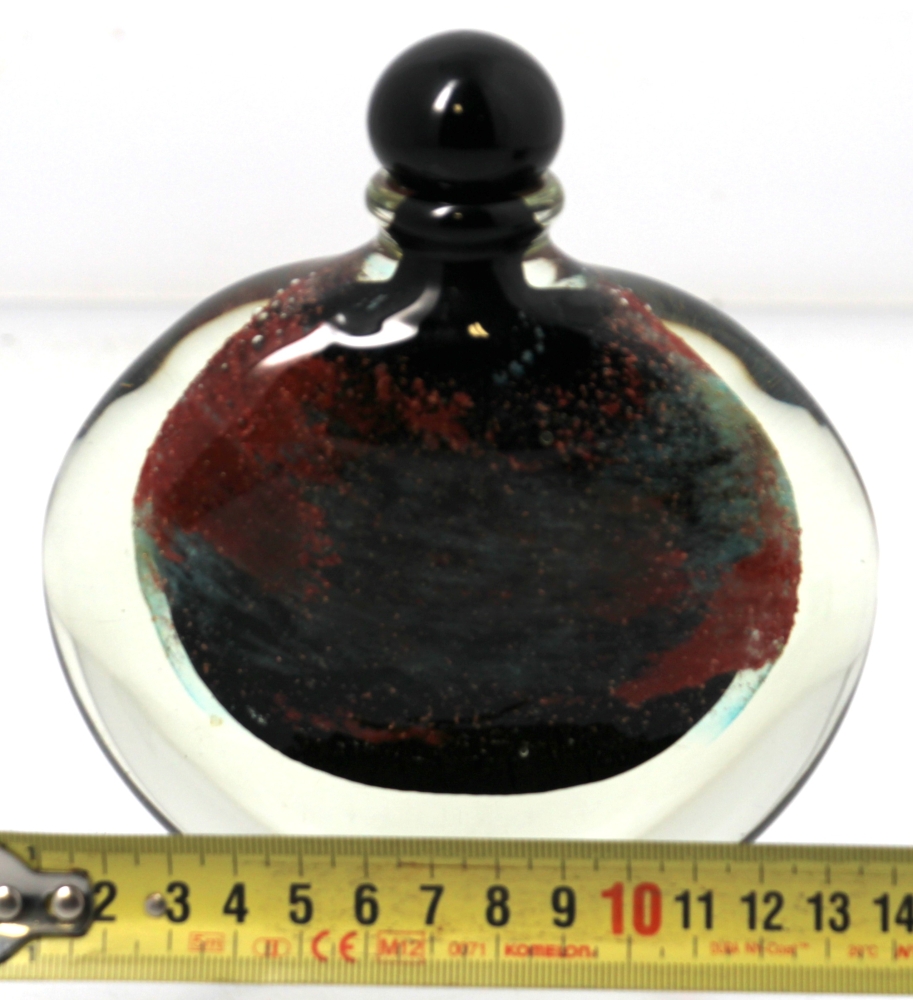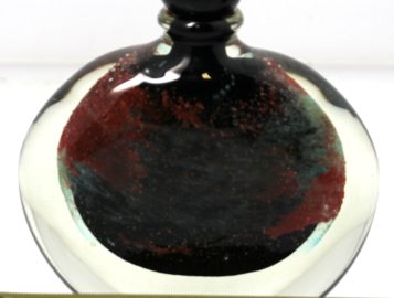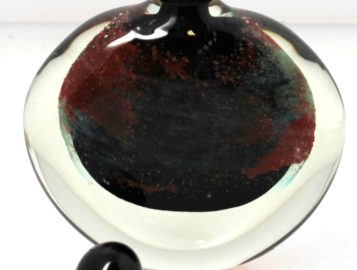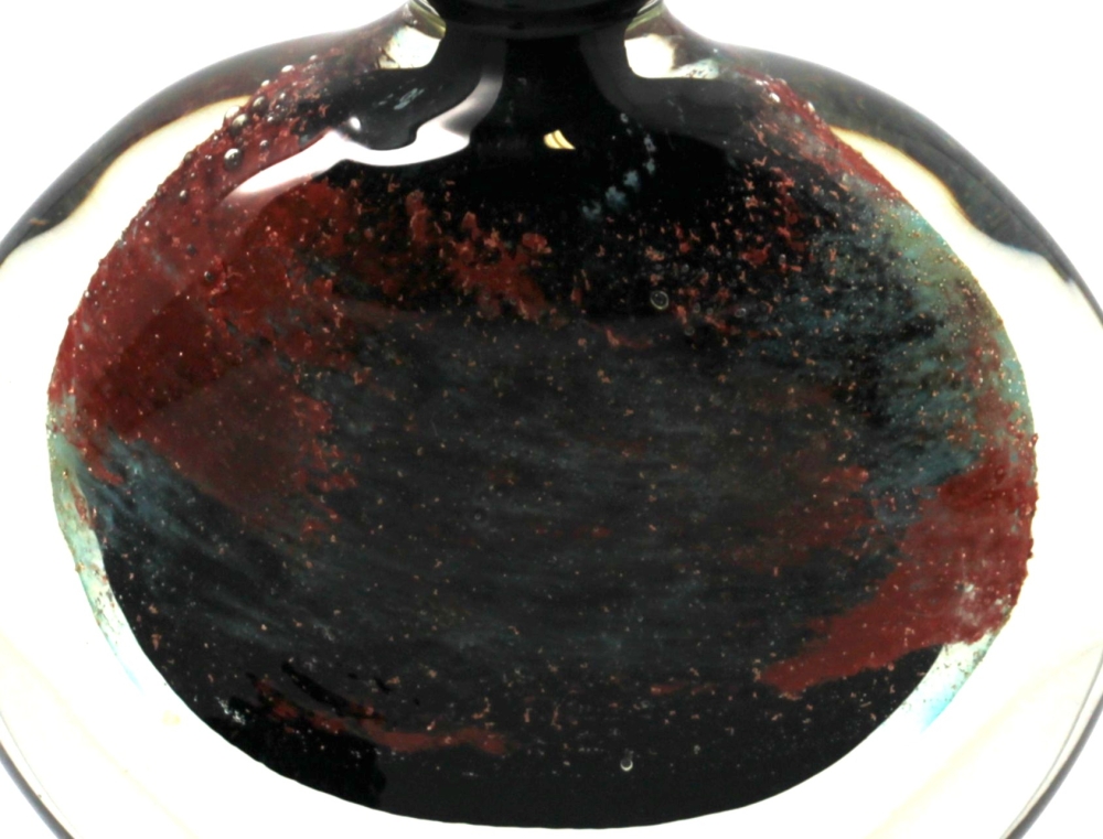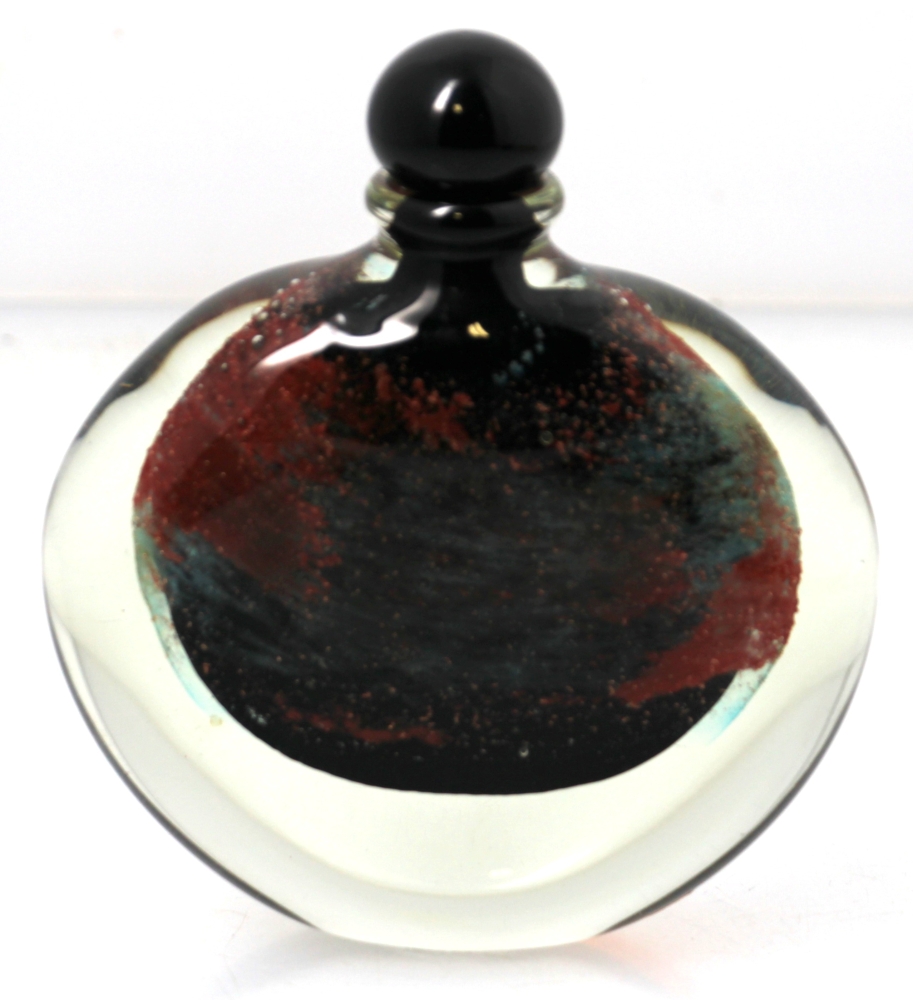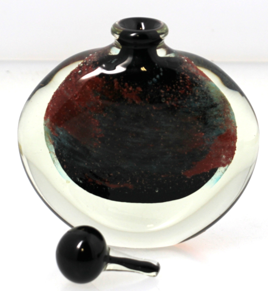 Claude MONOD (1944-1990) – Flacon plat en verre à décor d’inclusion en verre noir, rouille et vert, signé Cl. MONOD . H : 14,5 cm.
