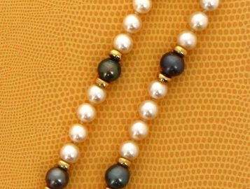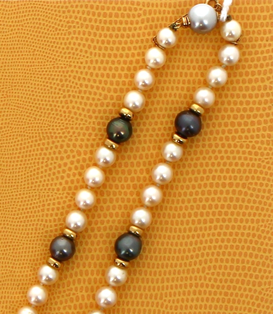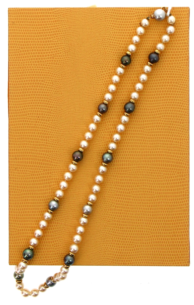 Collier de 51 perles de culture, intercalées avec 13 perles de Tahiti avec nuances de couleurs, intercalaires en or jaune, fermoir et chaînette de sécurité en or jaune 18 cts, poinçon tête d’aigle (Provenance Accurso à Quimper)