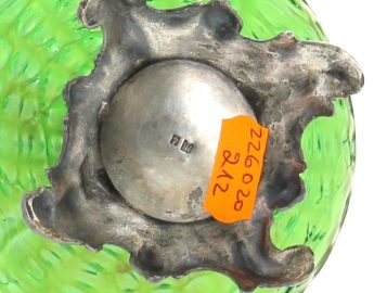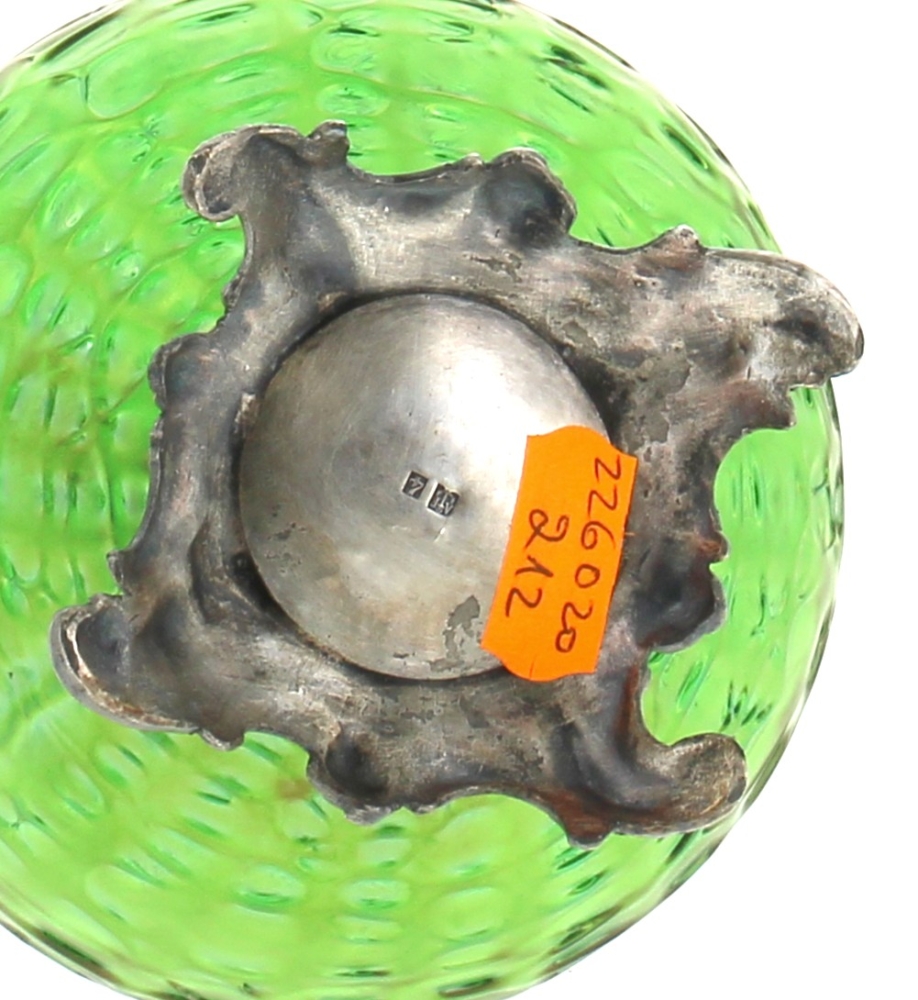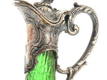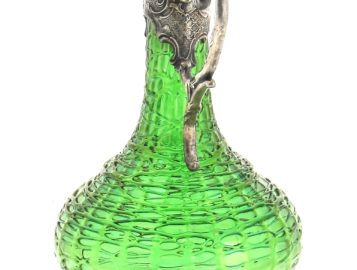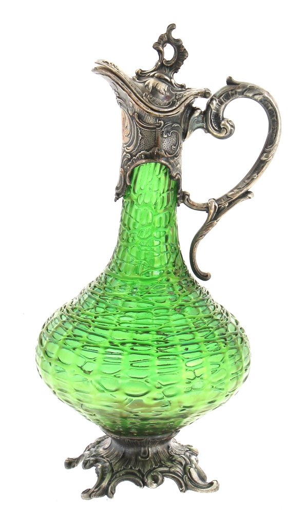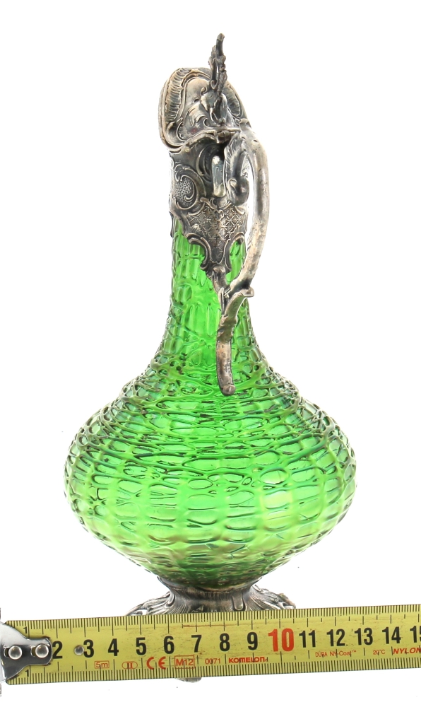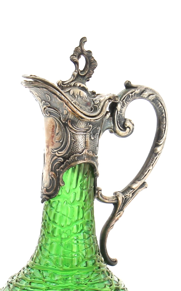 Dans le goût de LOETZ – Petite aiguière en verre verre irisé, col, anse et base en métal argenté à décor rocaile, maître orfèvre Armand FRENAIS. H 24 cm