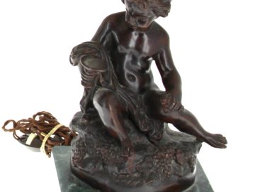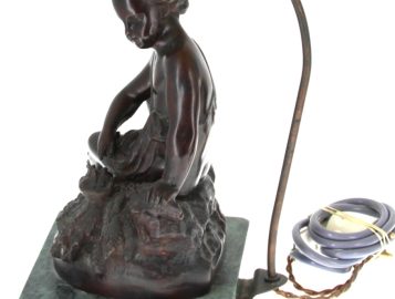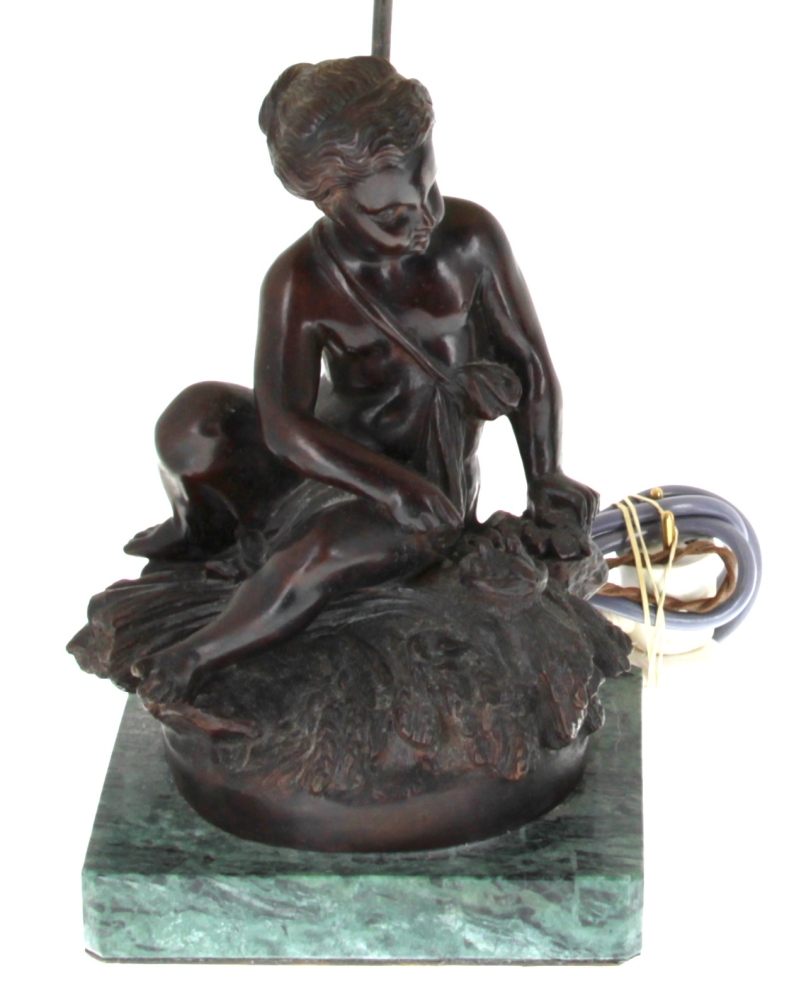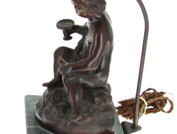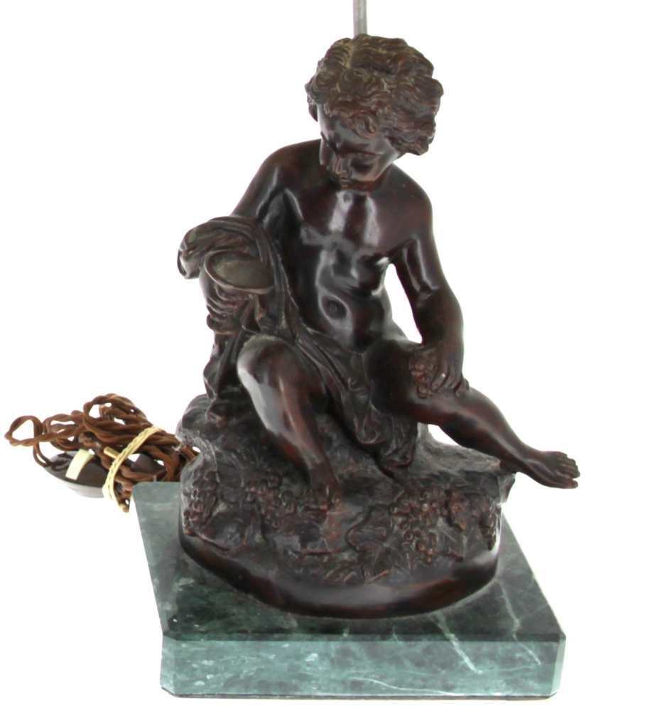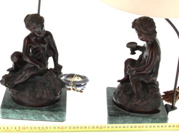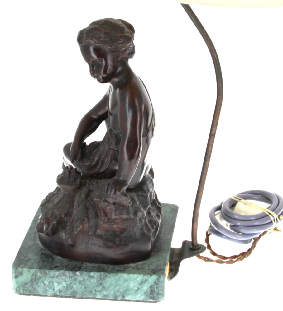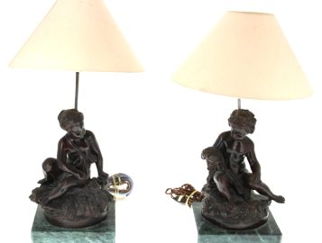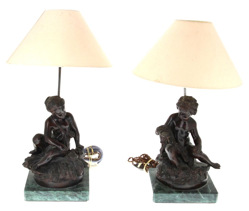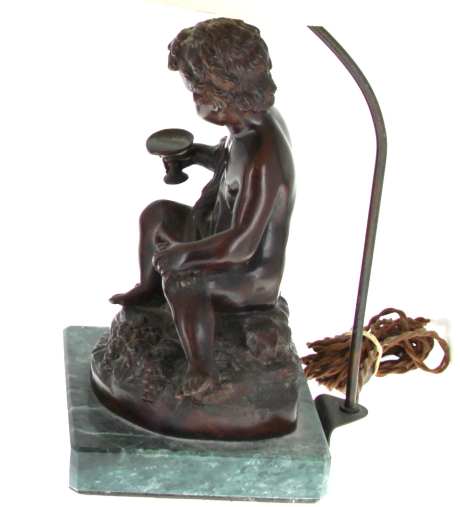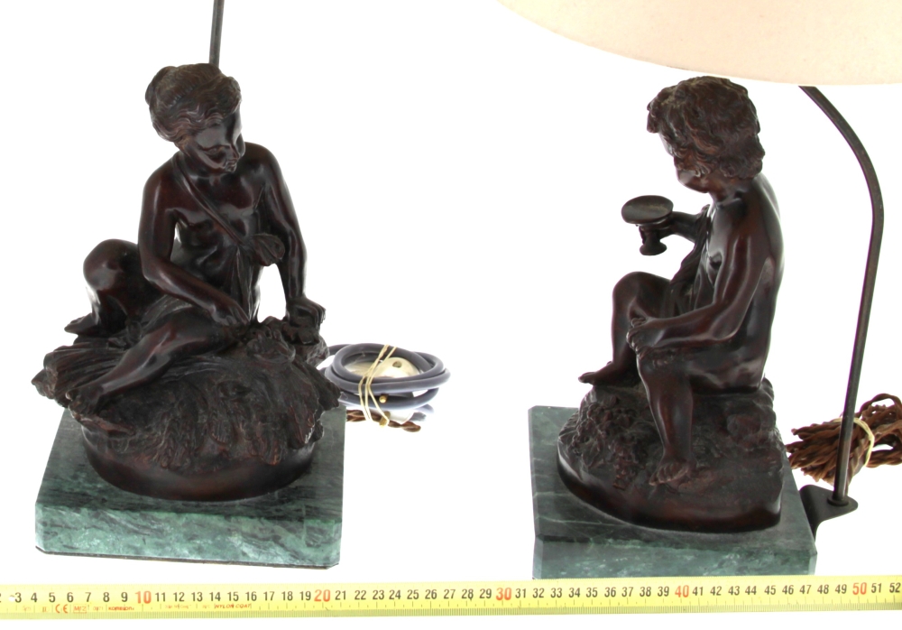 D’après MOREAU « Putti au nid » et « Putti à la coupe », paire de bronzes à patine médaille, signés sur la terrasse, socle en marbre vert, H 28 cm, montés en lampe Hteur totale 50 cm env.