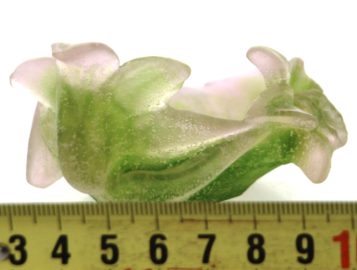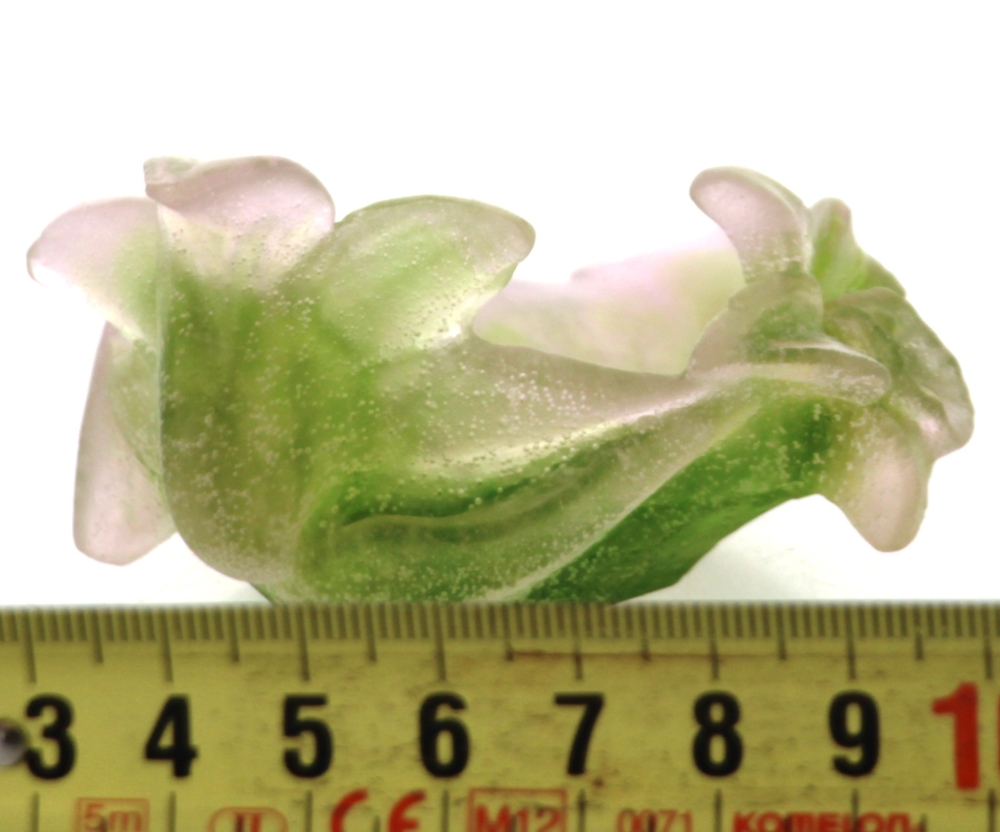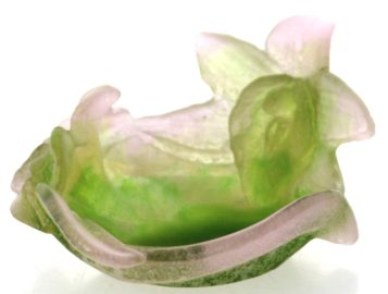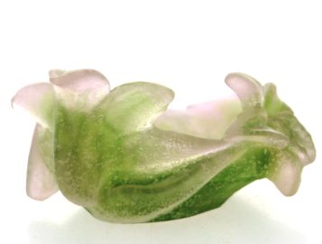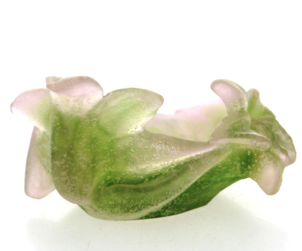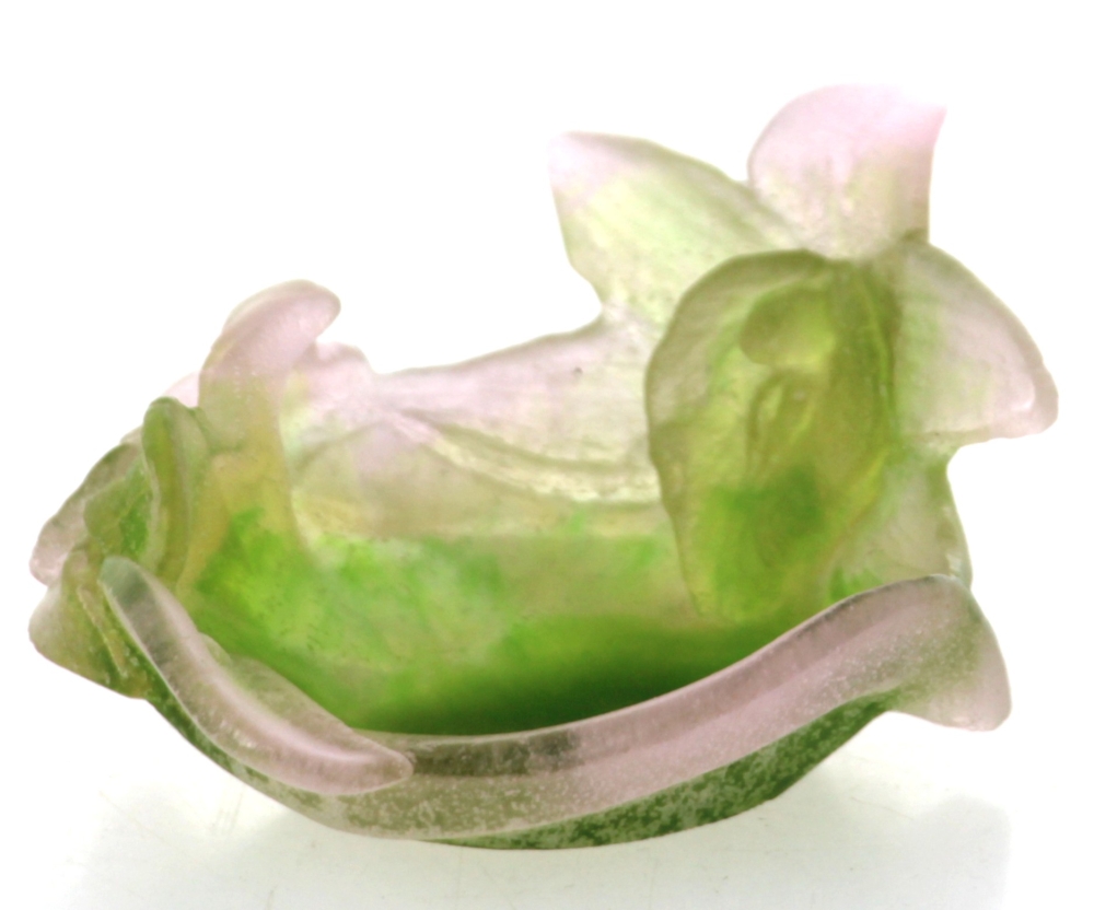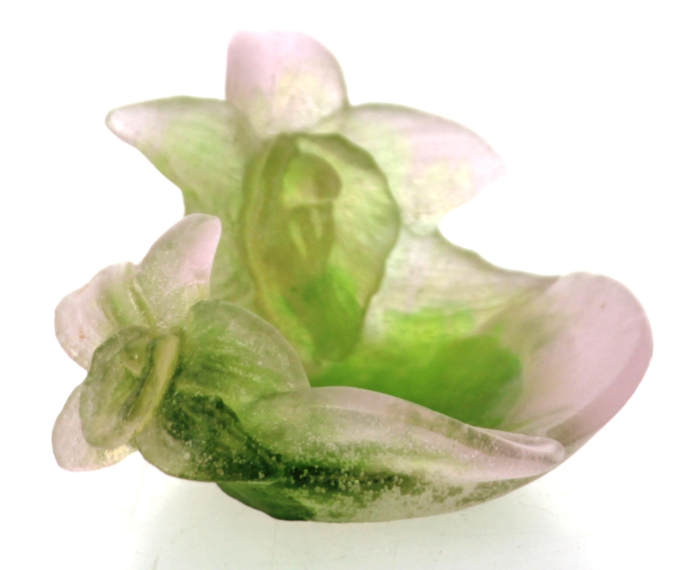 DAUM France – Petite coupelle en pâte de verre teintée rose et vert à décor d’orchidées, marquée « Daum France ». 7,5 x 8,5 cm environ