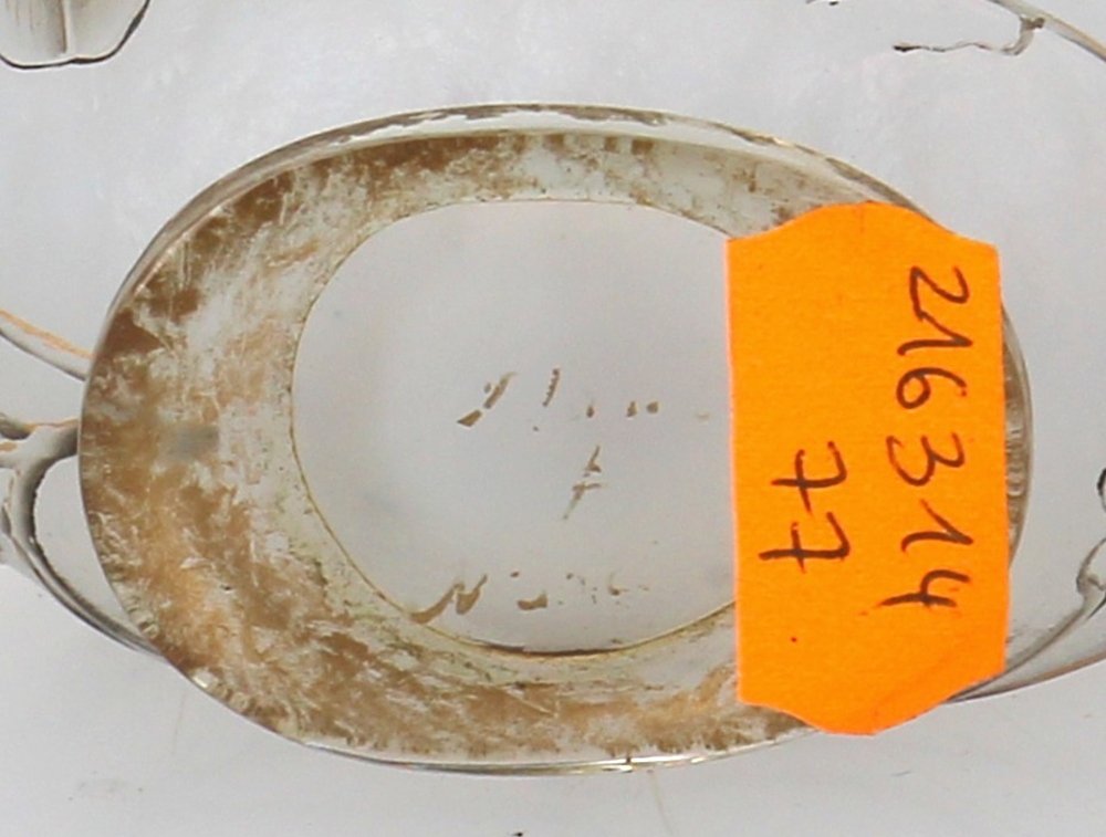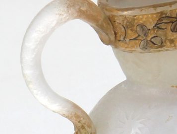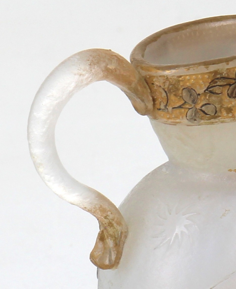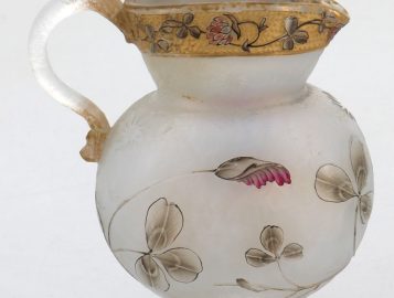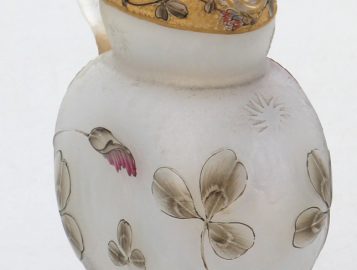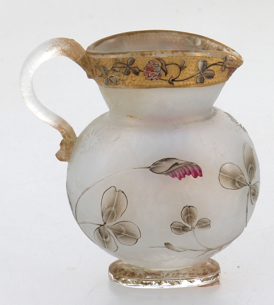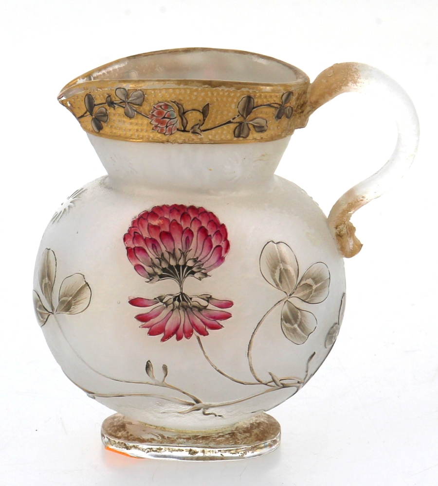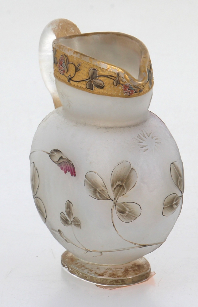 DAUM Nancy Croix de Lorraine – Pichet miniature en verre, décor gravé et émaillé de trèfles et fleurs. Signé. Haut. 9,5 (restauration)