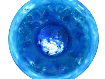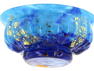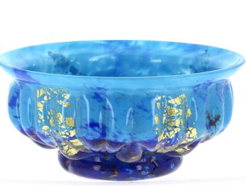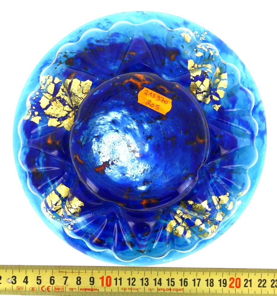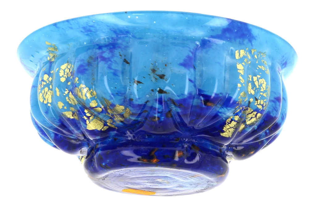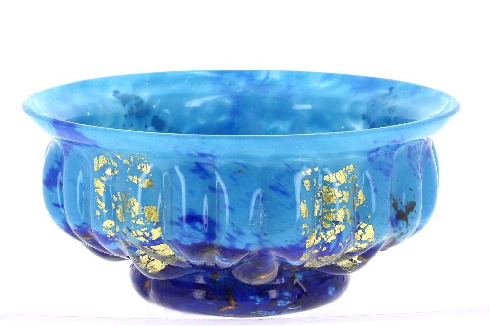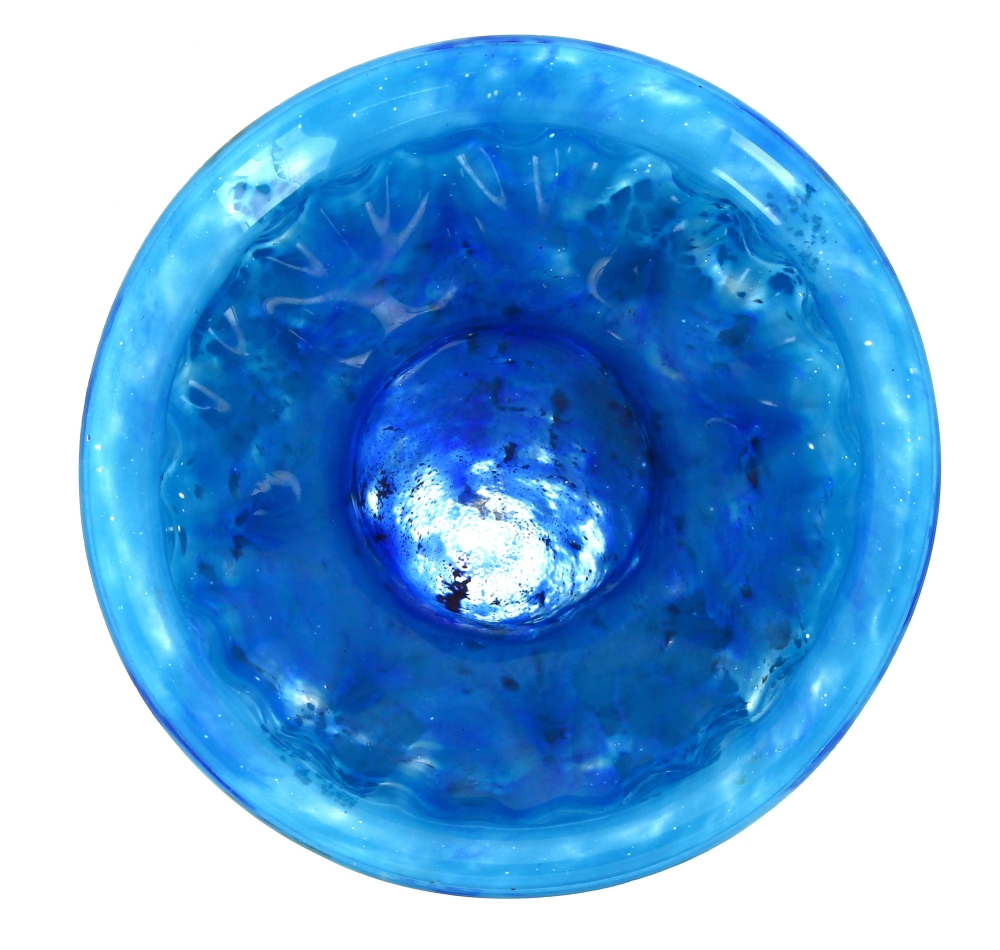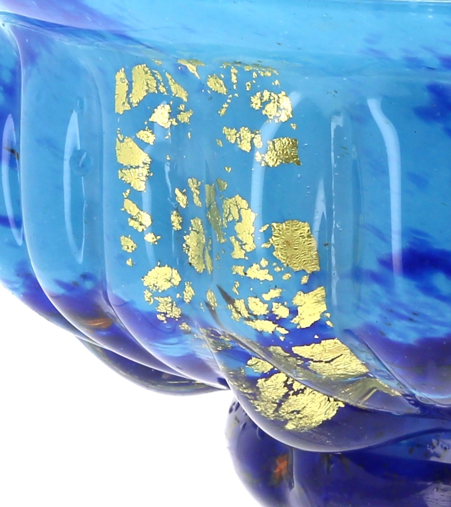 DAUM Nancy et MAJORELLE – Coupe sur talon, à corps godronné, en verres bleu marbré et paillons or. H 9 x diam. 20 cm