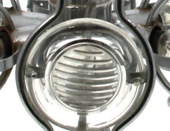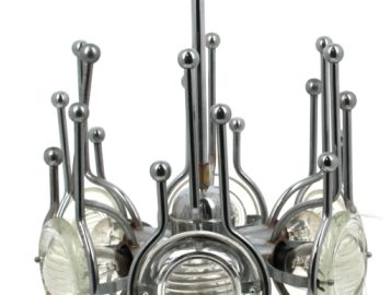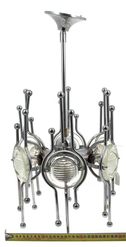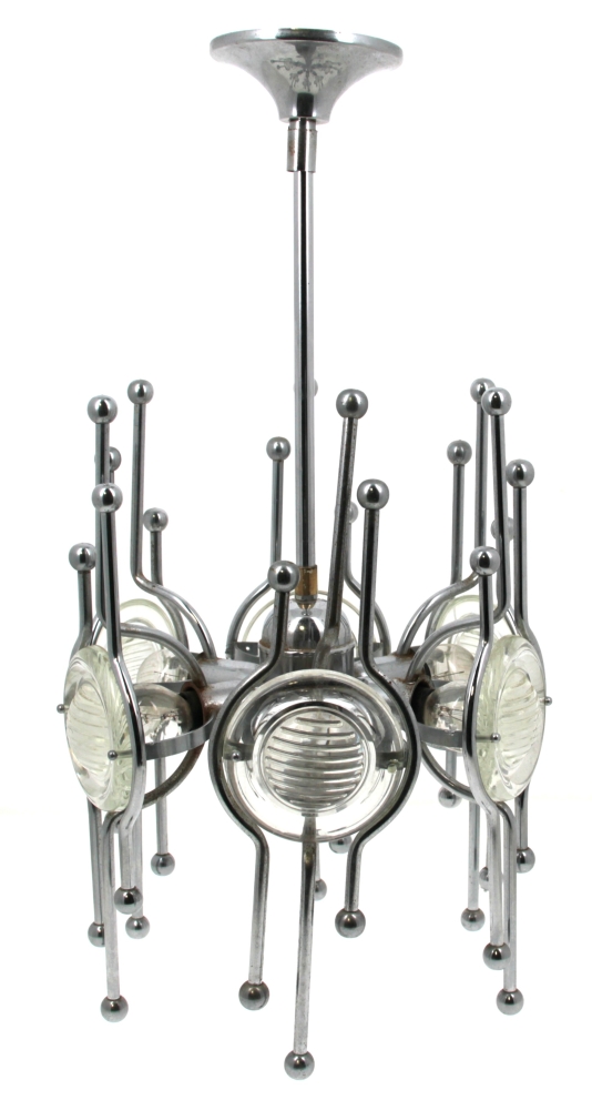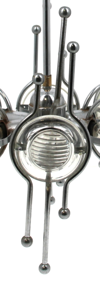 Design Italien, dans le goût de Gaetano SCIALARI – Suspension années 60/70 à 6 bras de lumière en métal chromé à motifs de boules et réflecteurs en verre moulé. H 59,5 x diam. 29,5 cm (qq oxydations)