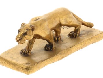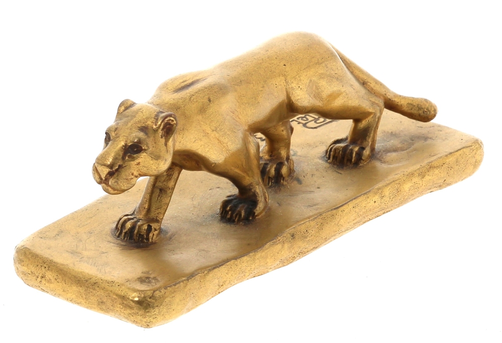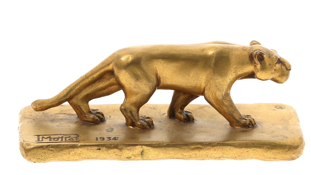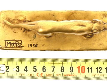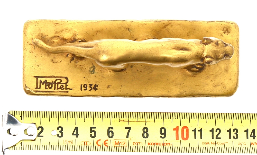 Ecole Française années 30 – « Tigre à l’affût », sujet en bronze doré signé « P. MOLLET » sur la terrasse et daté « 1934 » (actif dans les années 30, famille de joailliers à Paris). H 5 x L 12,5 x P 4,5 cm