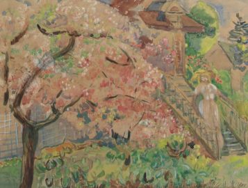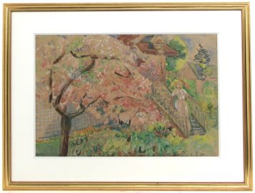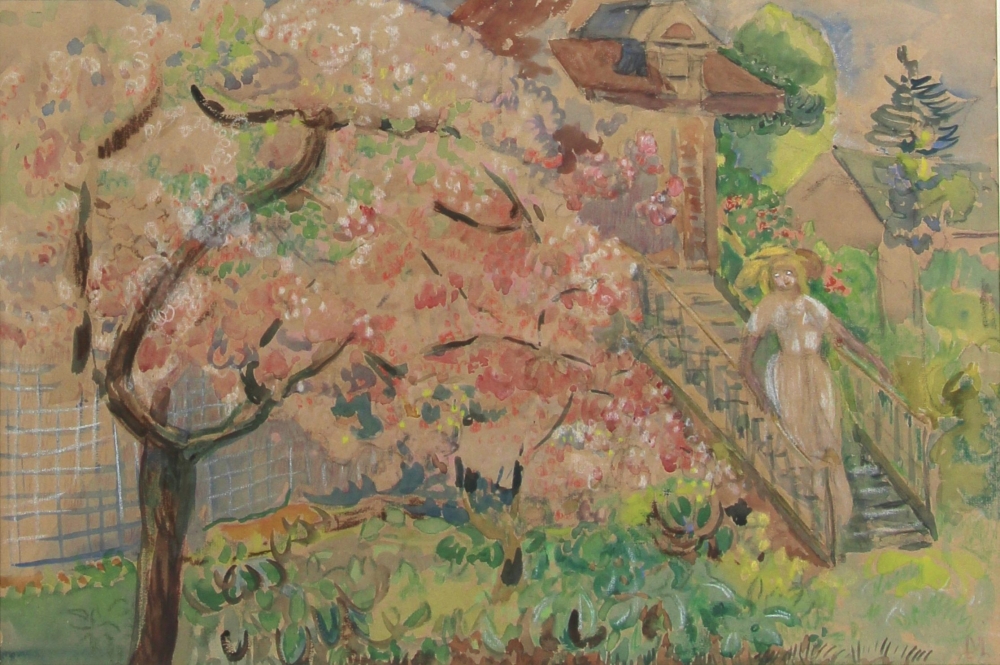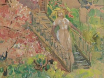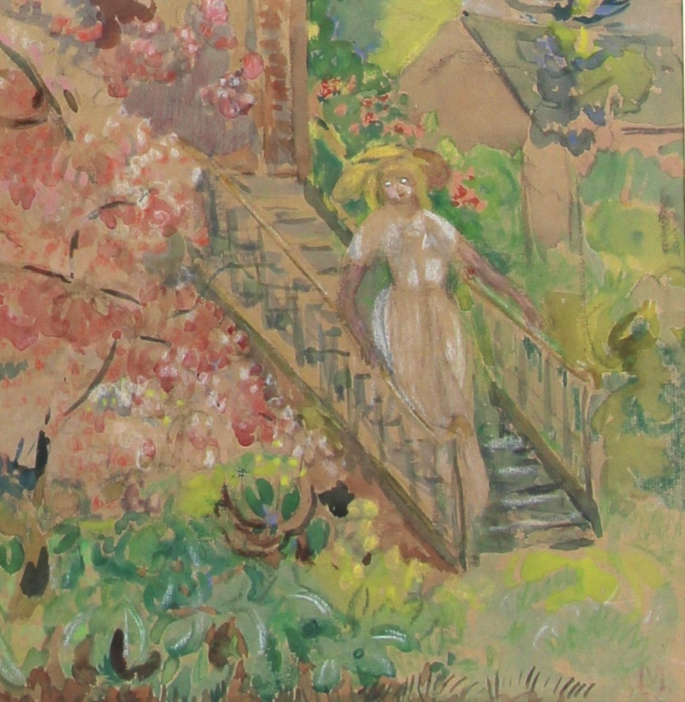 Ecole Française Xxème « Jeune femme sur l’escalier du jardin », aquarelle, monogrammée « MS » bas droite (pour Marguerite Gabrielle SÉRUSIER ? (1879-1950)), 31 x 47 cm