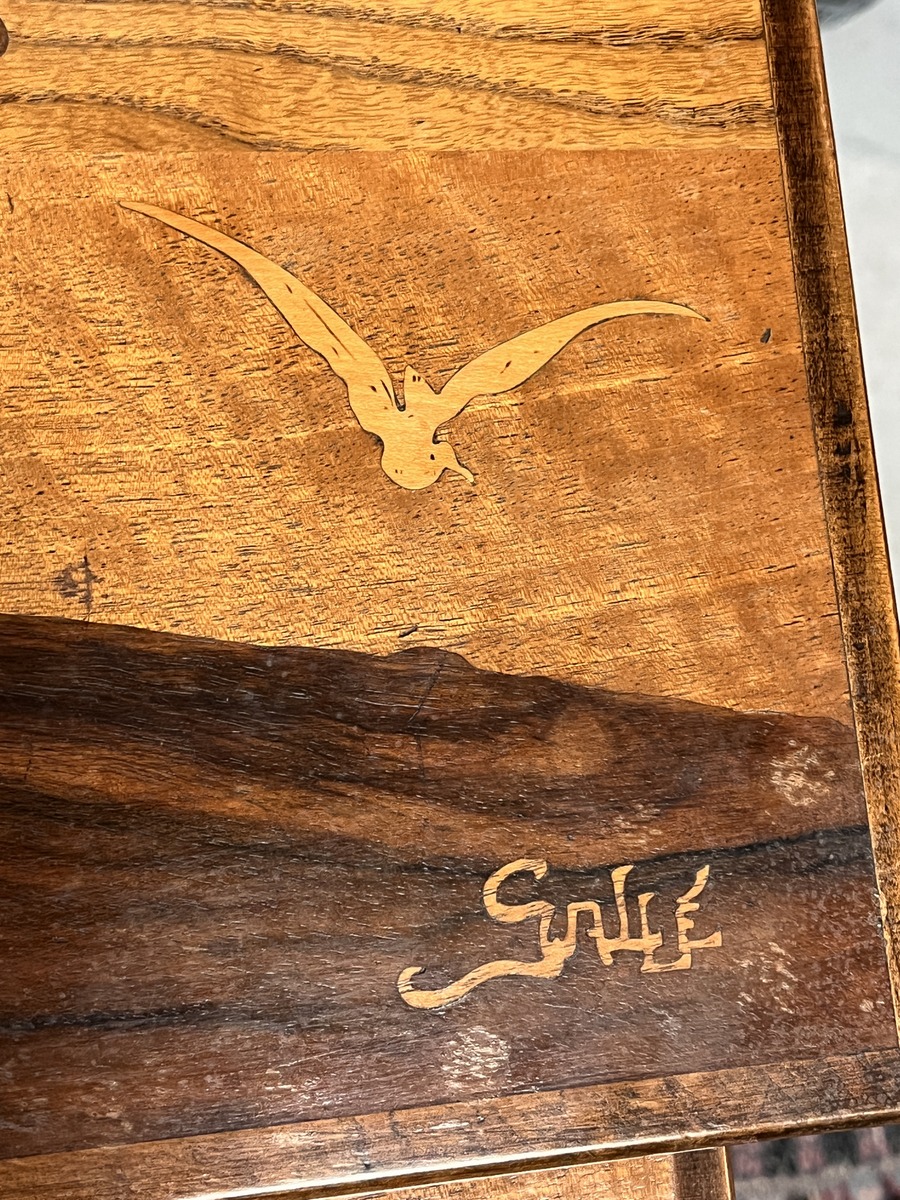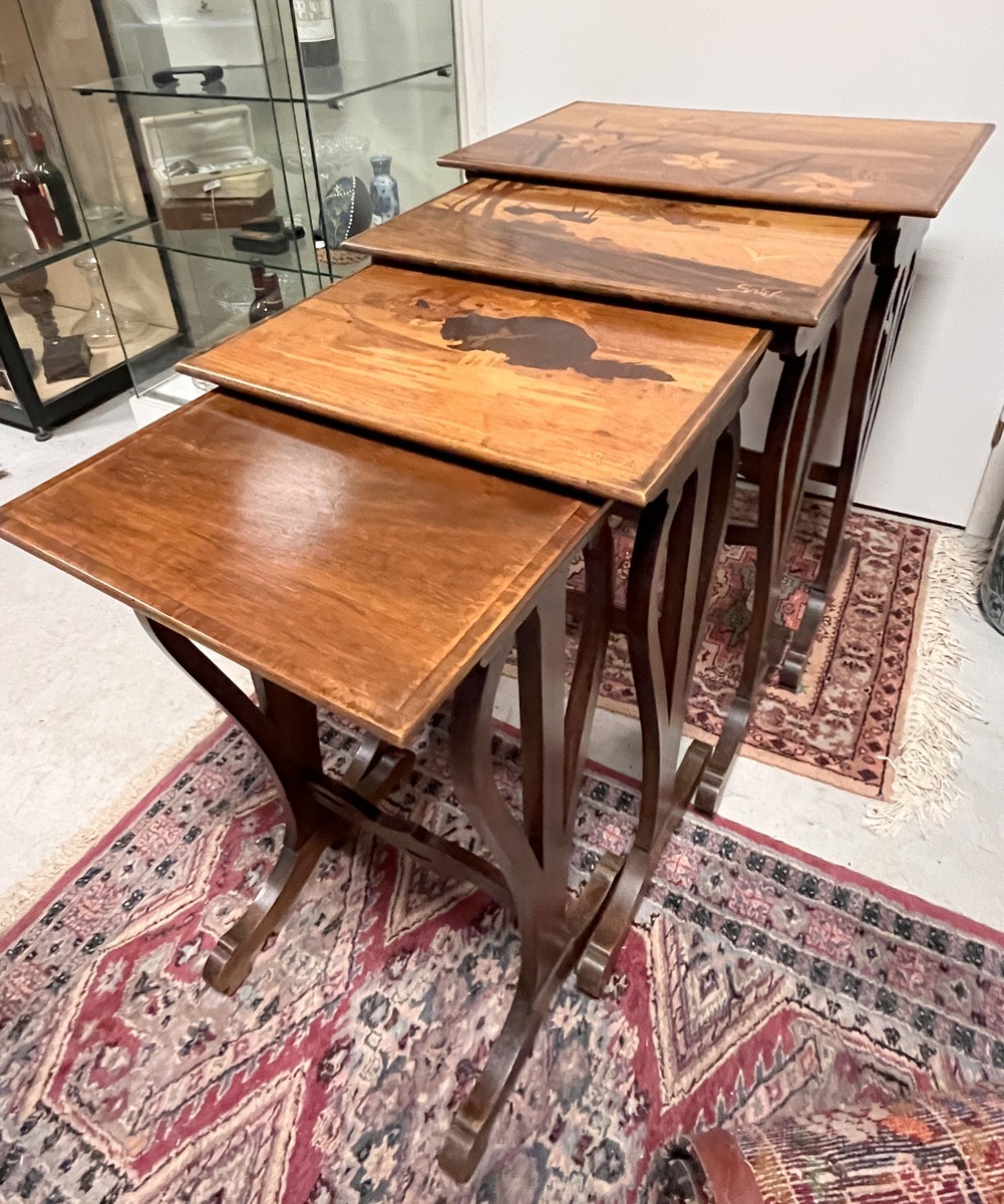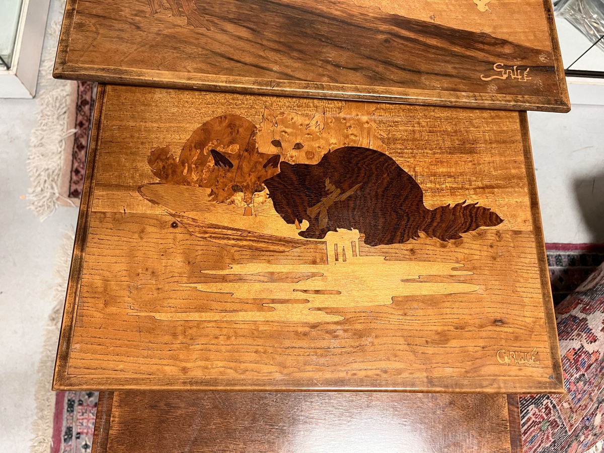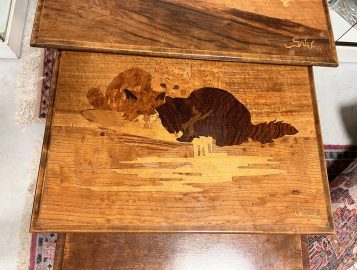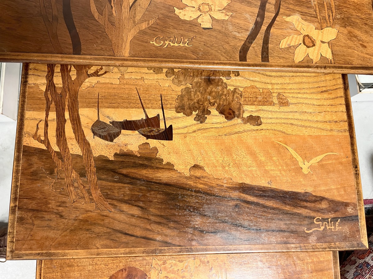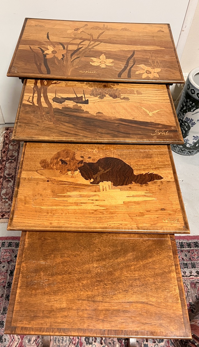 Emile GALLE, début Xxème – 4 tables gigognes en marqueterie et placage. Les trois premières sont marquetées d’un décor floral, d’une marine avec bateaux et de chats au bol de lait. Signées. Dim° de la plus grande : H 70 x L 58 x P 38 cm (petite restauration dans un angle : recollage de placage ; qq taches)
