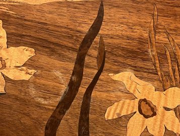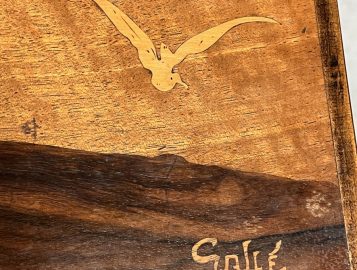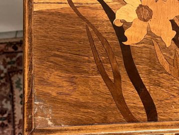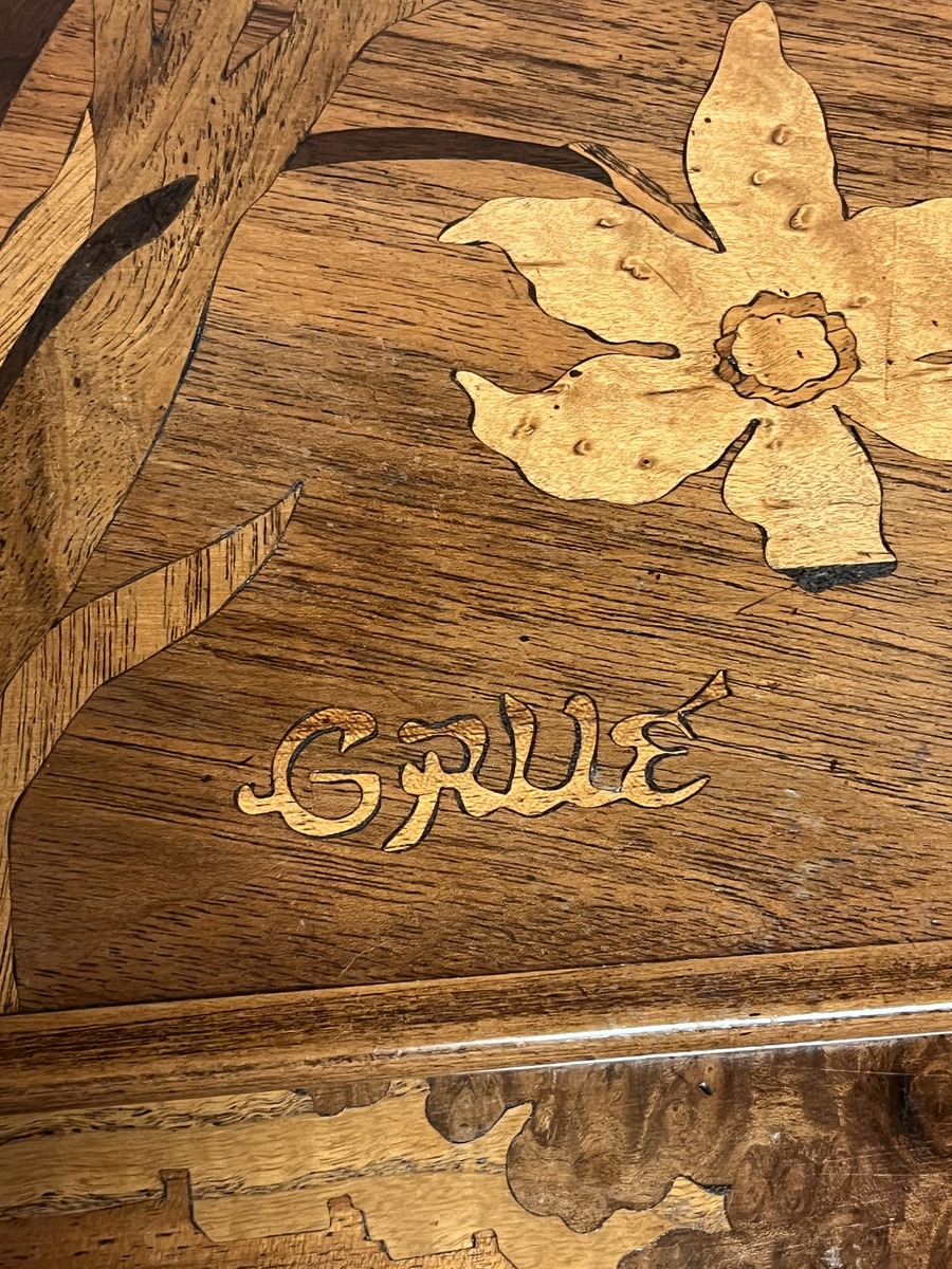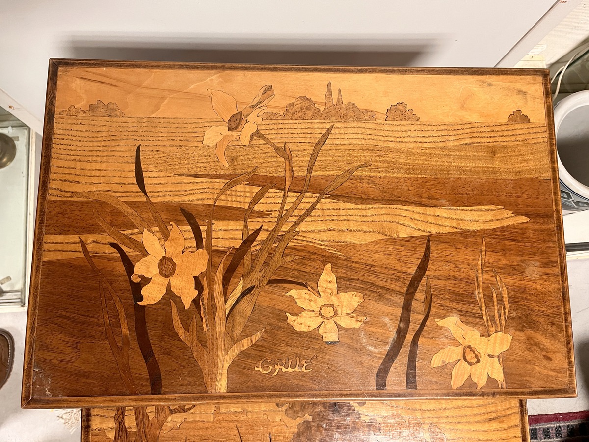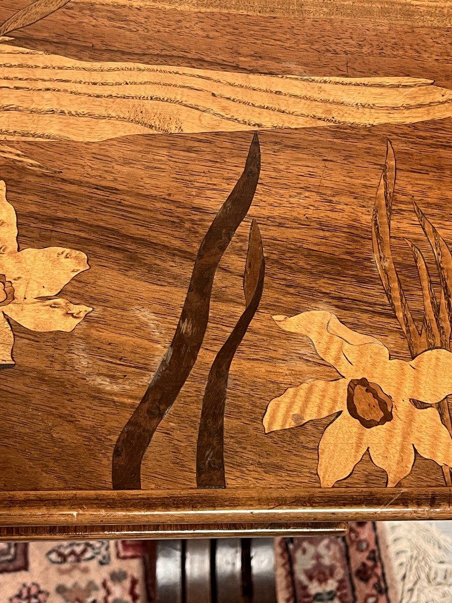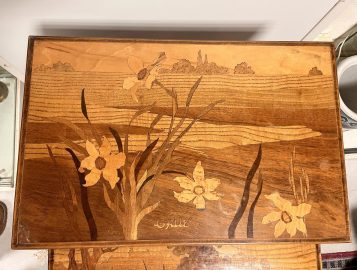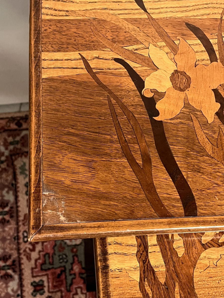 Emile GALLE, début Xxème – 4 tables gigognes en marqueterie et placage. Les trois premières sont marquetées d’un décor floral, d’une marine avec bateaux et de chats au bol de lait. Signées. Dim° de la plus grande : H 70 x L 58 x P 38 cm (petite restauration dans un angle : recollage de placage ; qq taches)