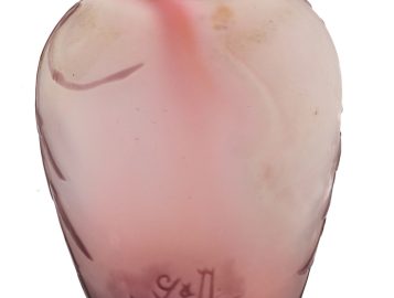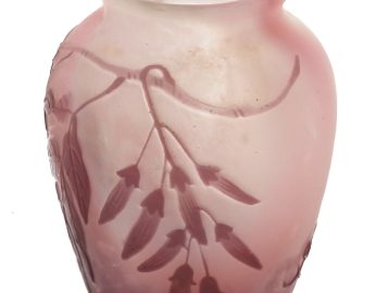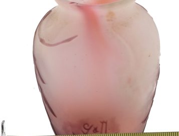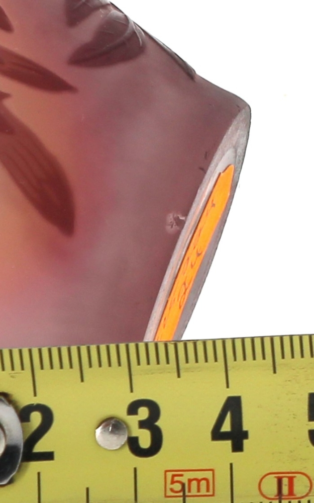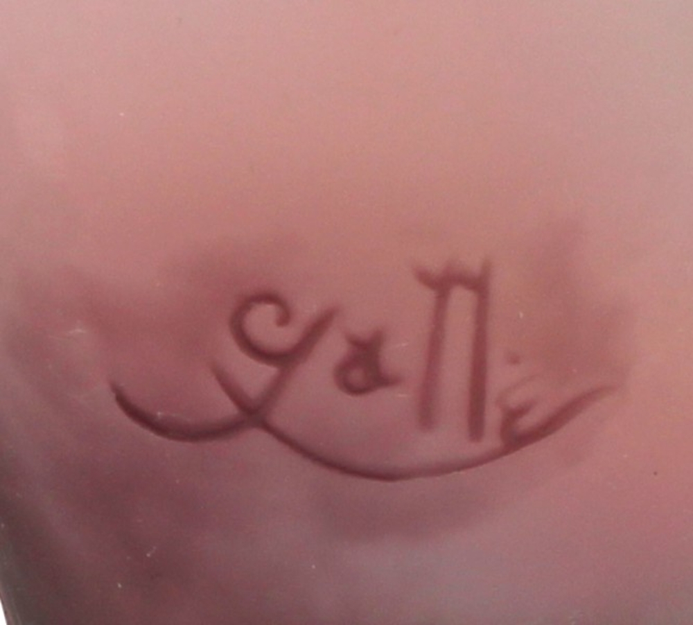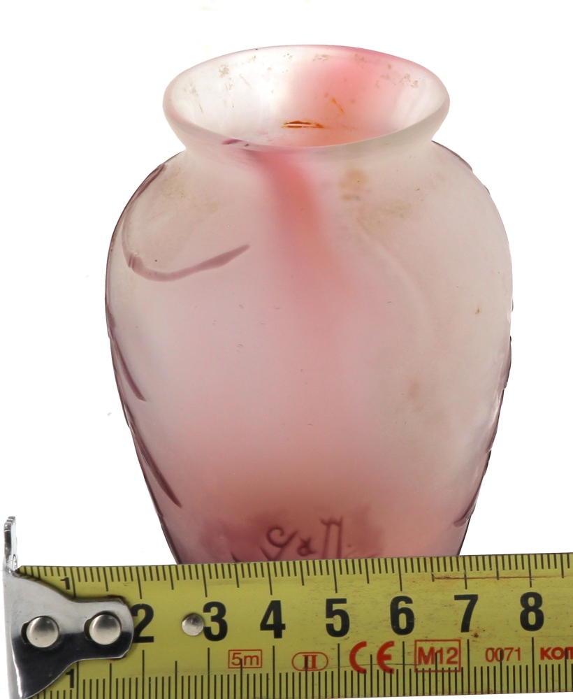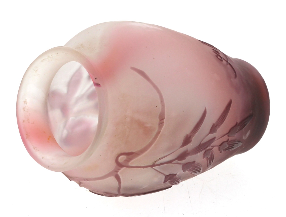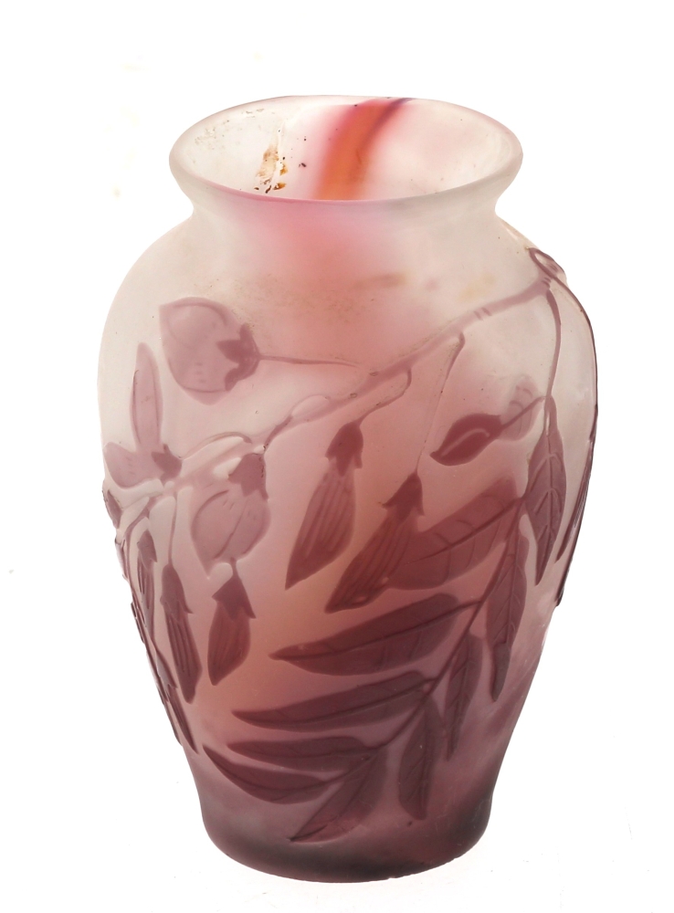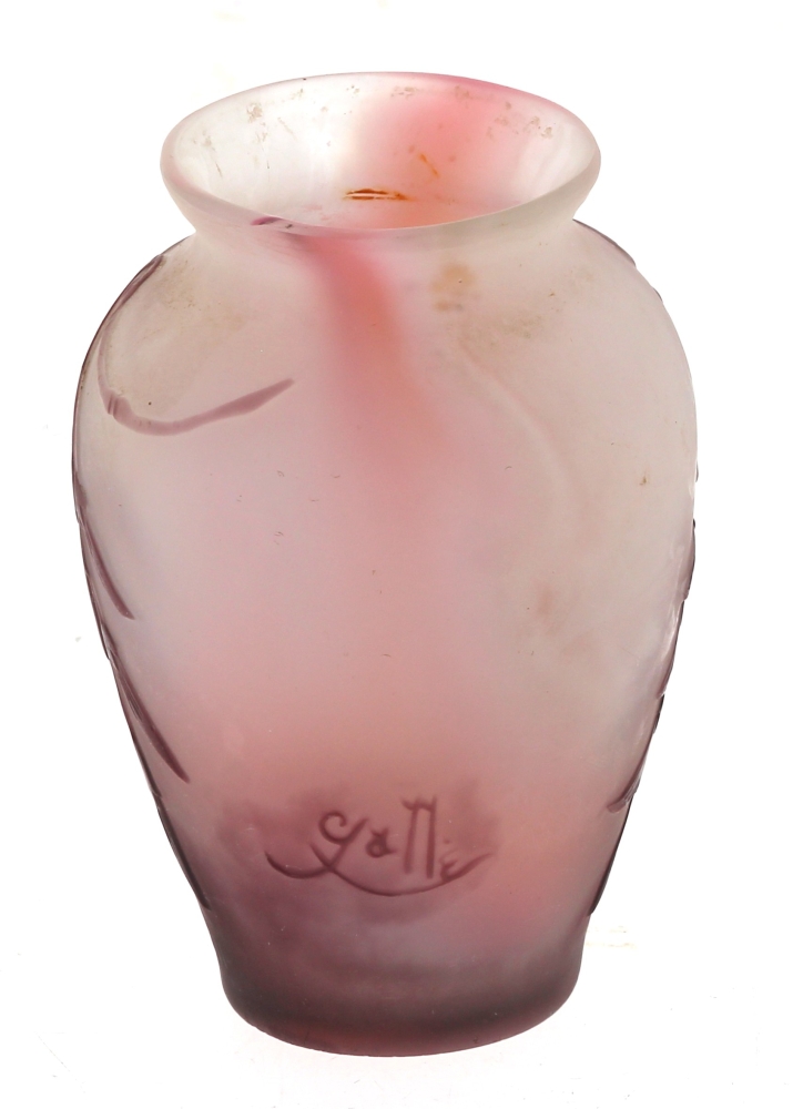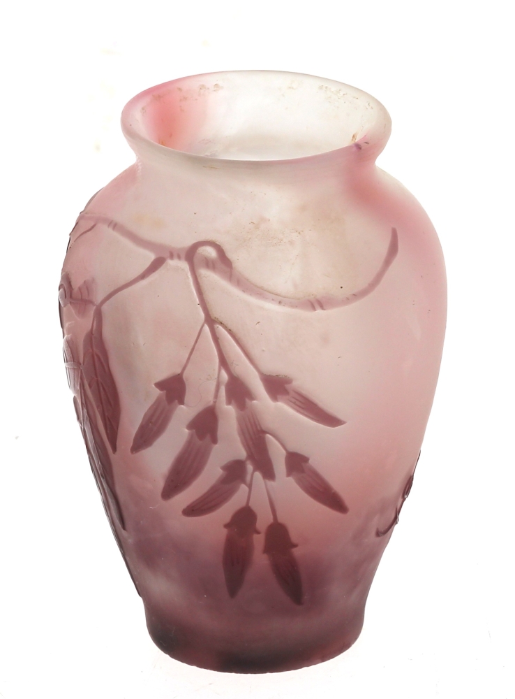 Emile GALLE – Petit vase à violettes en verre détourré à l’acide à décor végétal dans les tons mauves, H 9,5 cm (très légère égrisure à la base, col légèrement recoupé)