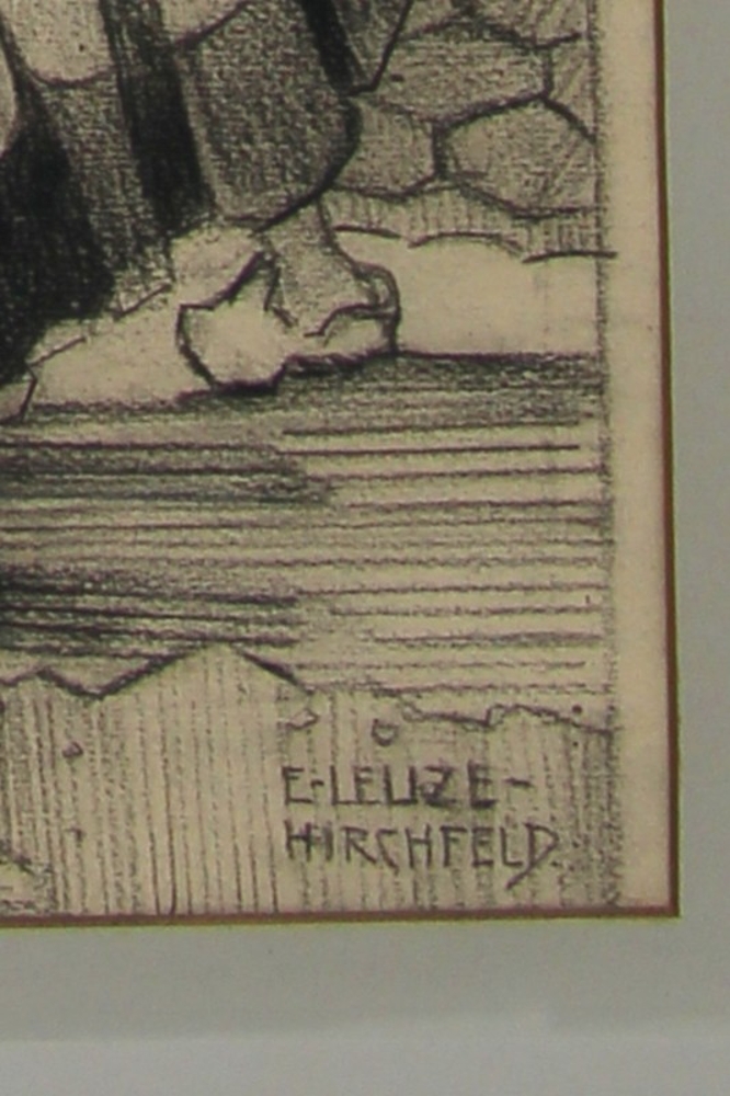 Emmy LEUZE-HIRSCHFELD (1884-1973) « Le Pardon de la Joie », dessin au fusain avec rehauts de blanc, signé bas droite et titré haut droite, 39 x 48,5 cm (légère déchirure en marge haut droite et 2 rousseurs aux angles supérieurs dans la marge blanche)
