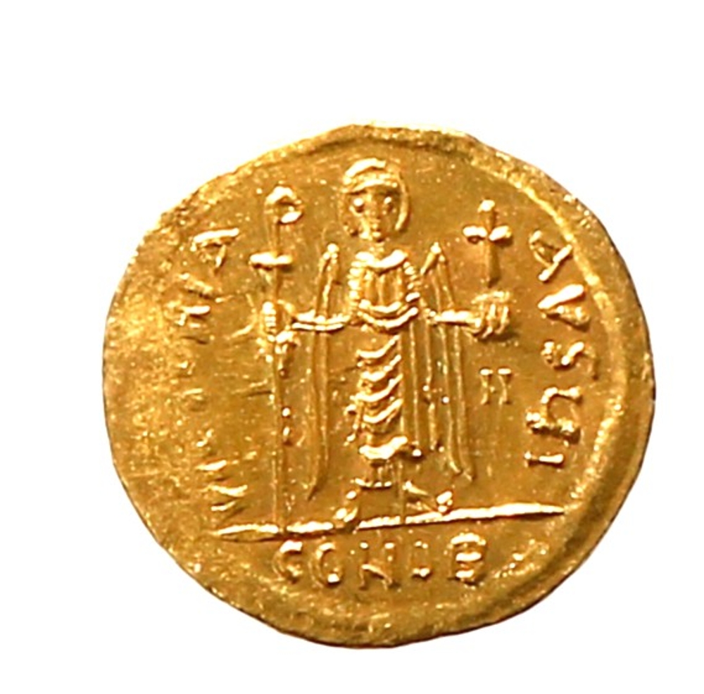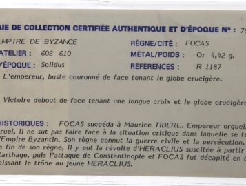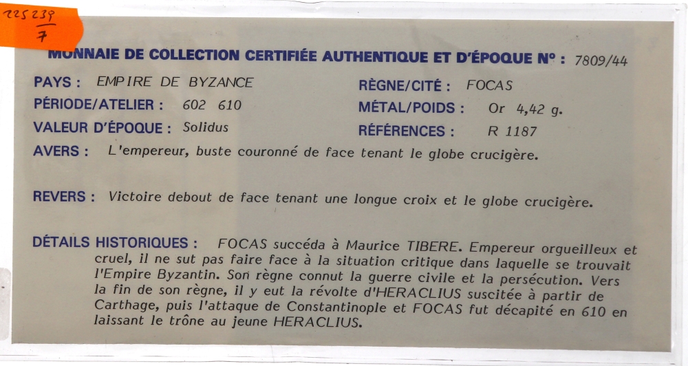 EMPIRE DE BYZANCE – Focas solidus or 602-610. Poids 4,42 grs. R. 1187.Avers: Empereur buste couronné de face tenant un globe crucigère. Revers: Victoire debout de face tenant une longue croix et le globe crucigère. TTB. Certificat d’authenticité Eric Sellier n° 7809/44