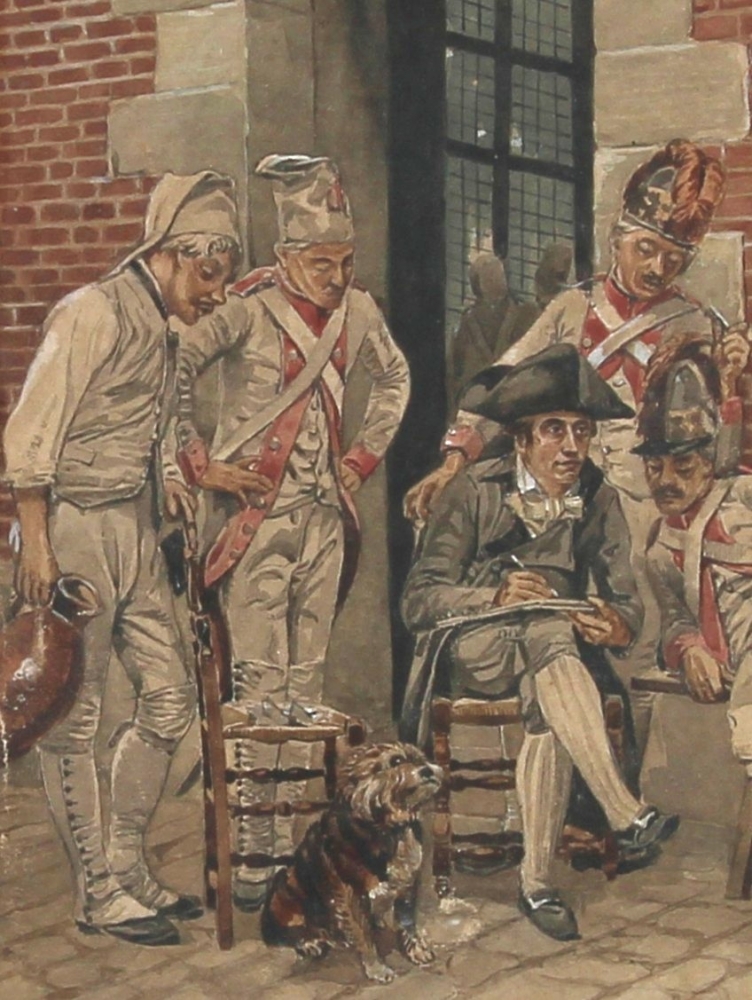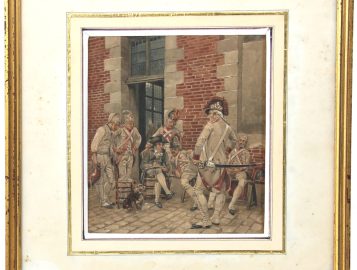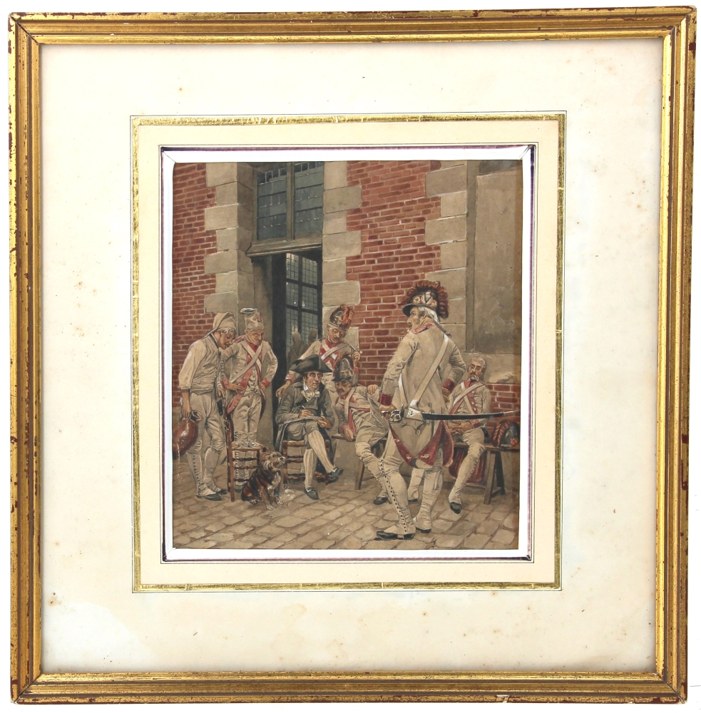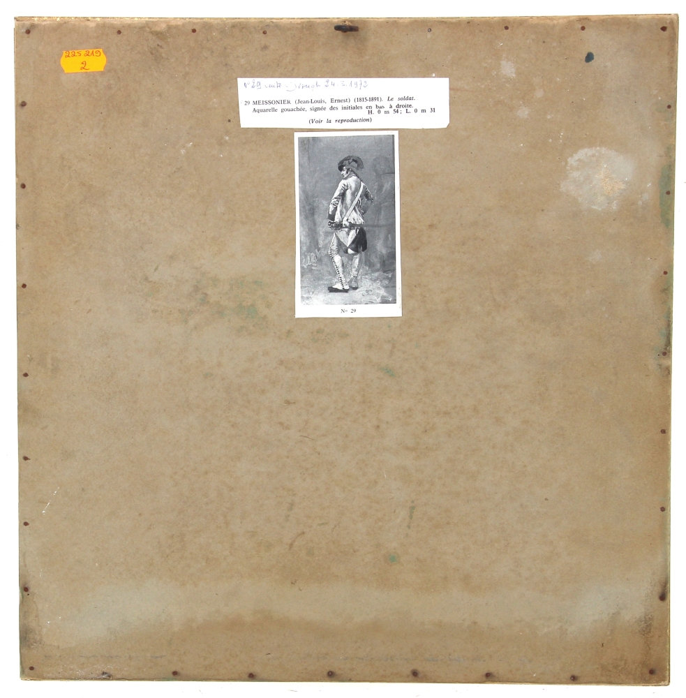 Ernest MEISSONIER (1815-1891), attribué à – « Le portrait du sergent », aquarelle, non signée, 21,5 x 19 cm. Cette aquarelle est à rapprocher du tableau « Le portrait du sergent », huile sur toile, 1874, 73 x 62 cm, conservé au Kunsthalle de Hambourg, ainsi qu’à l’aquarelle gouachée « Le soldat », vente Drouot 24.03.1972, 54 x 31 cm