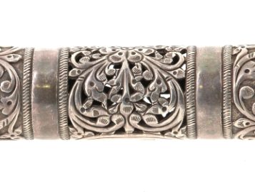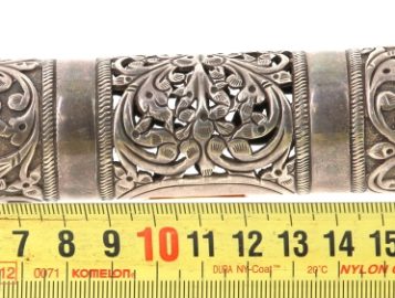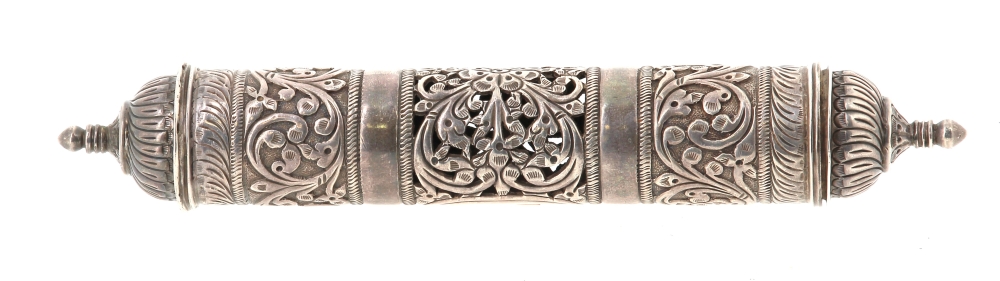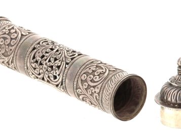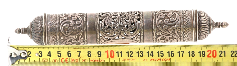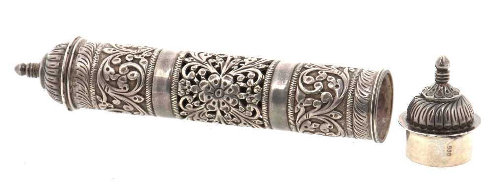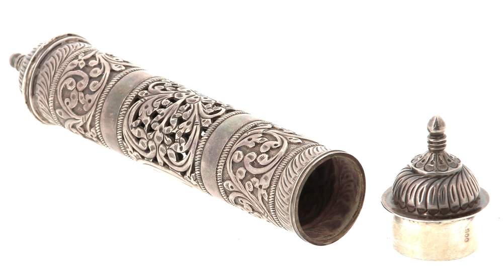 Etui à document tubulaire en argent 900, provenant de Syrie, 1ere moitié XX s.décor de rinceaux fleuris et cartouche. L. 21 cm poids 178,50 grs