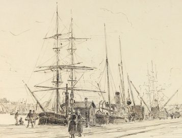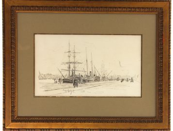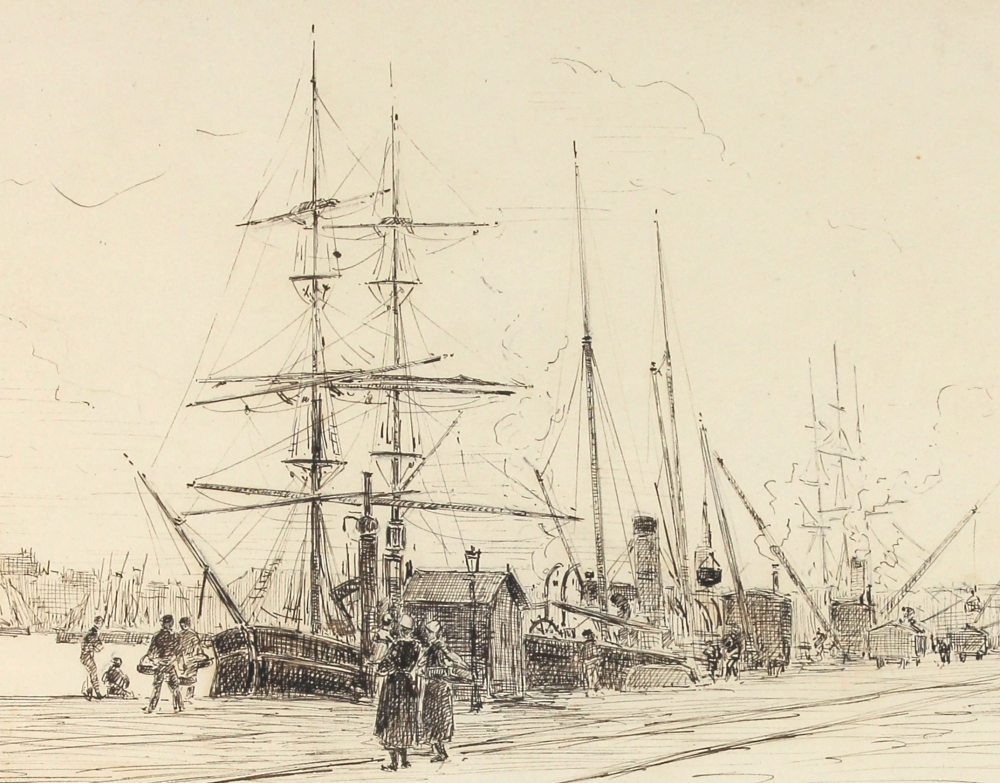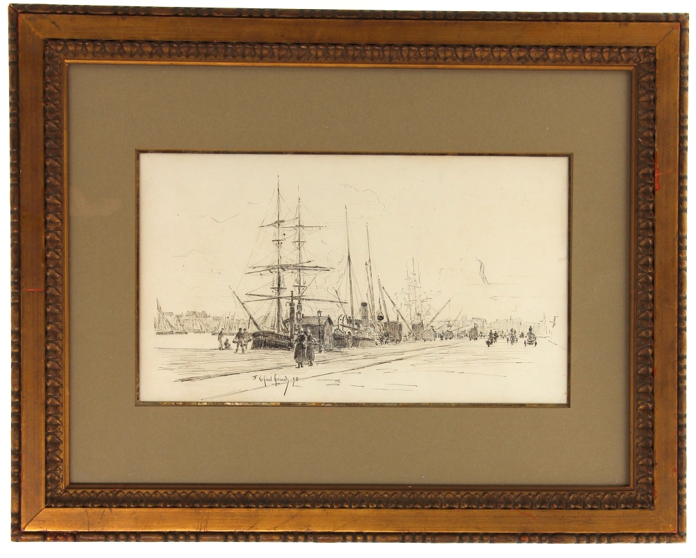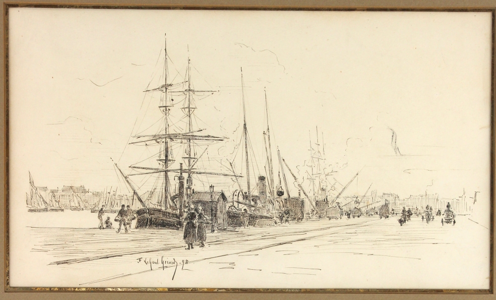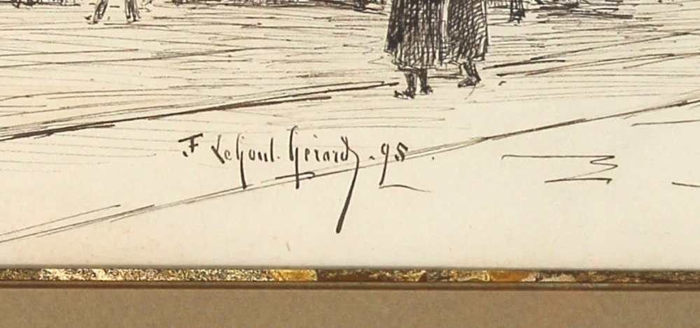 Fernand Marie Eugène LE GOUT-GÉRARD (1856-1924) « Animations sur les quais, Concarneau », dessin à l’encre de chine, signé bas gauche et daté « 95 », 20,5 x 35,5 cm
