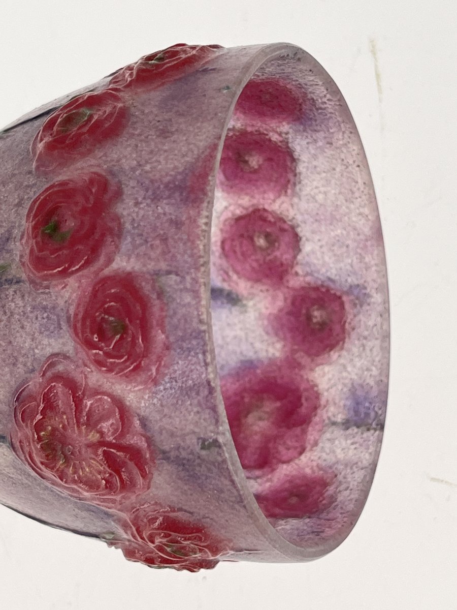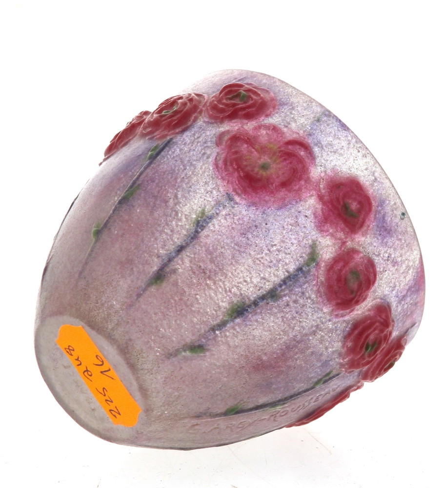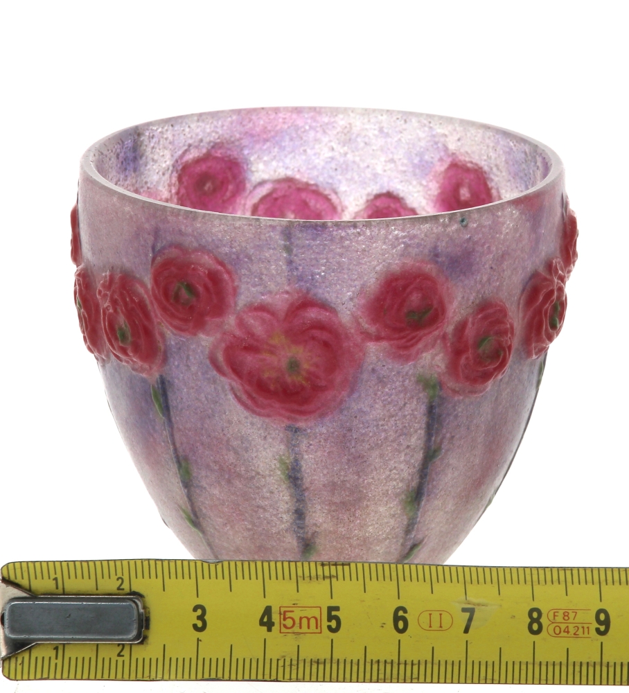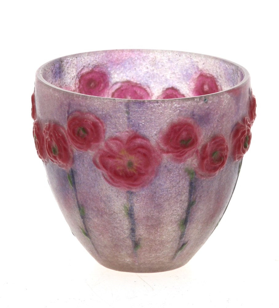 Gabriel ARGY-ROUSSEAU (1885-1953) – Petit vase en pâte de verre à décor polychrome de petites roses sur tige dans les tons rose sur fond lilas. Signé en creux sur le vase, gravé France sous la base. H 7 cm